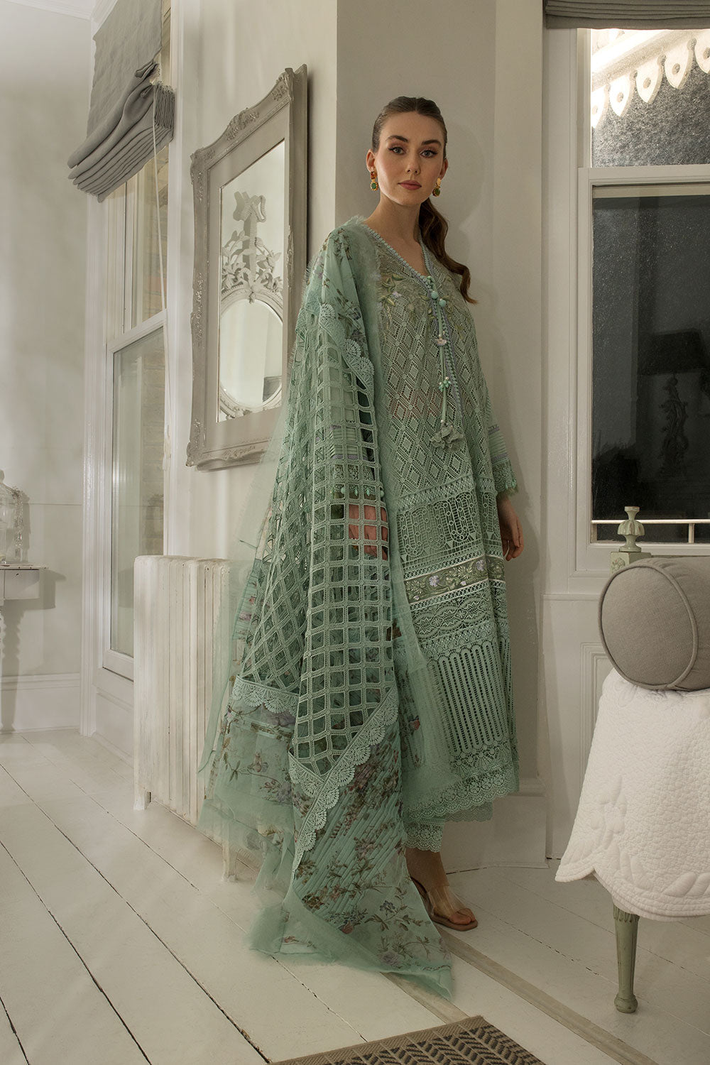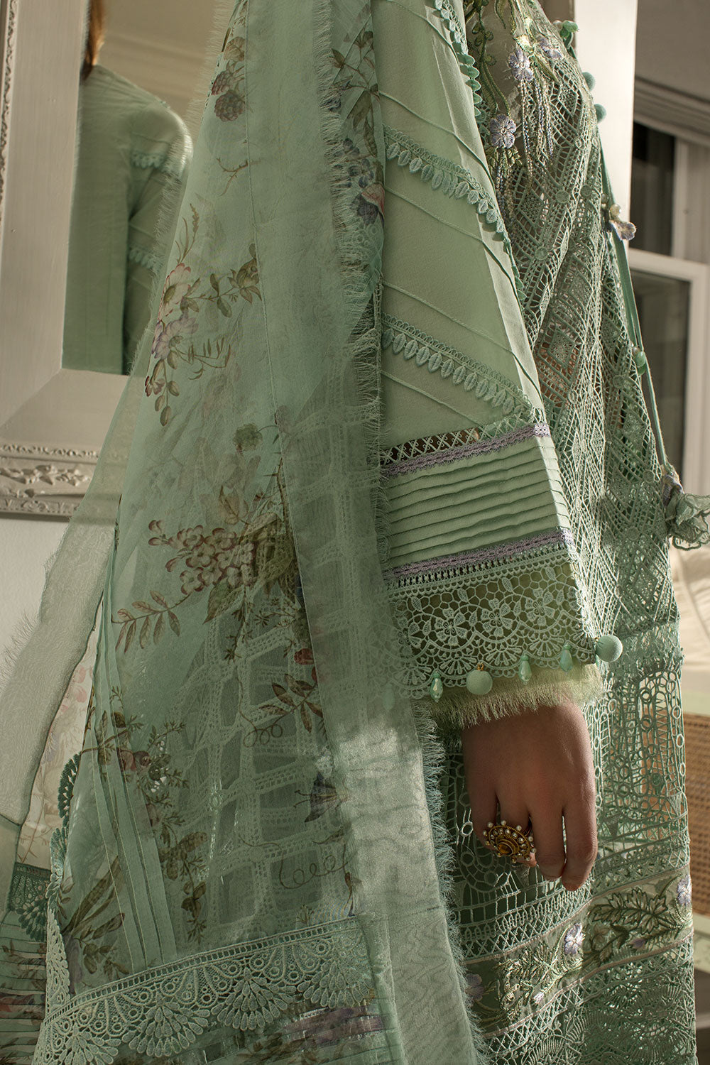 Fabric: Unstitched Suit includes: Shirt Front Lace Front Lace Daman Borders Embroidered Neckline Organza Patches Embroidered Sleeves Organza Border Duppata Center Lace Printed Organza Duppata Plain Dyed Front Lining Plain Dyed Back Plain Dyed Sleeve Plain Dyed Trouser (extra laces, hangings, and accessories are not included) |