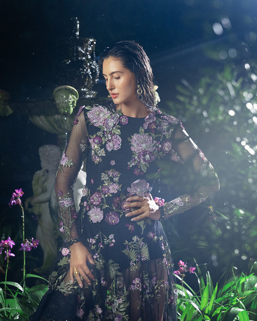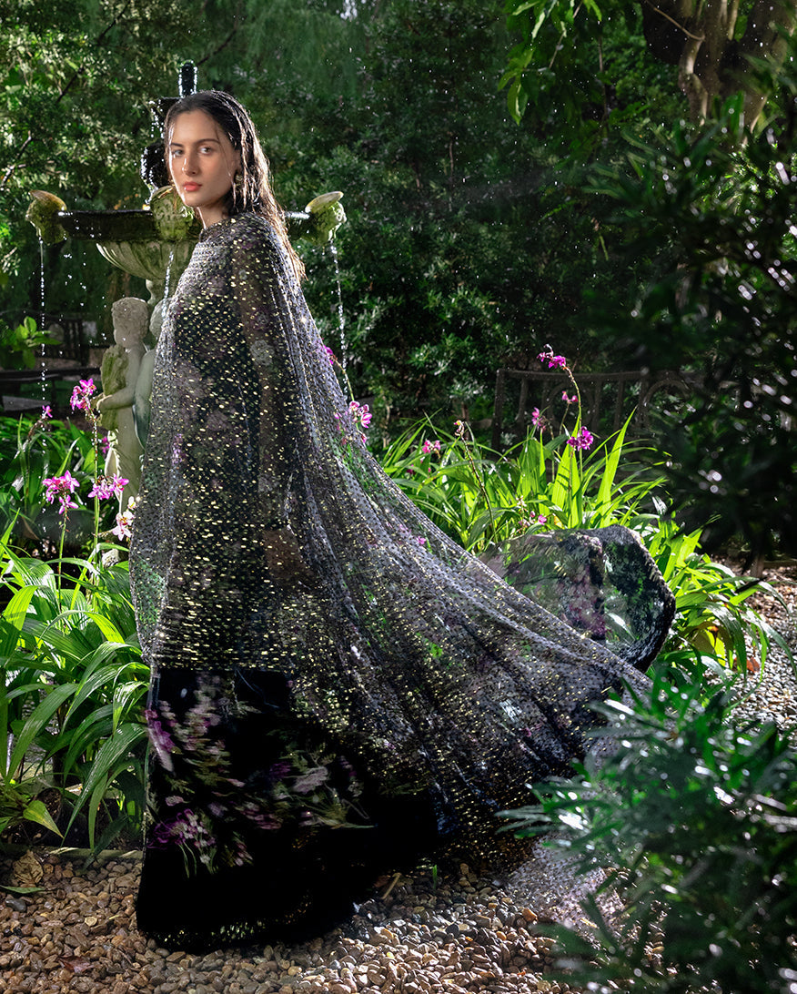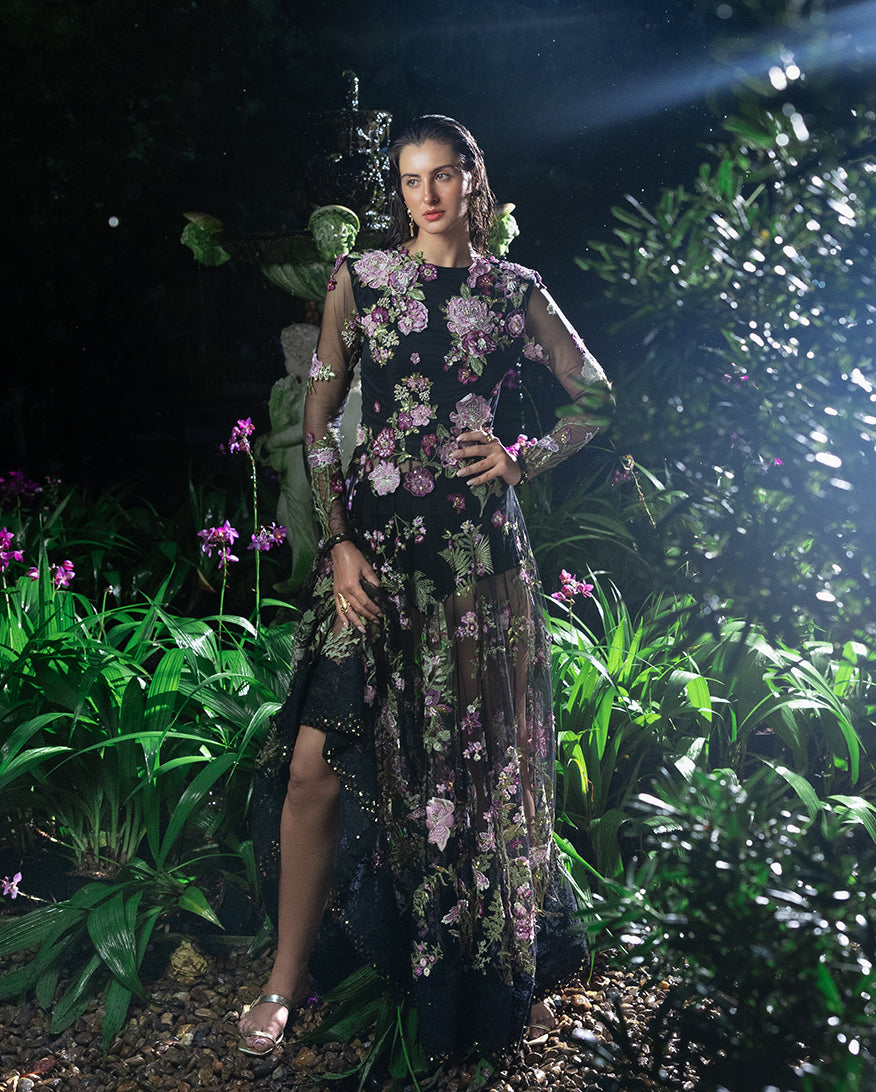Summary: Embrace timeless elegance with the 'Amerie' by Esmel, a luxurious black Pakistani suit designed for grand occasions. Crafted from fine net fabric, this Spring/Summer formal wear features a heavily hand-embellished front yoke and intricate floral embroidery with sequins covering the numerous panels, sleeves, and daman. The flowing silhouette creates a regal look, making this ethnic wear a standout choice for weddings and festive evening galas. This formal Pakistani dress combines traditional craftsmanship with contemporary style, offering an unforgettable ensemble for your most cherished celebrations.