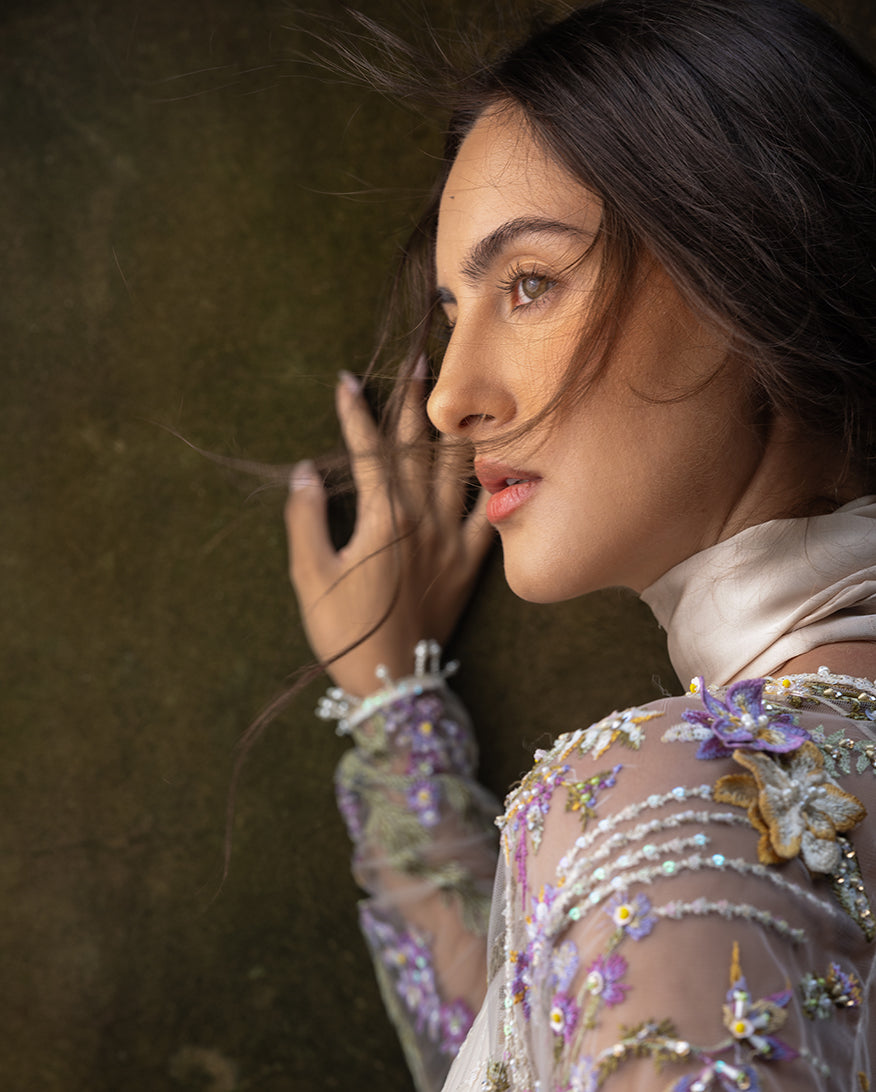 Fabric: Shirt: • Hand-embellished front left panel (net) • Hand-embellished front right panel (net) • Hand-embellished side left panel (net) • Hand-embellished side right panel (net) • Hand-embellished sleeves (net) • Hand-embellished front daman border (net) • Embroidered, sequined back (net) • Embroidered, sequined back daman border (net) • Embroidered, sequined finishing lace (organza) 1 • Embroidered, sequined finishing lace (organza) 2 • Pearls for finishing • Hand-made tassels for sleeves Dupatta: • Sequined net dupatta Trouser: • Printed silk trouser Undershirt: • Dyed undershirt |
