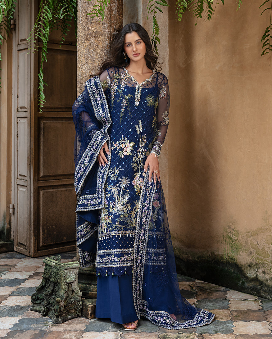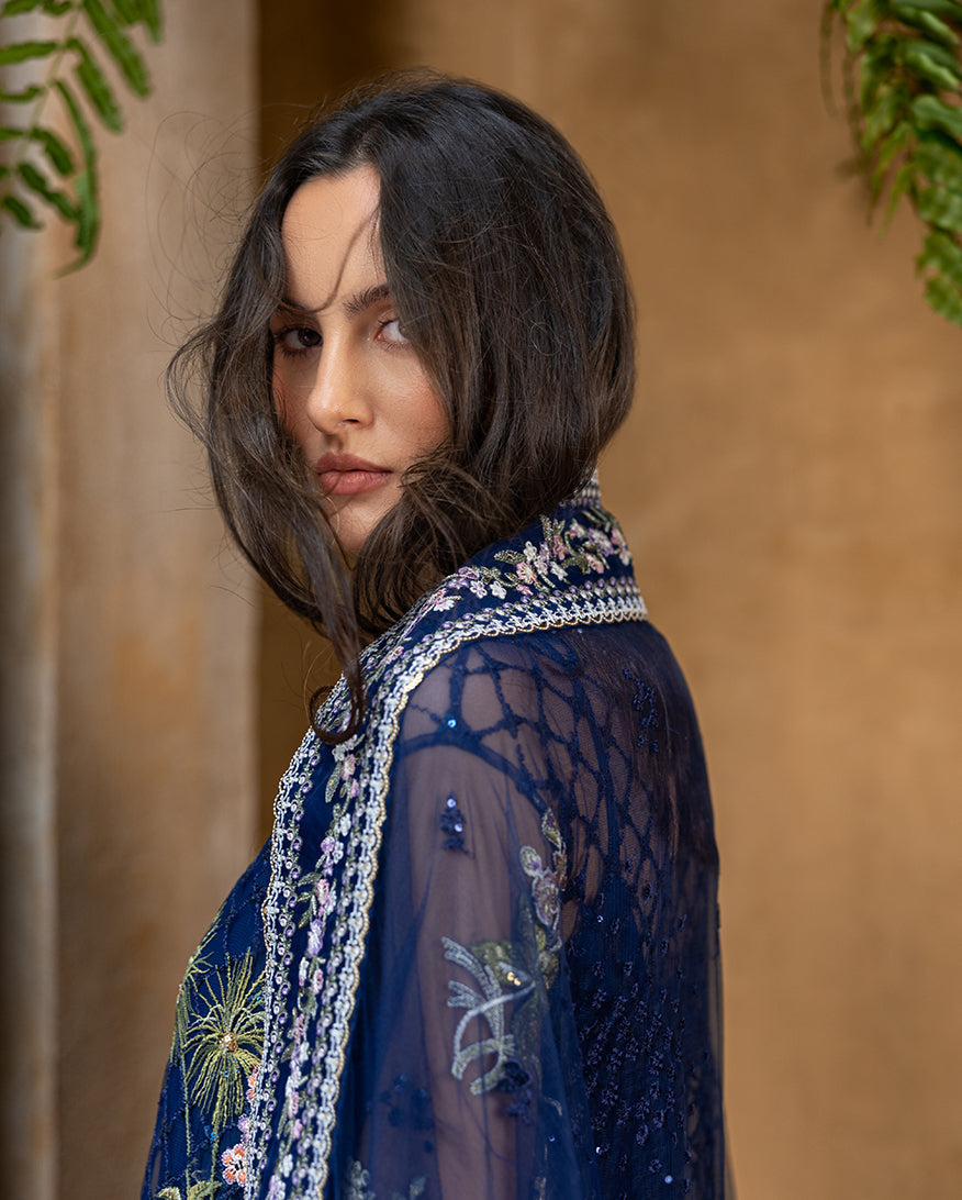 Summary: Embrace regal elegance with the 'Seraine' ensemble from Esmel's La-vie Haute Luxury collection. This exquisite Pakistani suit features a stunning navy blue kameez crafted from delicate net fabric, making it a perfect choice for spring and summer festivities. The shirt is a masterpiece of craftsmanship, with extensive hand-embellishments on the organza neckline and borders, and intricate sequined embroidery across the front, back, and sleeves. Paired with a matching sequined net dupatta, this formal wear outfit exudes sophistication and grace. Ideal for wedding wear or any grand celebration, this dress promises a memorable and glamorous appearance.