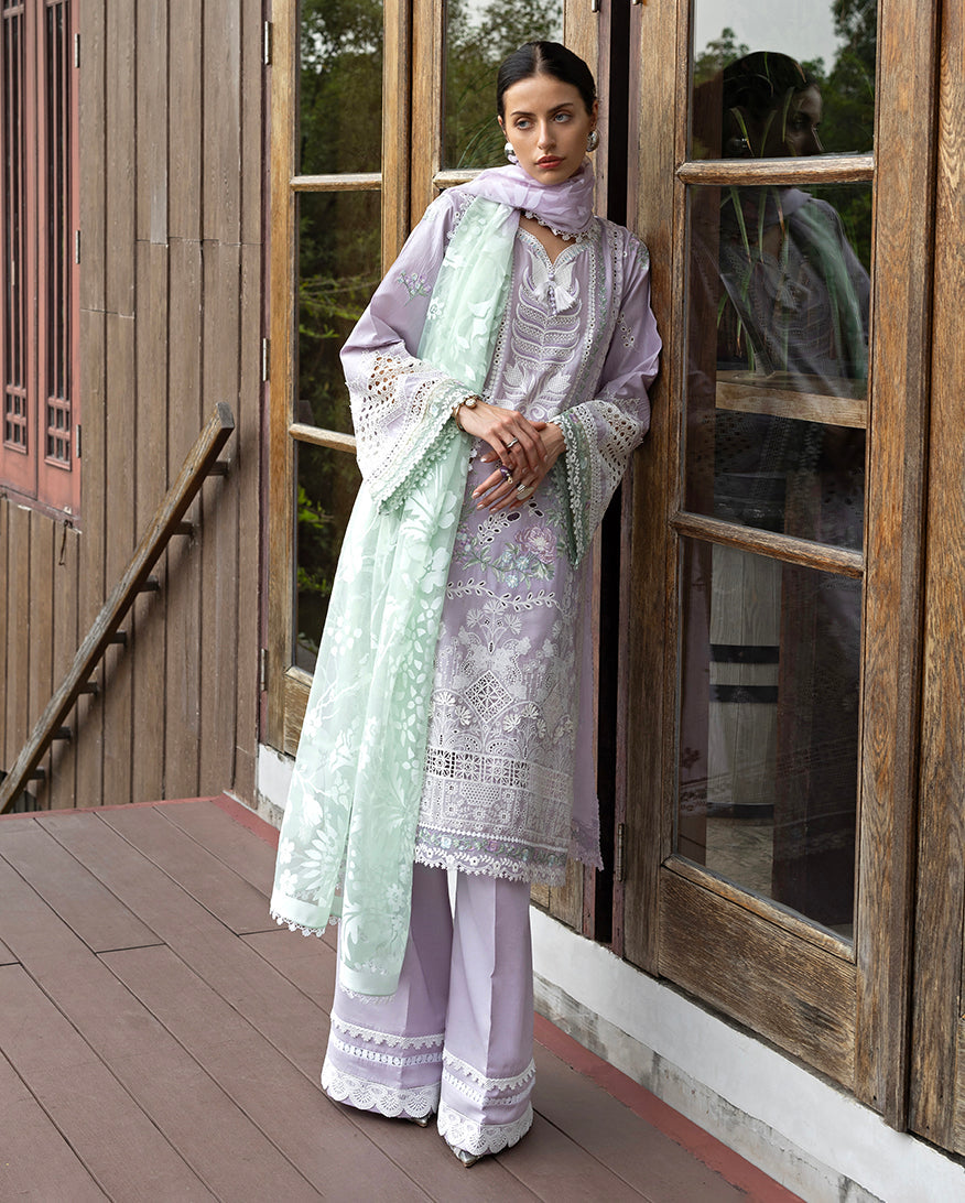 Summary: Step into sophistication with the Esmel 'Lila' Pakistani Suit, a vision in a delicate lavender hue. This formal wear is crafted from premium lawn, a breathable fabric perfect for Spring/Summer elegance. The kameez is a work of art, intricately detailed with classic chikankari embroidery across the front, back, and sleeves. Luxurious organza and crochet lace accents, along with handmade tassels at the neckline, add a touch of grace. This stunning Pakistani Lawn Dress is an impeccable choice for Eid festivities, daytime weddings, and other formal gatherings, offering a blend of traditional craftsmanship and contemporary style.