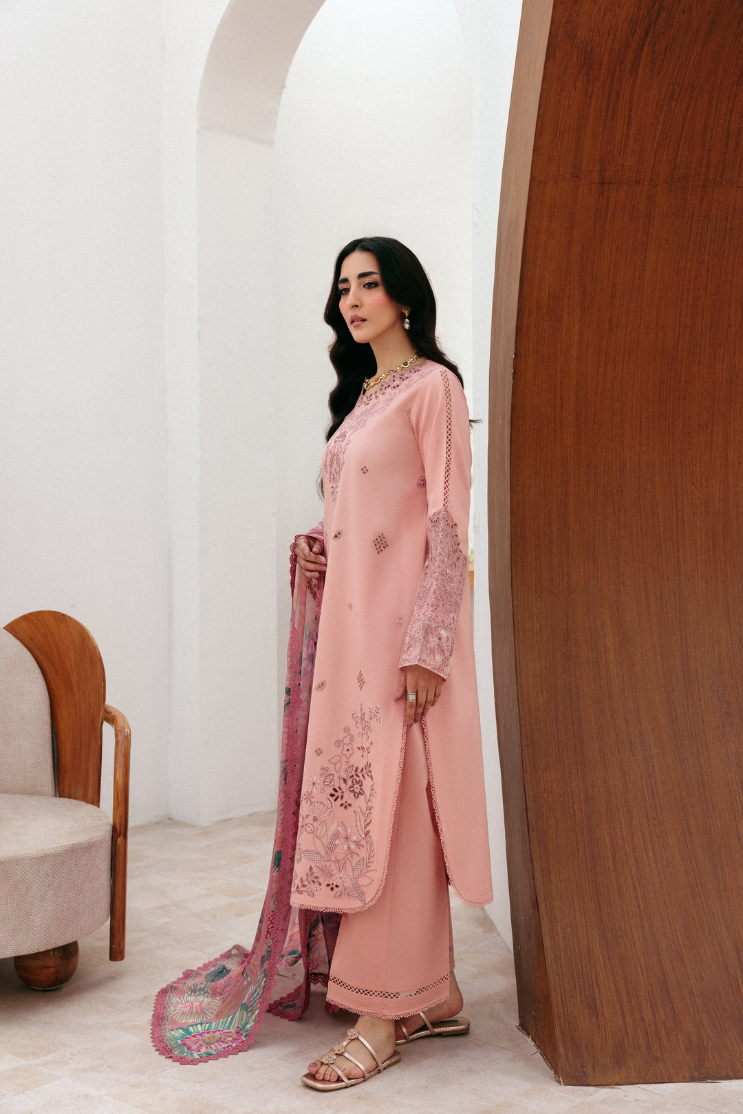 Summary: Step into summer with this exquisite pink Pakistani Lawn Suit from the Florent collection. This unstitched ethnic wear is crafted from premium lawn, a lightweight and breathable fabric perfect for warm weather. The kameez features delicate, tone-on-tone embroidery on the front panel and intricate motifs on the sleeves, lending it a touch of formal elegance. As a versatile Pakistani summer dress, it combines traditional artistry with contemporary style. This sophisticated festive outfit is an ideal choice for Eid celebrations, daytime parties, or any formal gathering, ensuring you look graceful and feel comfortable.
