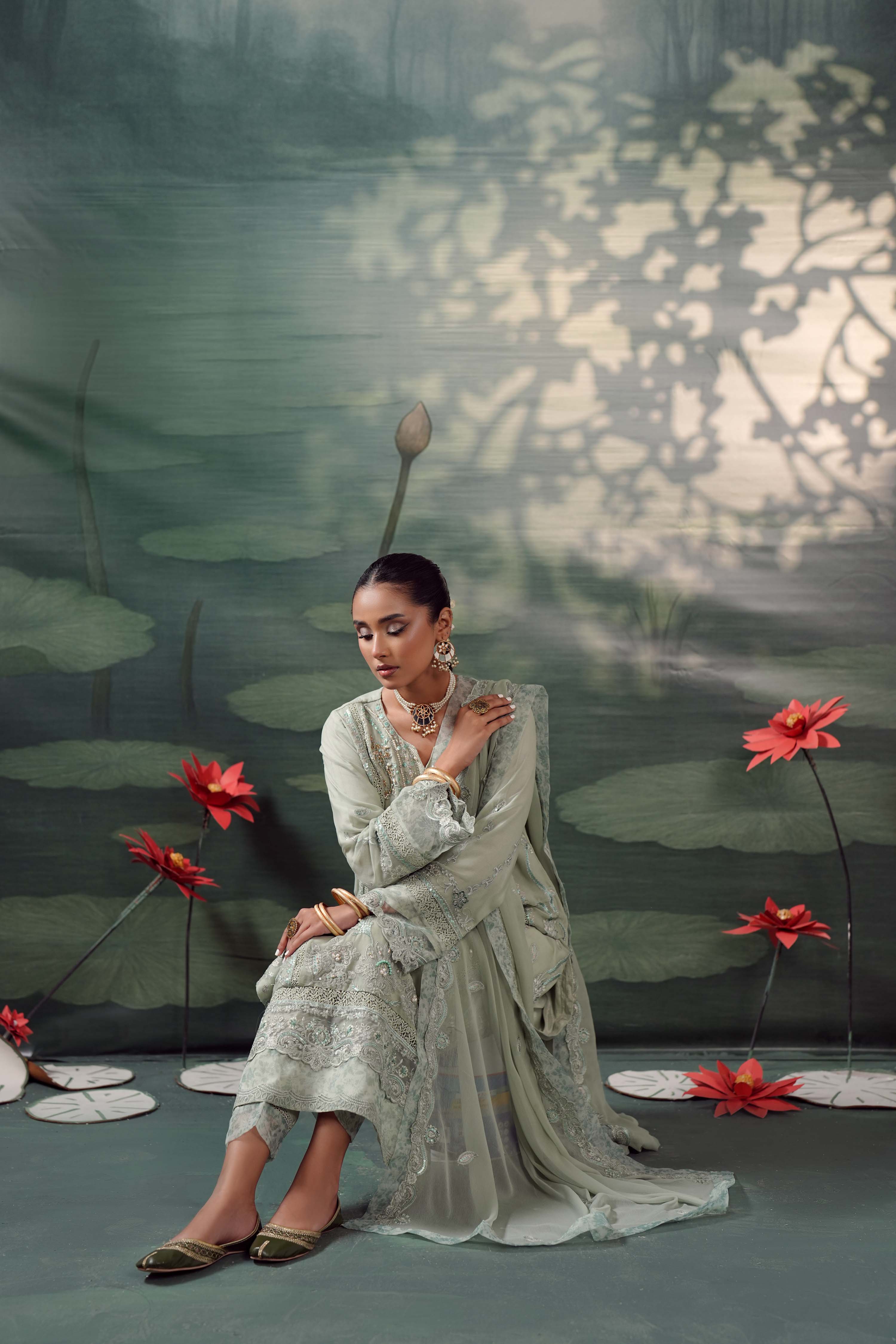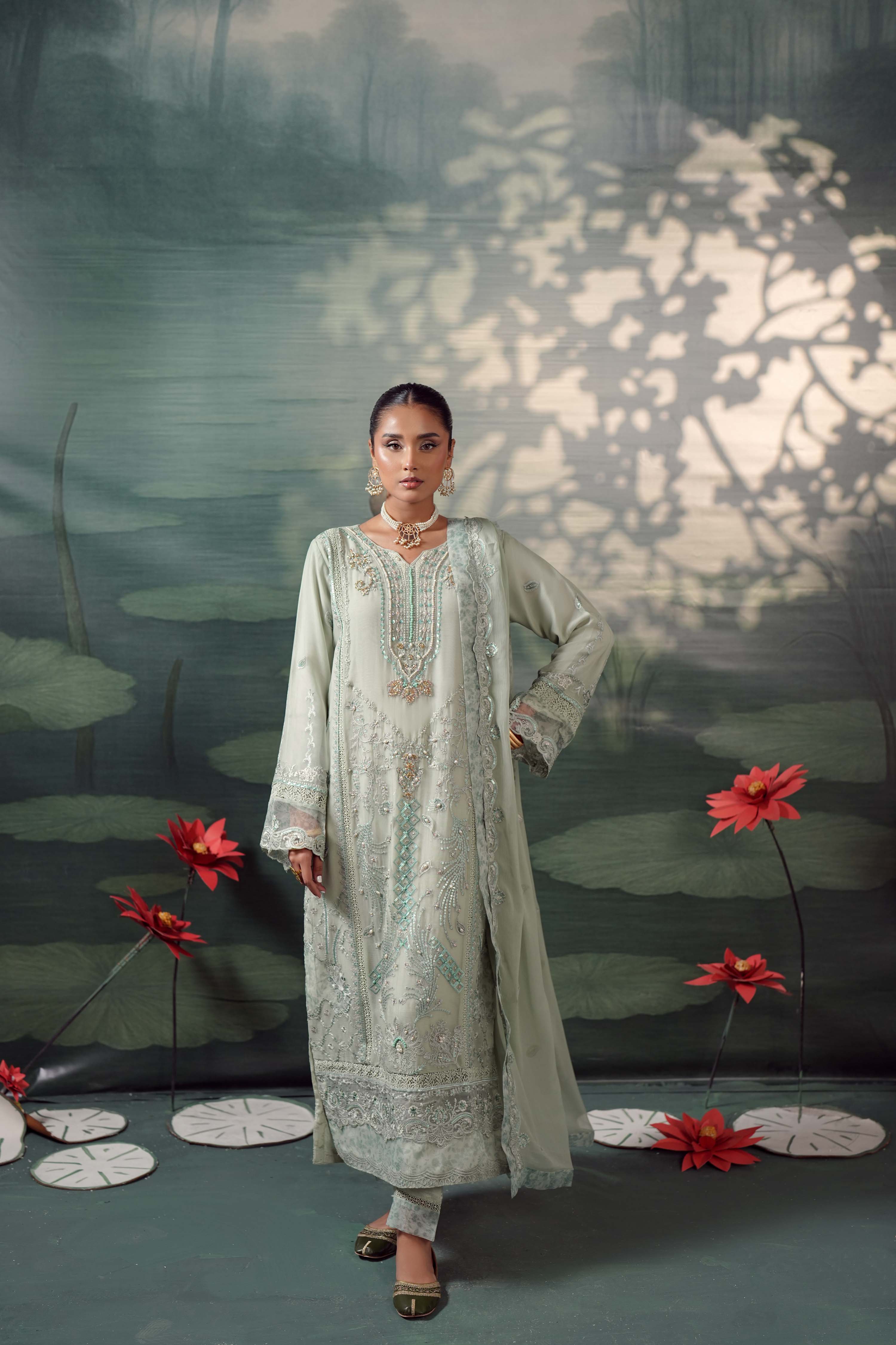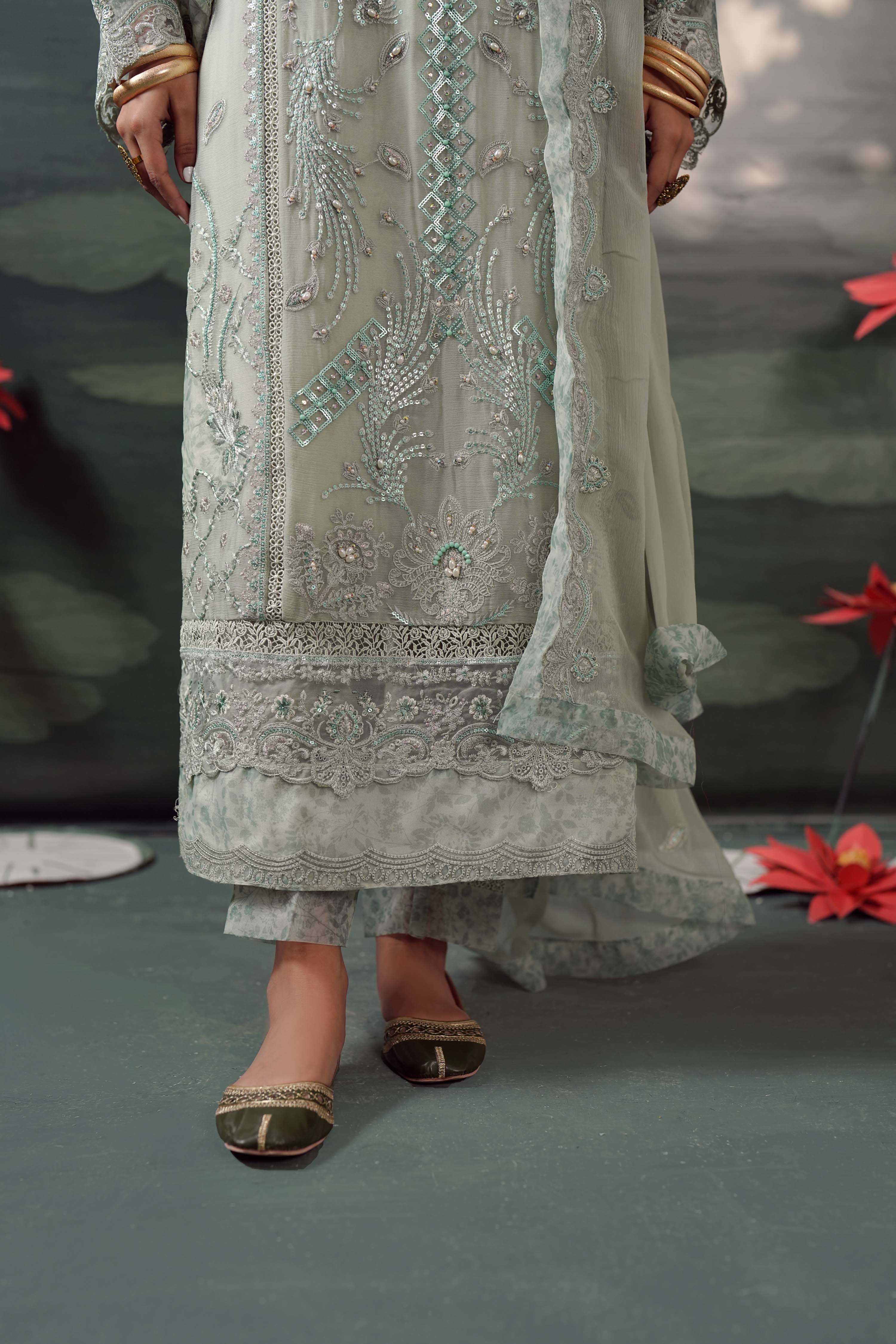 Summary: Embrace ethereal charm with the Guzel Silvaana 'Alva', a luxury Sea Green Pakistani Chiffon Suit designed for the modern fashionista. This exquisite kameez features rich embroidery, intricate neck handwork, and stylish cutwork sleeves accented with printed organza patches. Lined with soft viscose, the airy chiffon fabric makes it a quintessential choice for Spring/Summer formal wear. Ideal for wedding guests, Eid festivities, or elegant evening parties, this ready-to-wear formal pret outfit radiates sophistication. Elevate your ethnic wardrobe with this stunning ensemble that balances traditional artistry with contemporary style. Shop this graceful Pakistani formal dress online.
