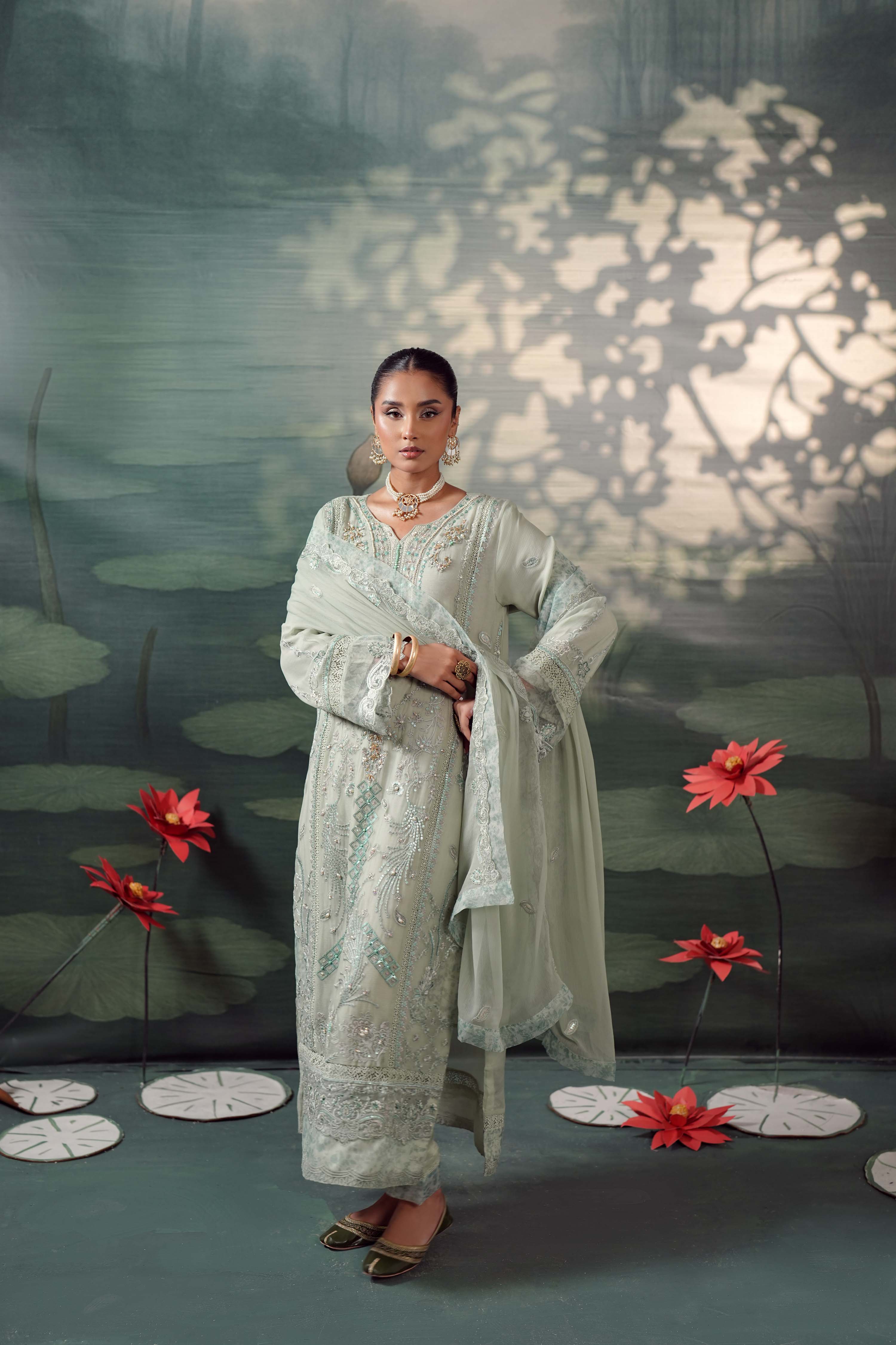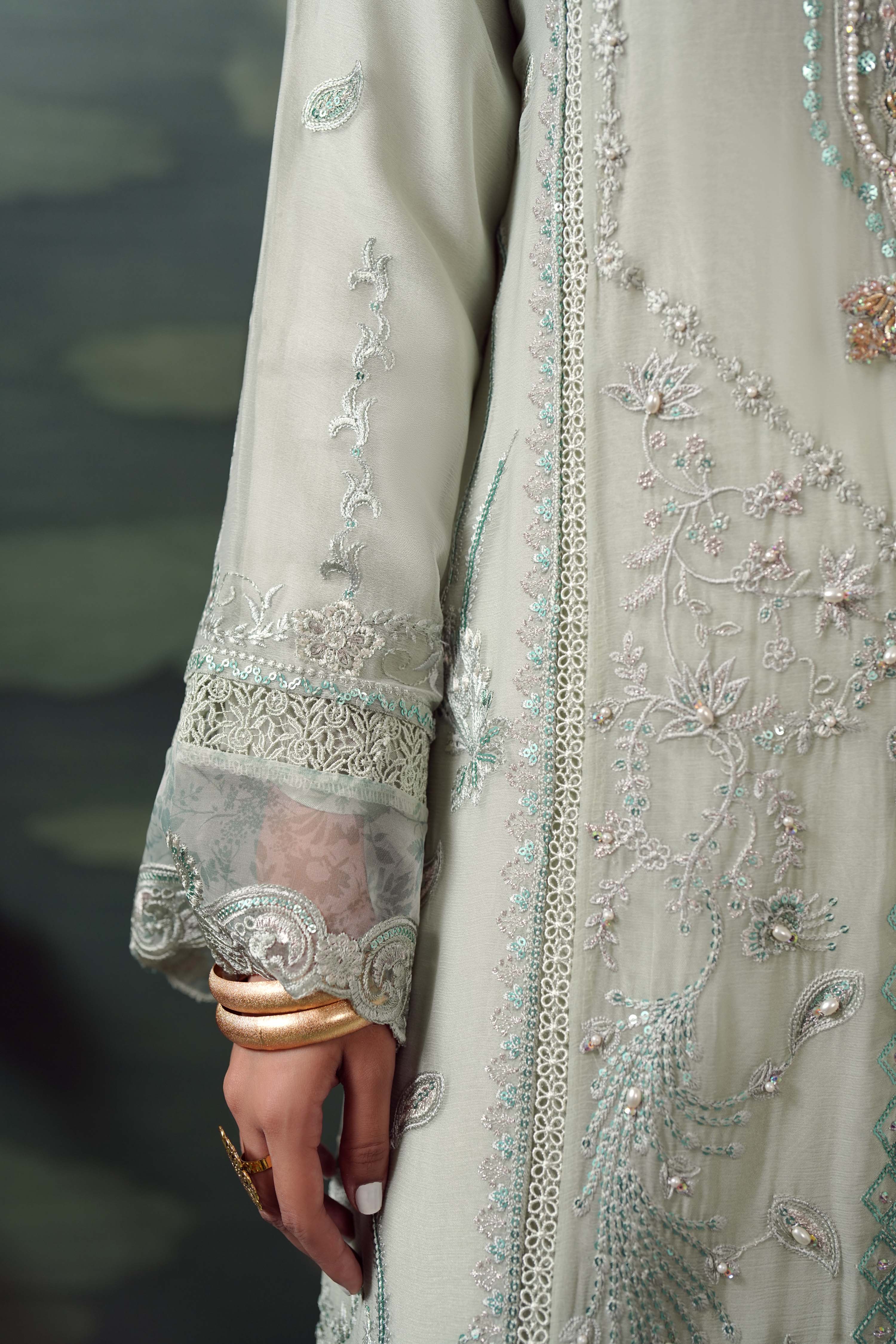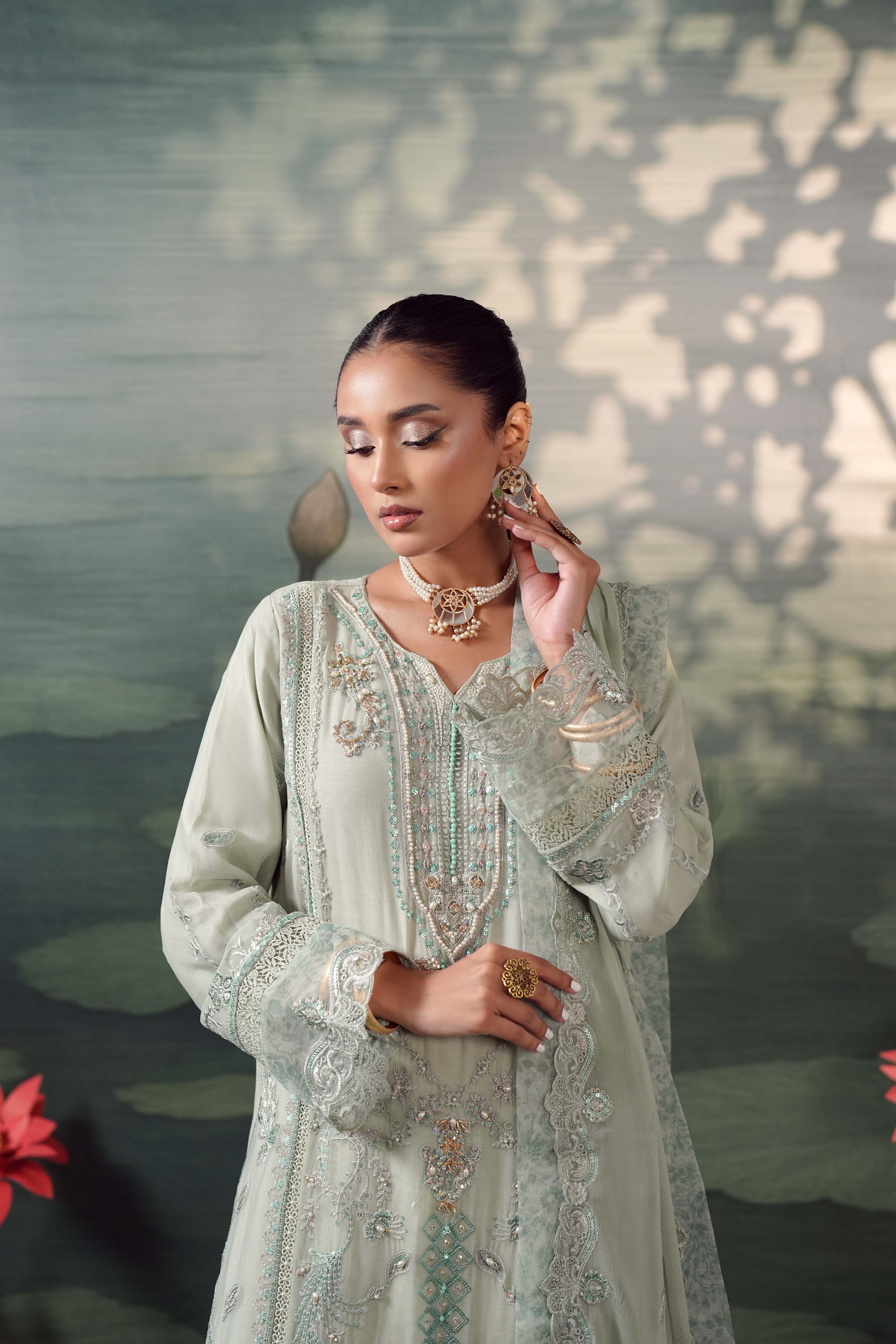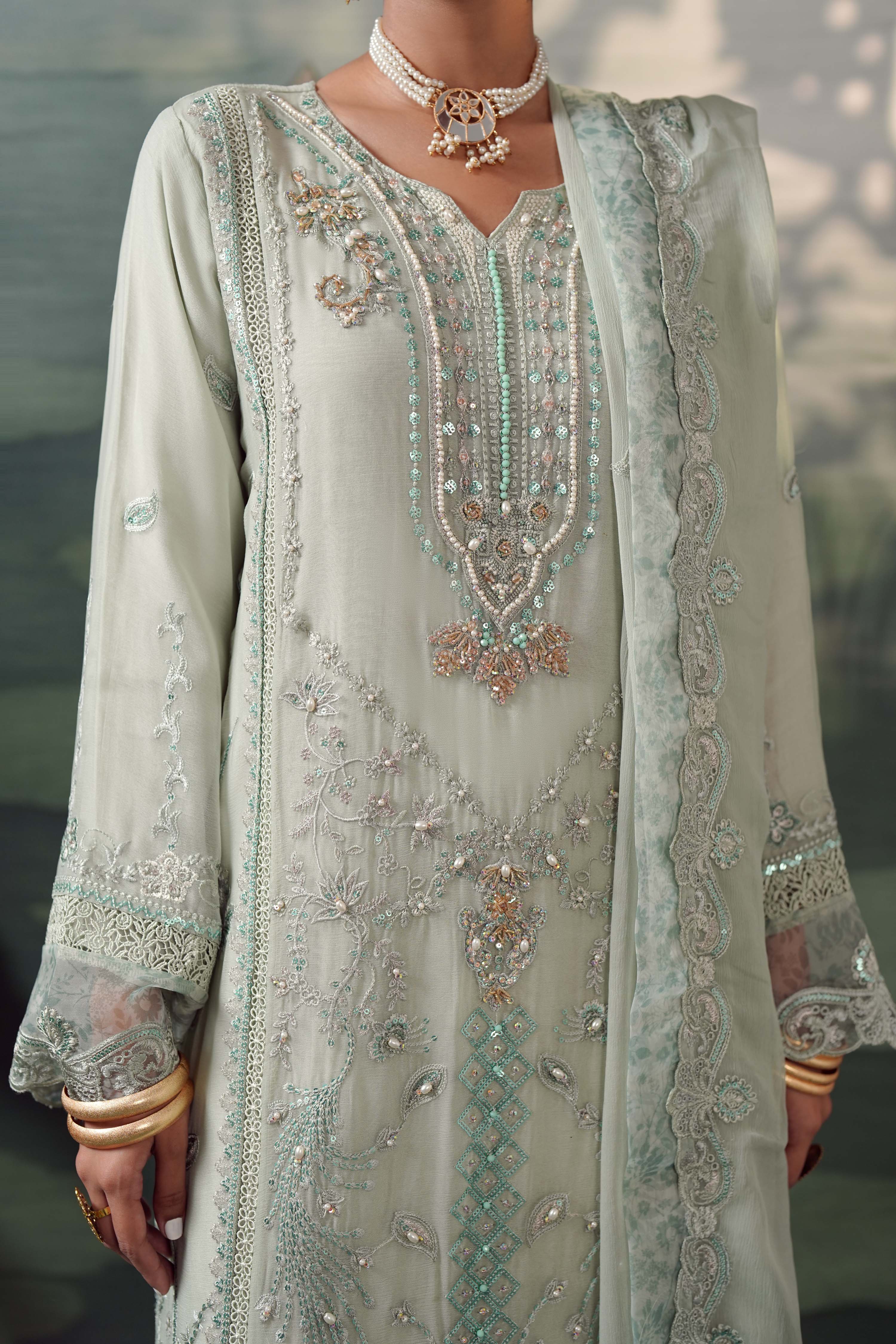 Summary: Embrace ethereal charm with the Guzel Silvaana 'Alva', a luxury Sea Green Pakistani Chiffon Suit designed for the modern fashionista. This exquisite kameez features rich embroidery, intricate neck handwork, and stylish cutwork sleeves accented with printed organza patches. Lined with soft viscose, the airy chiffon fabric makes it a quintessential choice for Spring/Summer formal wear. Ideal for wedding guests, Eid festivities, or elegant evening parties, this ready-to-wear formal pret outfit radiates sophistication. Elevate your ethnic wardrobe with this stunning ensemble that balances traditional artistry with contemporary style. Shop this graceful Pakistani formal dress online.