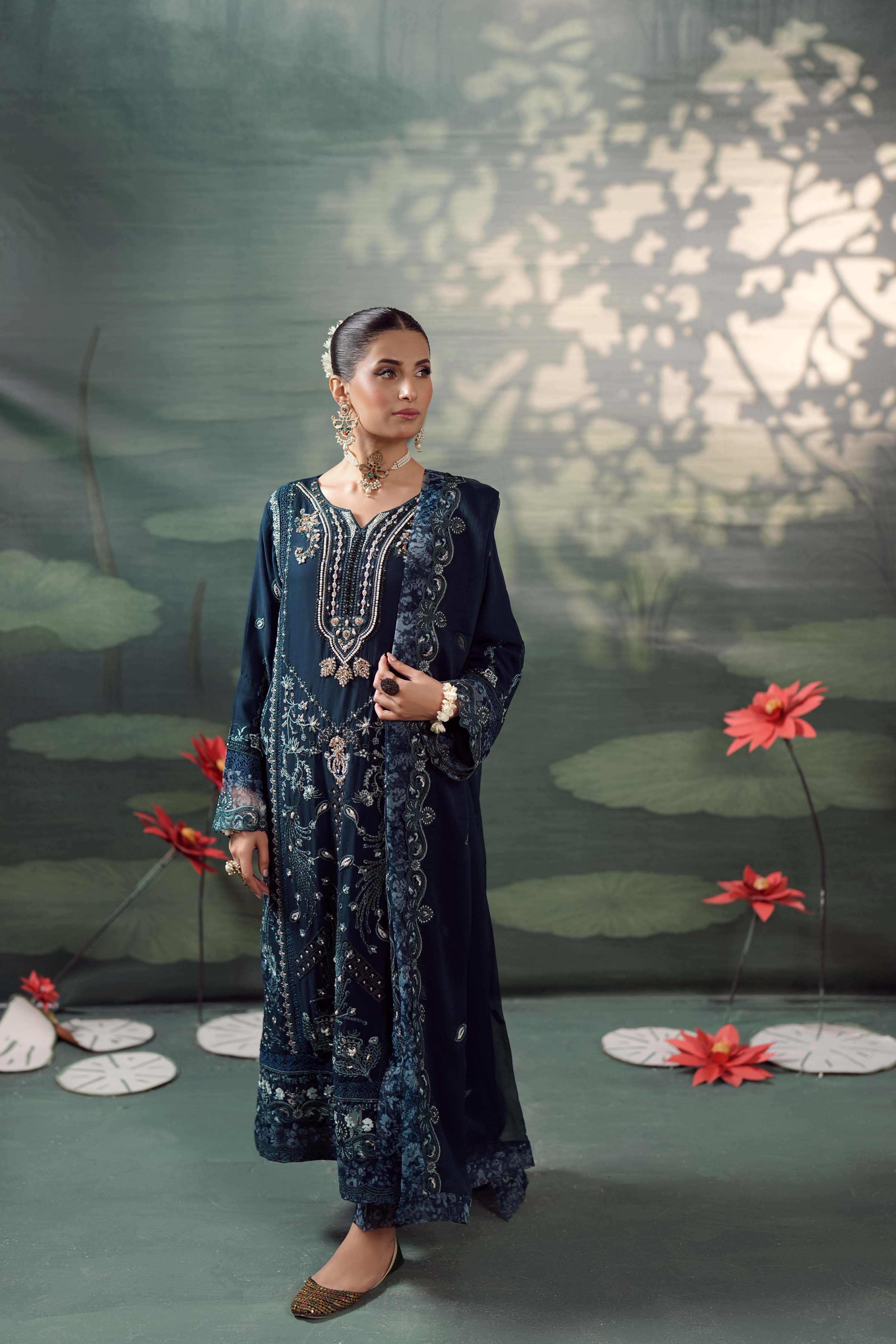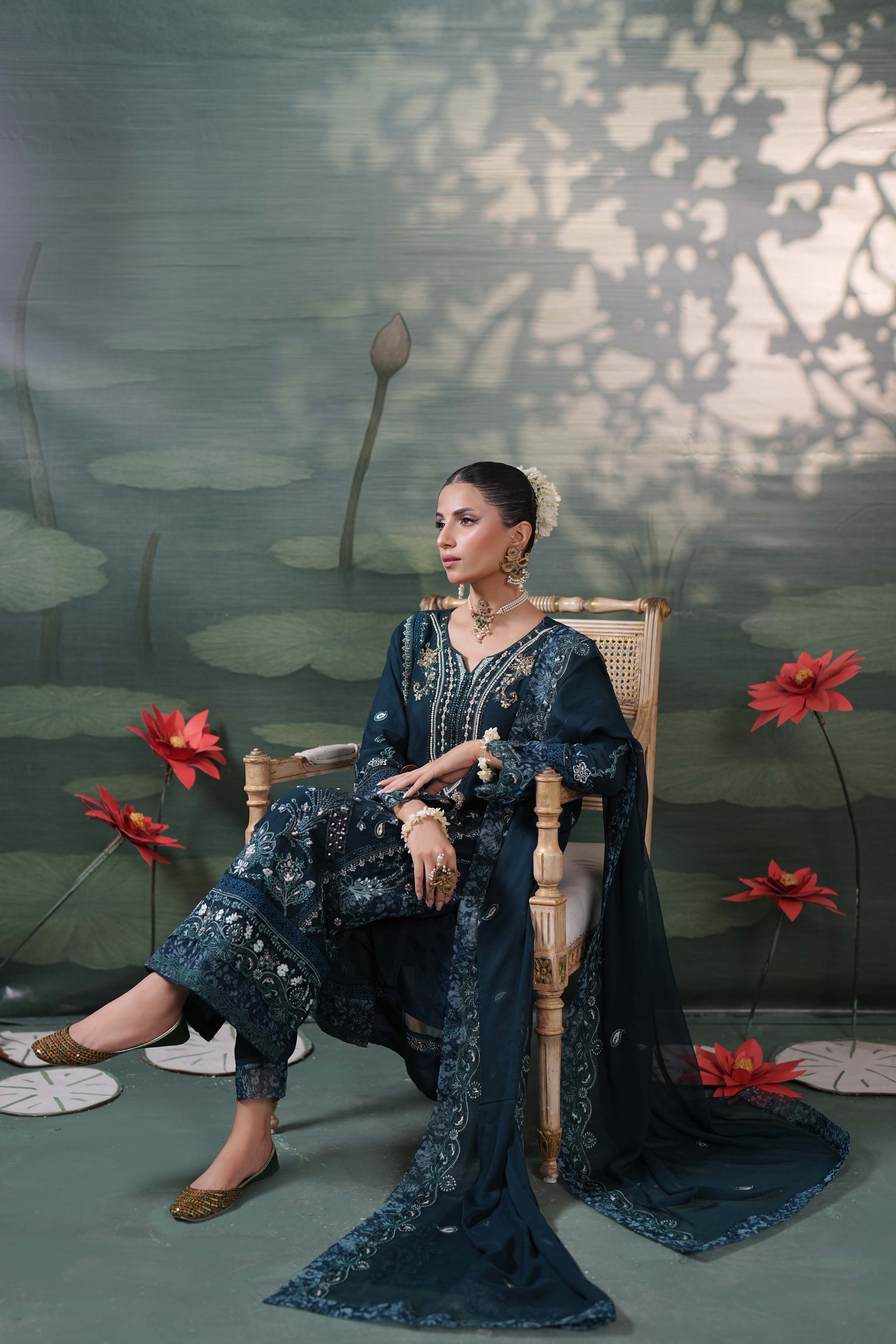 Fabric: Luxury Chiffon 3-Piece Embroidered Suit Shirt: Made from richly embroidered chiffon, this shirt features detailed neck handwork, delicate lacework, cutwork, and a printed organza patch, paired with a soft viscose inner for added finesse and comfort. Dupatta: The matching chiffon dupatta is gracefully finished with fine embroidery, cutwork, and a striking four-sided printed organza border, adding sophistication to every drape. Trousers: Tailored from premium viscose, the trousers are beautifully embroidered and enhanced with lacework and printed organza at the hem for a polished finish. Silvaana — where grace meets the glow of celebration. Make every occasion memorable with Silvaana. |