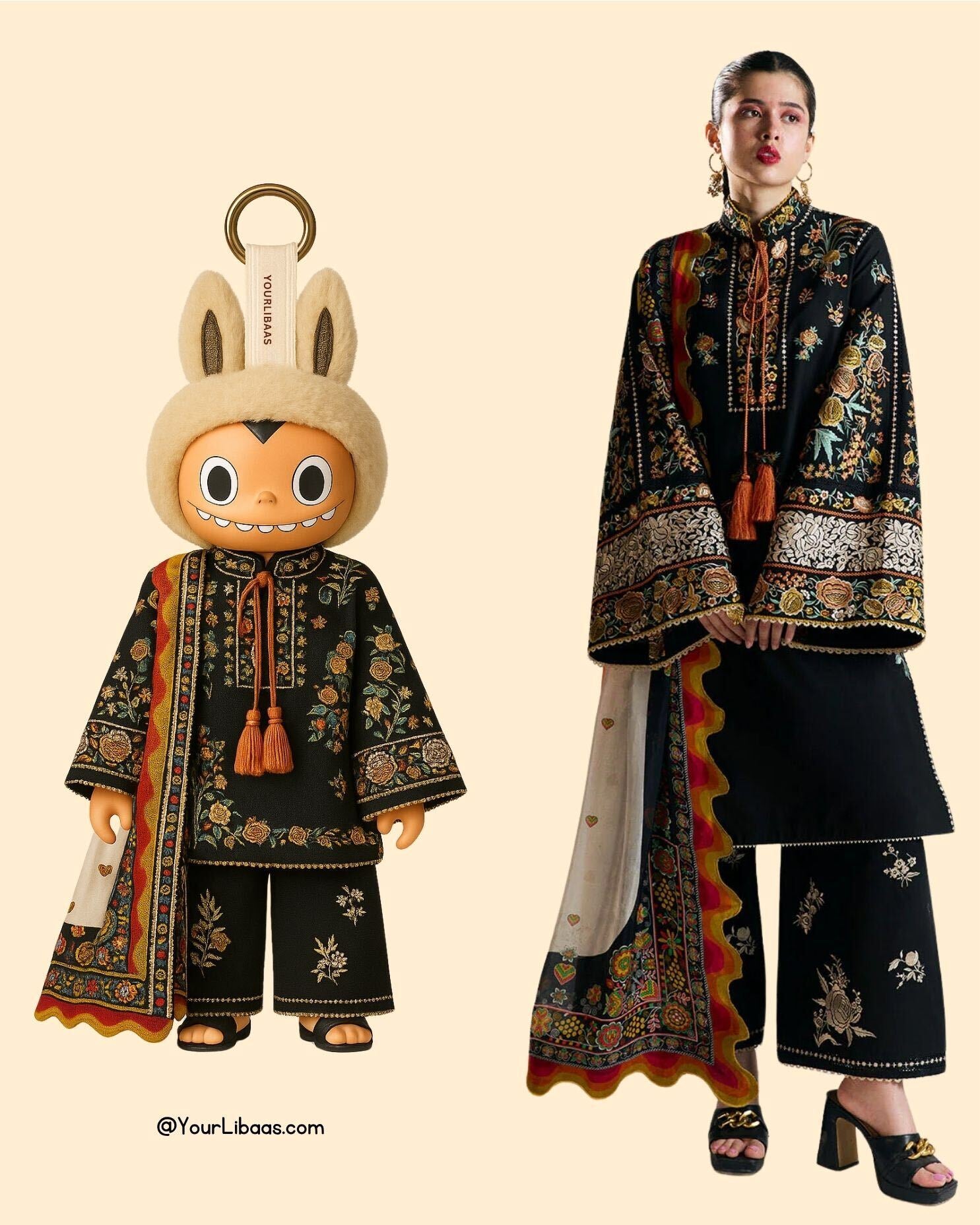 Fabric: Color: Black Fabric: Cotton shirt & trouser, Silk Dupatta Package Includes: 3pcs Shirt, Trouser & Dupatta Description: This striking ensemble is all about bold contrasts and rich cultural detail. The black shirt is brought to life with vibrant multicolor Ghara embroidery, adding depth and tradition to its classic straight silhouette. Its wide sleeves are intricately worked, offering an artisanal feel that’s both grounded and eye-catching. Paired with black culottes, the monochrome floral embroidery at the hem adds a subtle, elegant touch. The outfit is tied together with a digitally printed silk dupatta — vivid, eclectic, and full of character — with traditional motifs and a playful color palette that adds movement and flair. This ensemble blends heritage craft with a modern, confident edge. Fabric Details in Meters: (Unstitched): Digital Printed Dupatta (Silk) 2.50 Meters Embroidered Front Center Panel (Cotton) 0.66 Meters Dyed Back & Front Side Extensions (Cotton) 1.00 Meters Embroidered Sleeves Panel Right Left & Slv Border (Cotton) 0.66 Meters Embroidered Sleeves Border (Cotton) 1.30 Meters Embroidered Slv+ Arm-Hole+Side Extensions Border (Cotton) 7.00 Meters Embroidered Front Back Side Motifs (Cotton) 4.00 Pieces Embroidered Back Motif (Cotton) 1.00 Piece Embroidered Trouser (Cotton) 2.00 Meters Embroidered Neckline Ban 1.00 Piece |