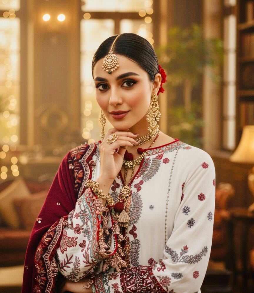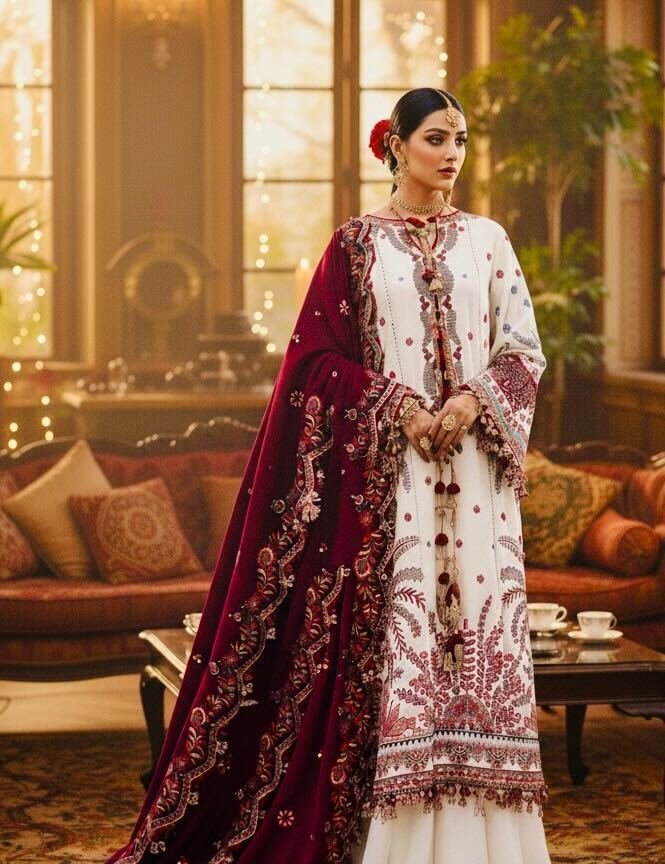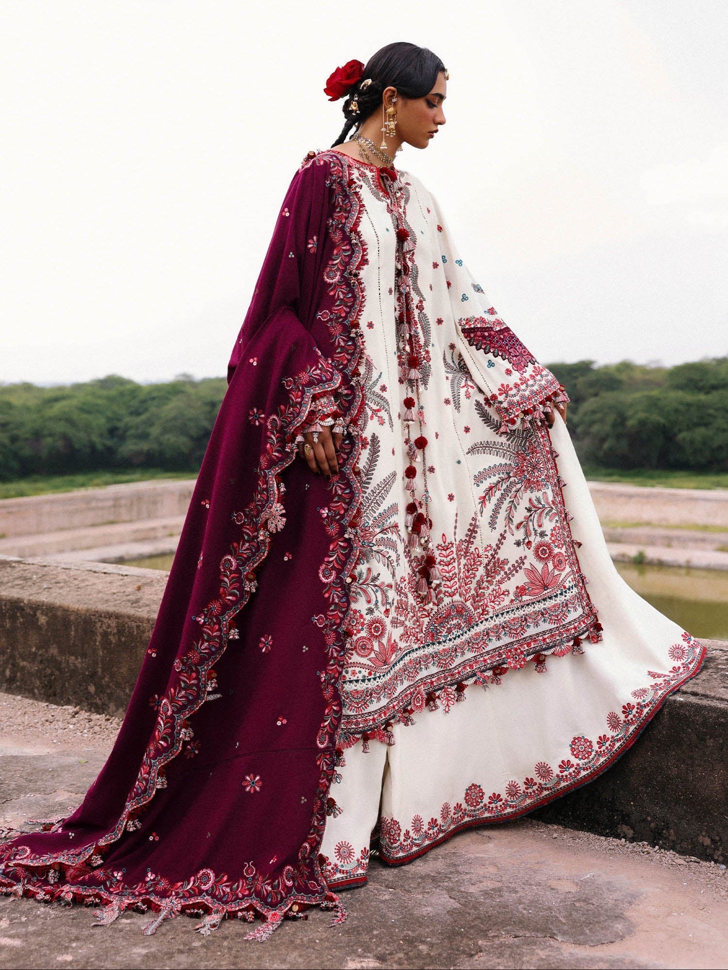 Summary: Experience timeless elegance with the Hussain Rehar 'Afsaneh' winter suit. This formal wear masterpiece is crafted in a sophisticated off-white hue from luxurious karandi fabric, ideal for the colder season. The shirt is a canvas of intricate, delicate embroidery and exquisite borring details, presenting a look of refined grace. As a classic Pakistani suit, its warm fabric and detailed craftsmanship make it a perfect choice for weddings, festive gatherings, and formal parties. This ethnic wear ensemble is designed for those who appreciate captivating style and traditional artistry in their winter wardrobe.