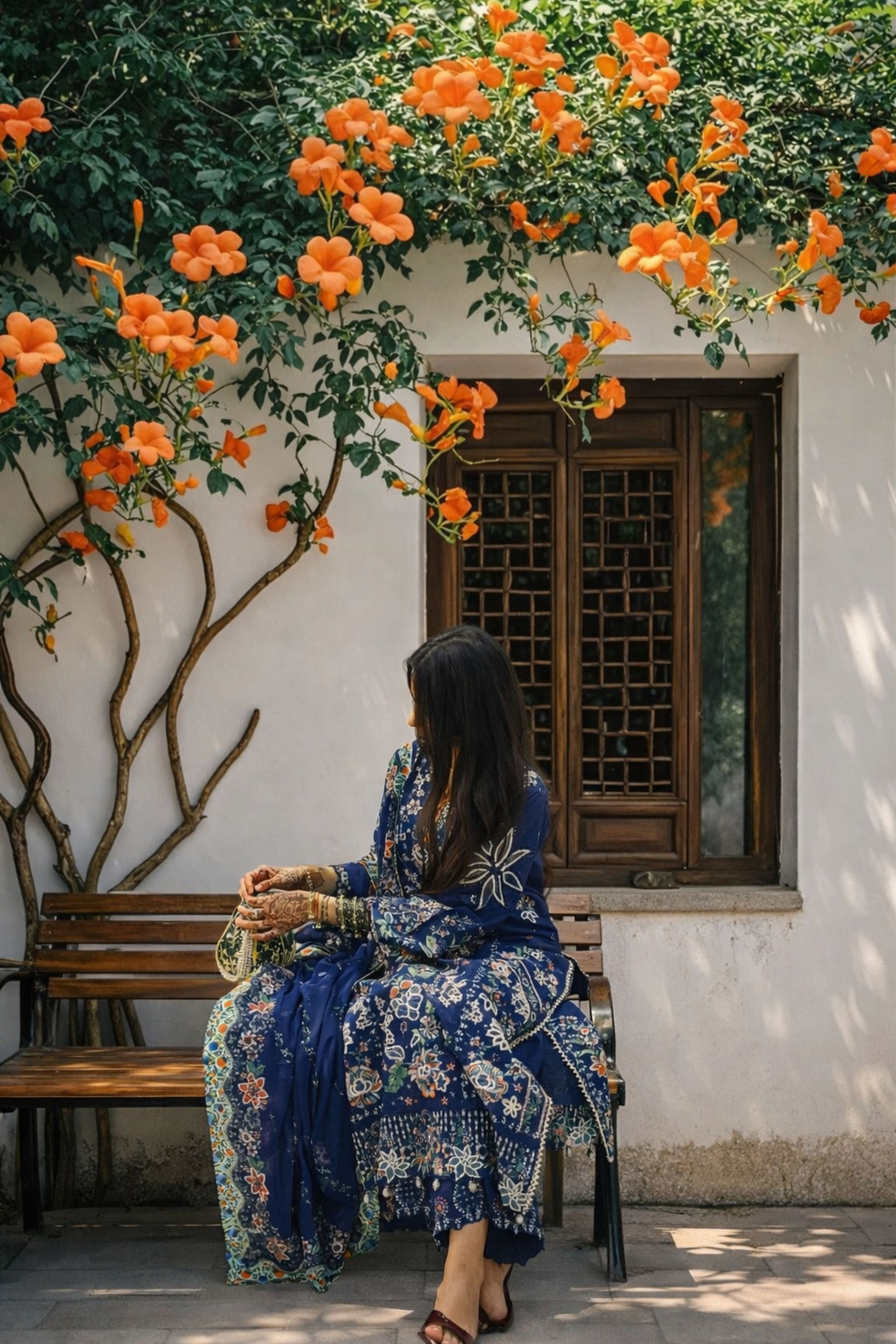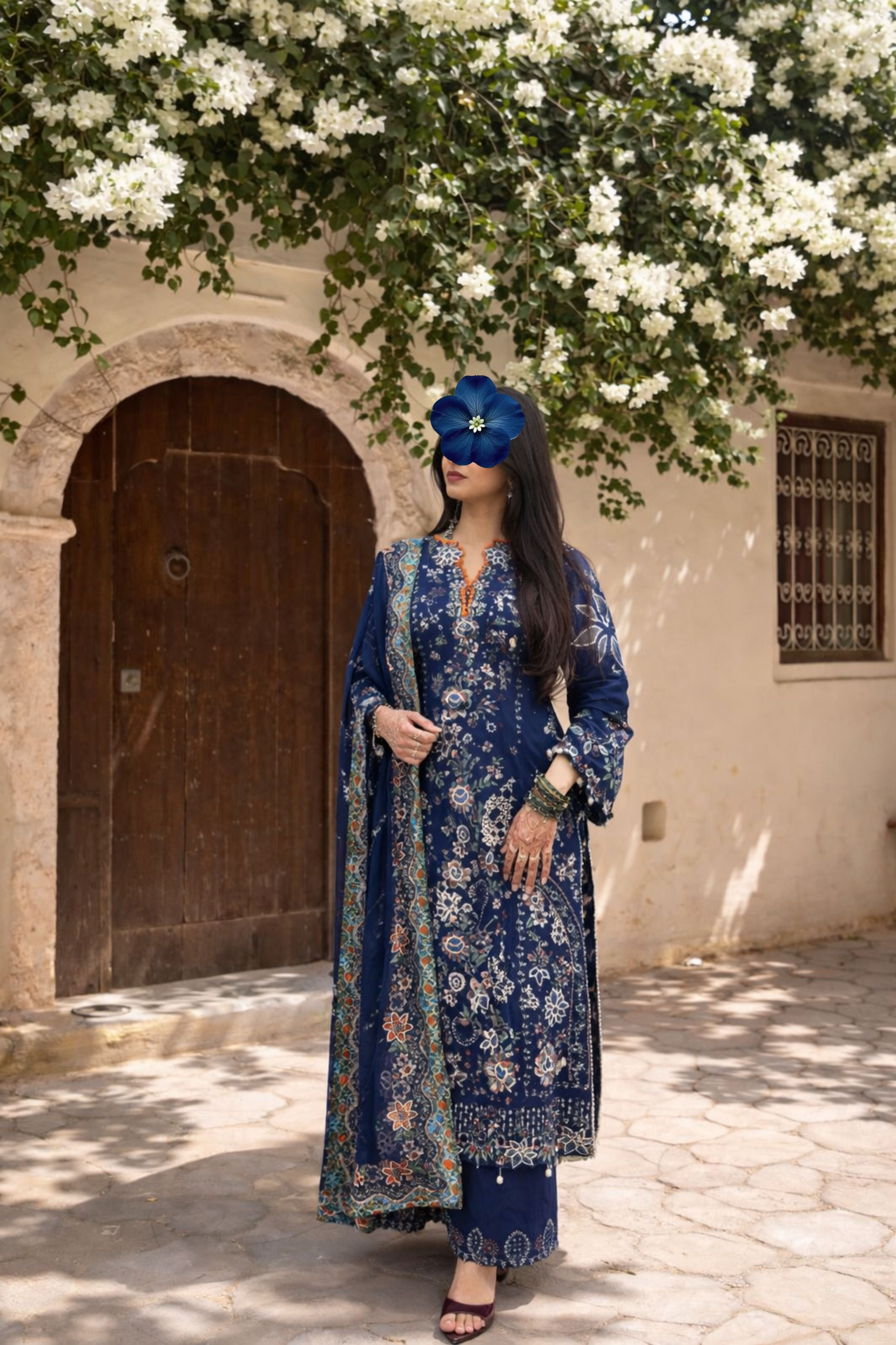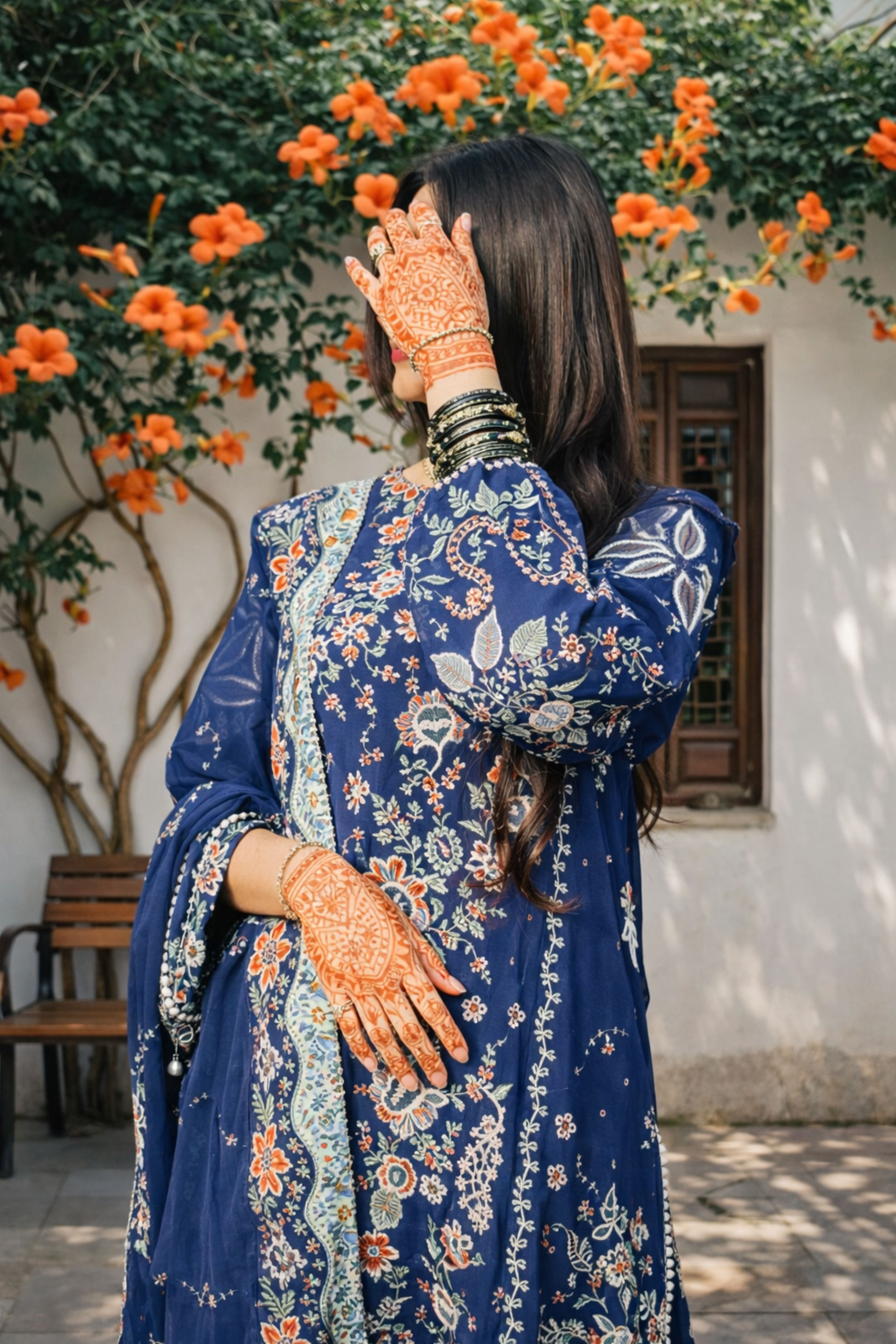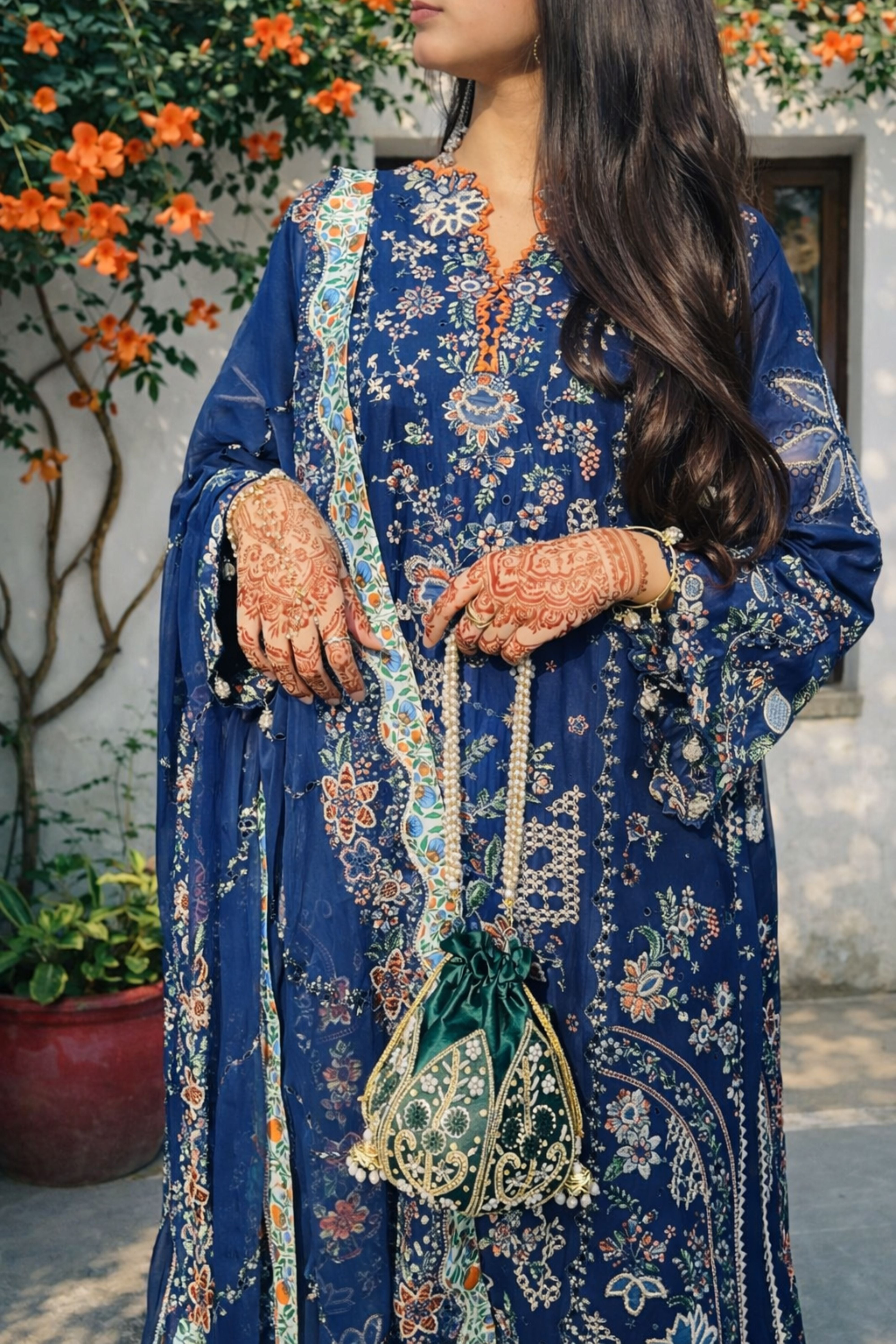 Summary: Embrace timeless sophistication with this exquisite Navy Blue Pakistani Suit from the Luxury Lawn Eid Edit. Crafted from premium breathable Lawn fabric, this unstitched dress is an ideal choice for the Spring/Summer season. The main kameez features intricate floral embroidery in striking orange, white, and blue hues, creating a captivating contrast against the deep navy canvas. Perfectly suited for festive occasions like Eid or elegant evening parties, this Pakistani Lawn Dress blends traditional craftsmanship with contemporary style. The ensemble is elevated by a delicate embroidered Chiffon dupatta, adding a touch of airy grace. Shop this luxurious ethnic wear online to make a refined statement at your next celebration.