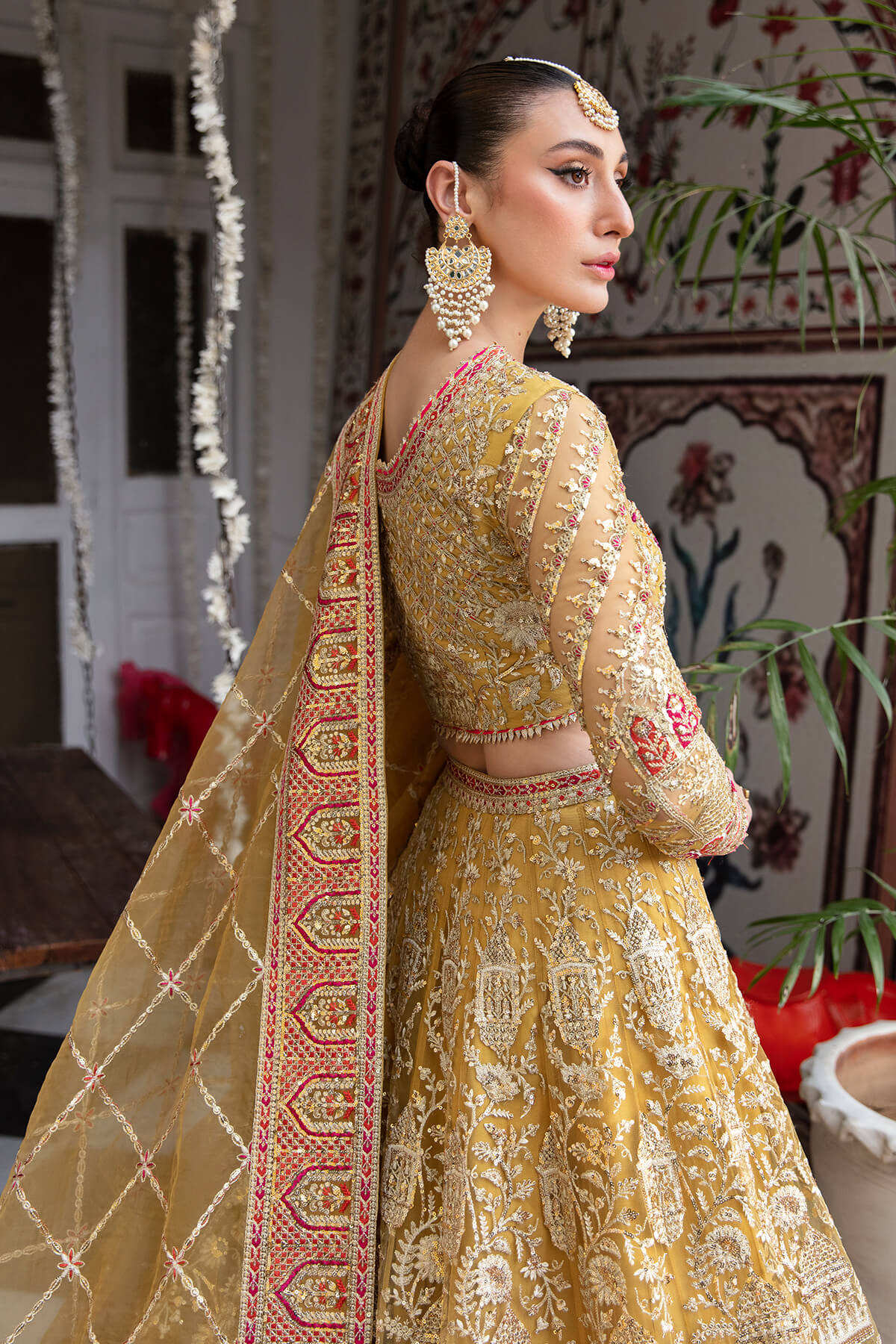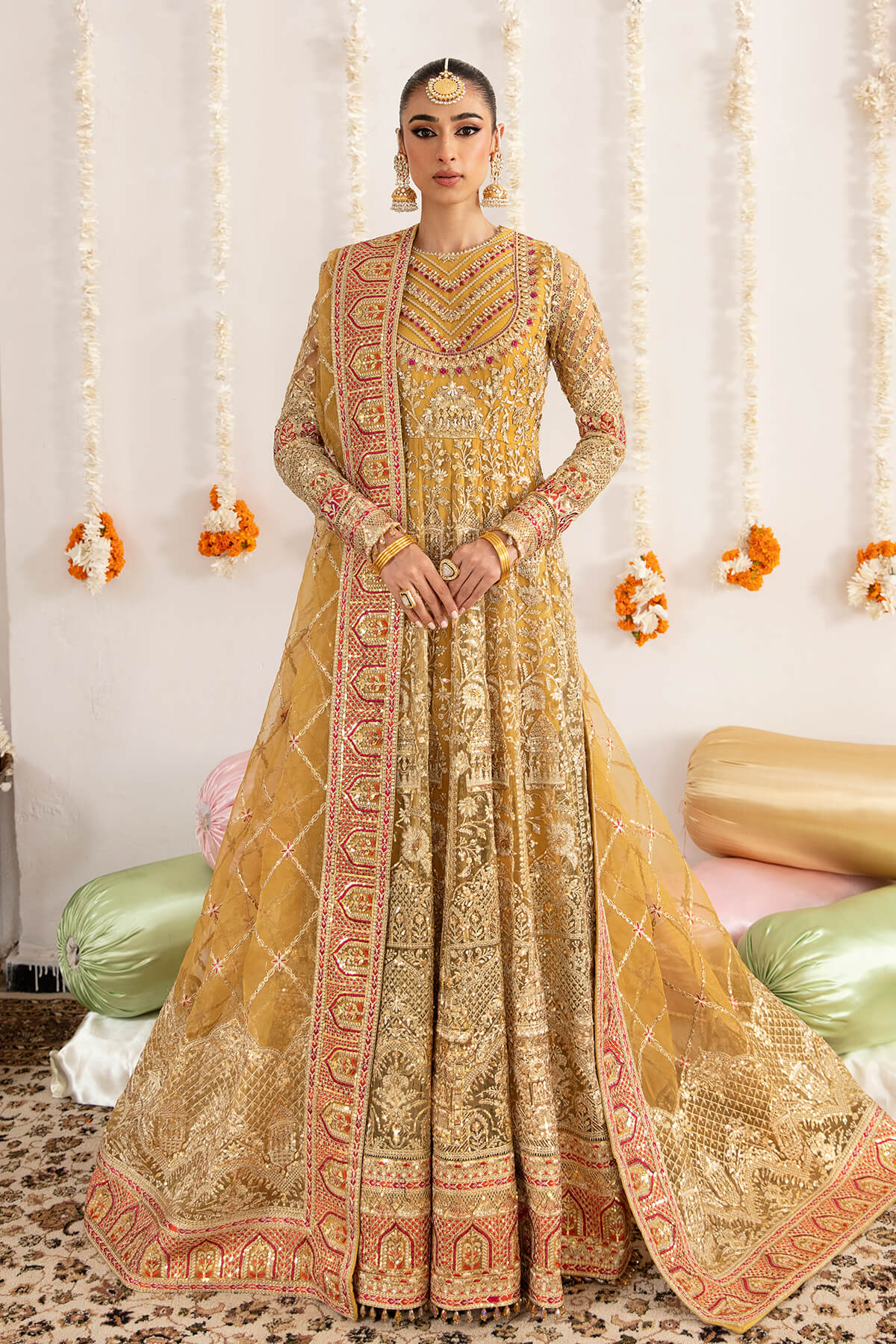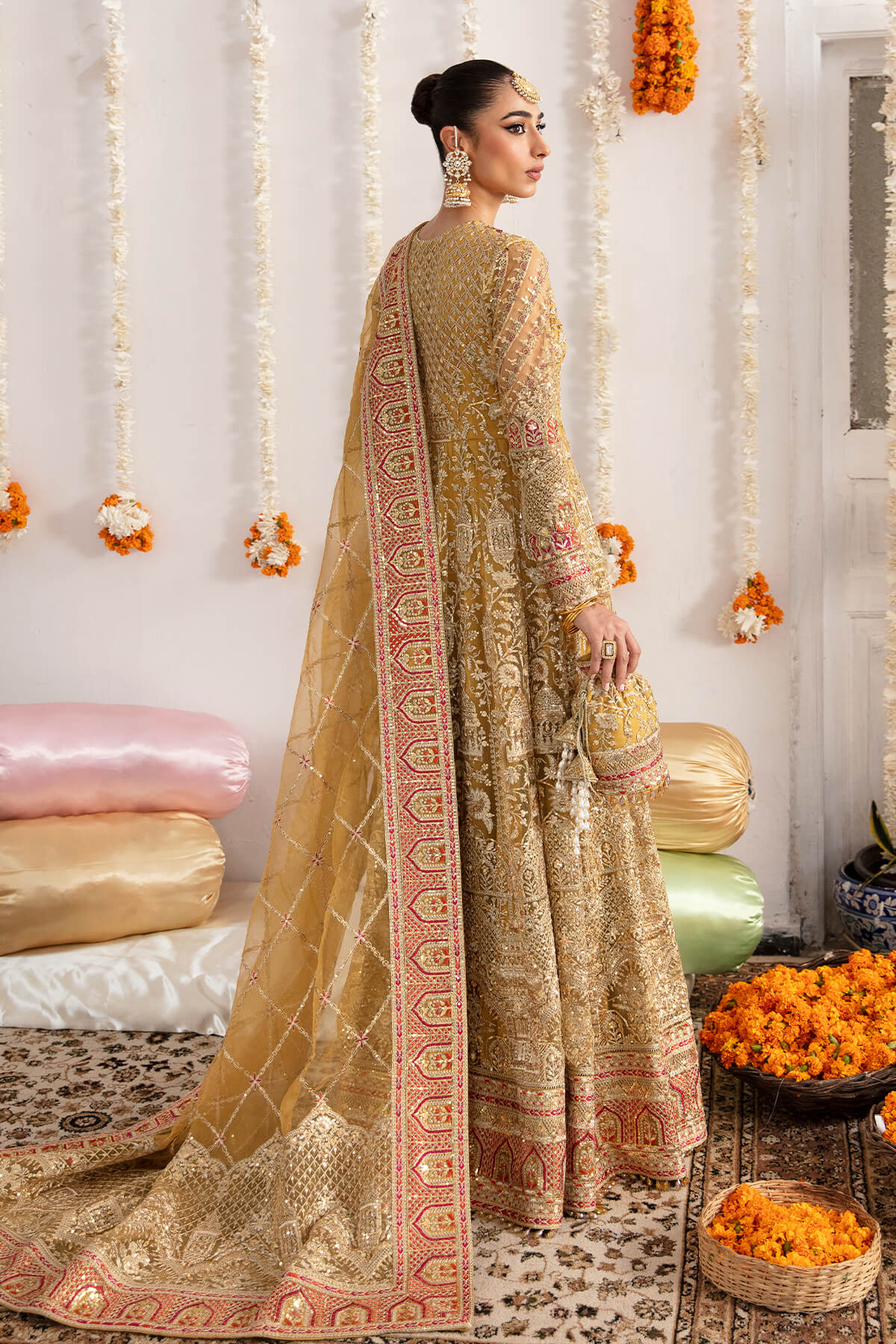 Fabric: data-mce-fragment=""1"">Embroidered net for front & back body embellished with handmade data-mce-fragment=""1"">Embroidered net for front & back panels data-mce-fragment=""1"">Embroidered net for sleeves data-mce-fragment=""1"">Embroidered organza for dupatta data-mce-fragment=""1"">Embroidered organza for front & back border data-mce-fragment=""1"">Embroidered organza for sleeves border data-mce-fragment=""1"">Embroidered organza for front & back body border data-mce-fragment=""1"">Dyed silk lining |