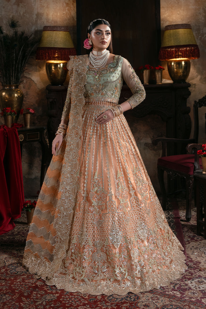 Summary: Embrace regal elegance with the 'Sitarah' by Imrozia, a breathtaking Pakistani bridal suit. This exquisite piece features a magnificent floor-length kameez crafted from delicate embroidered net, making it a luxurious choice for spring/summer weddings. The Anarkali-style dress stands out with its flowing peach panels and a contrasting sea green yoke, both lavishly detailed with handmade embellishments. This heavily decorated ethnic wear masterpiece defines luxury Pakistani formal wear. Ideal for a bride seeking a show-stopping look, this outfit is designed to make a grand statement at any wedding celebration.