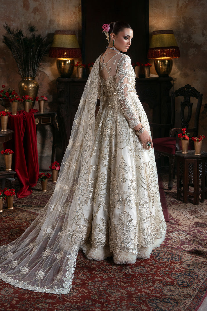 Summary: Exuding regal charm, the Imrozia Jahanara is a masterpiece of Pakistani bridal wear. This luxurious Off White formal dress is crafted from fine, airy Net fabric, making it a breathtaking choice for Spring/Summer weddings. The unstitched kameez features intricately embroidered panels and a stunning yoke with handmade embellishments, showcasing unparalleled craftsmanship. Its ethereal Off White shade is perfect for a Nikah ceremony or a sophisticated Valima look. This ethnic wear ensemble embodies grace and opulence, making it a standout piece for any bride's trousseau. Shop this exquisite Pakistani dress for a truly memorable celebration.