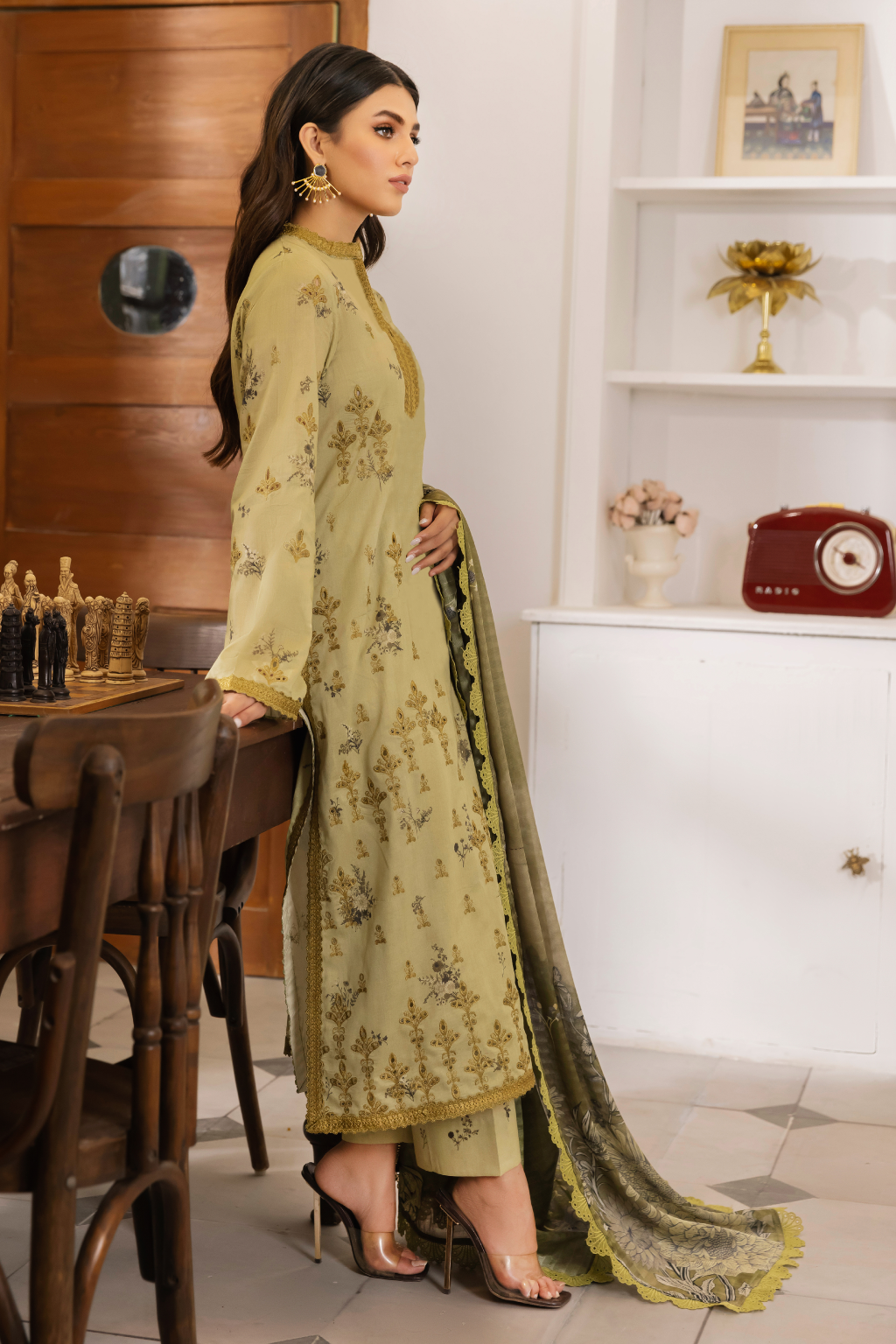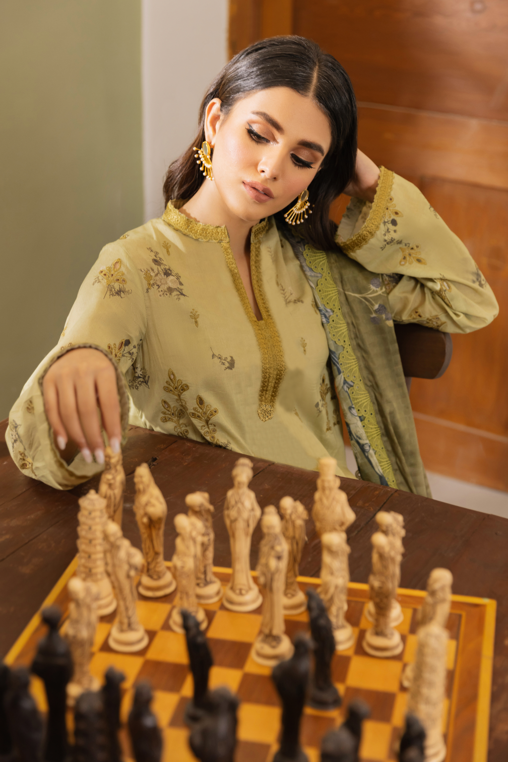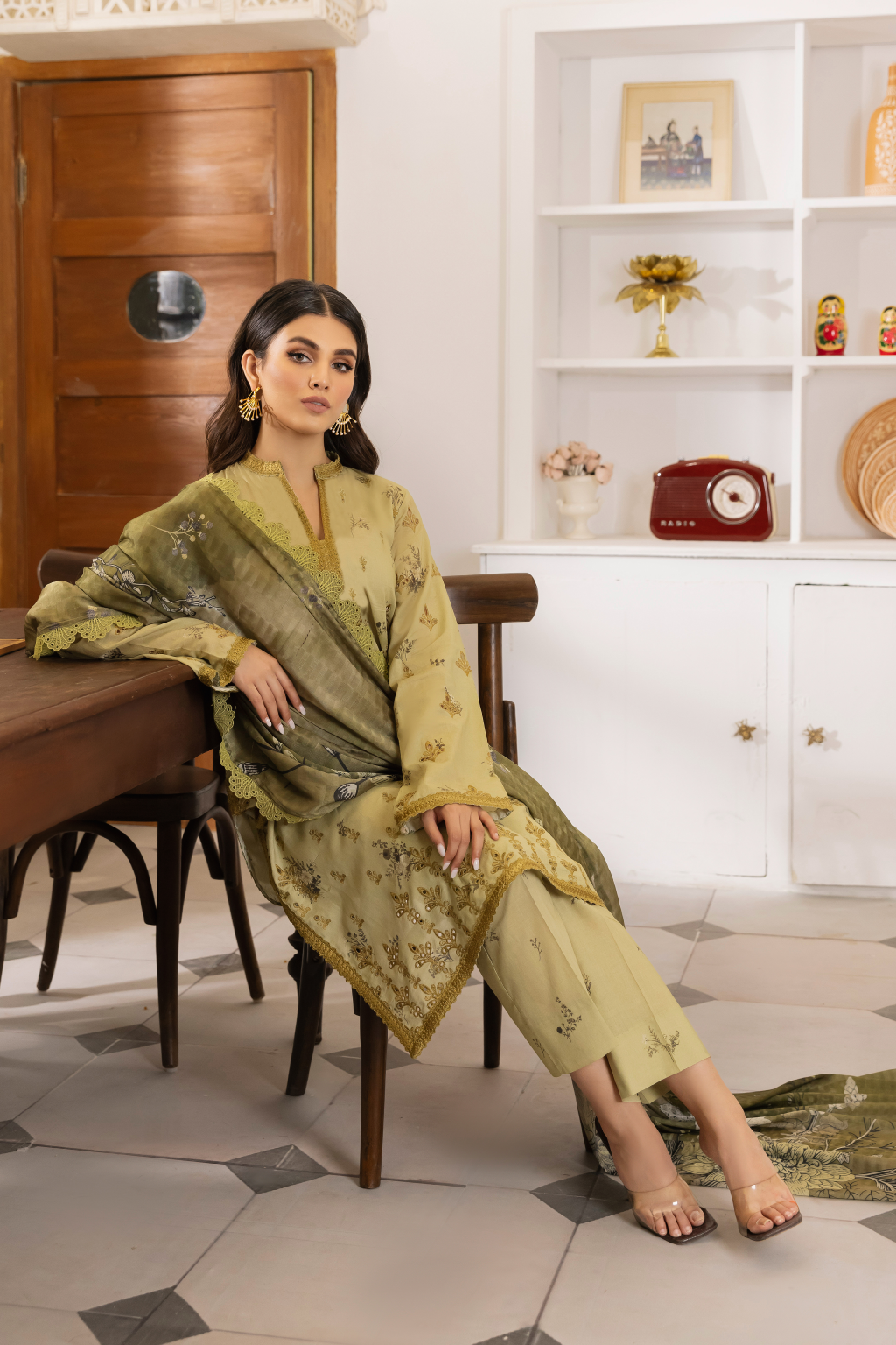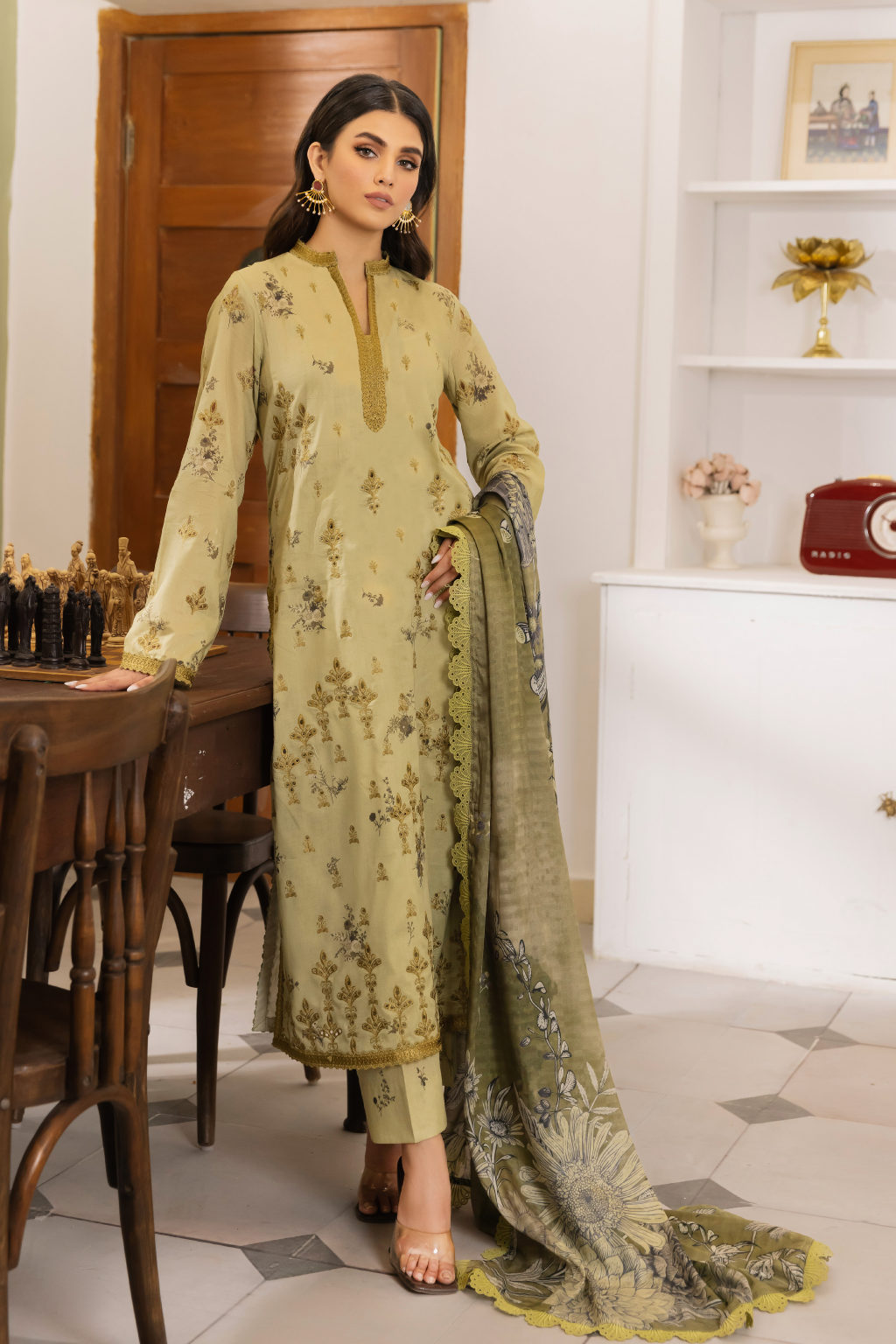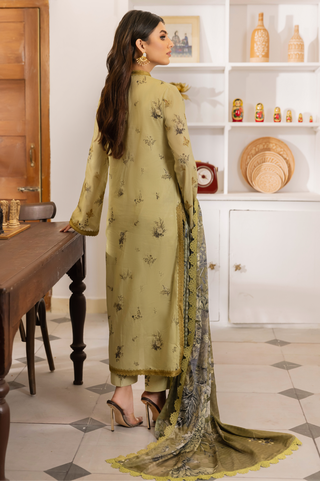 Fabric: Shirt Front: Printed Borer Embroidered Lawn (1.20 M) Shirt Back: Printed Lawn (1.25 M) Neckline: Embroidered Organza (1 Piece) Necklace: Embroidered Organza (0.60 M) Front, Back & Sleeves Lace: Embroidered Organza (2.80 M) Chalk Lace: Embroidered Organza (2.4 M) Sleeves: Printed Borer Embroidered Lawn (0.65 M) Dupatta: Textured Printed Silk (2.5 M) Trouser: Printed Lawn (2.5 M) |
