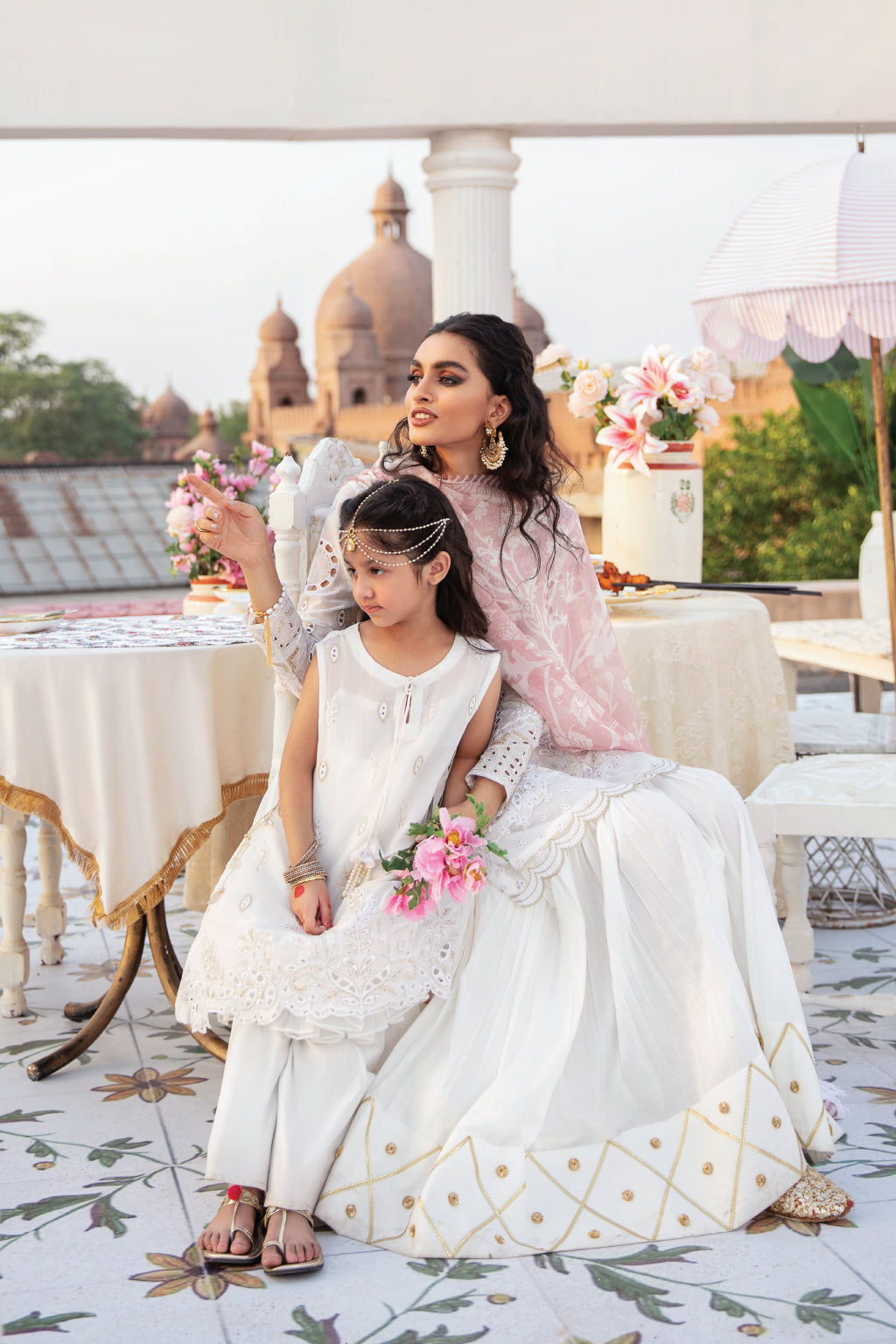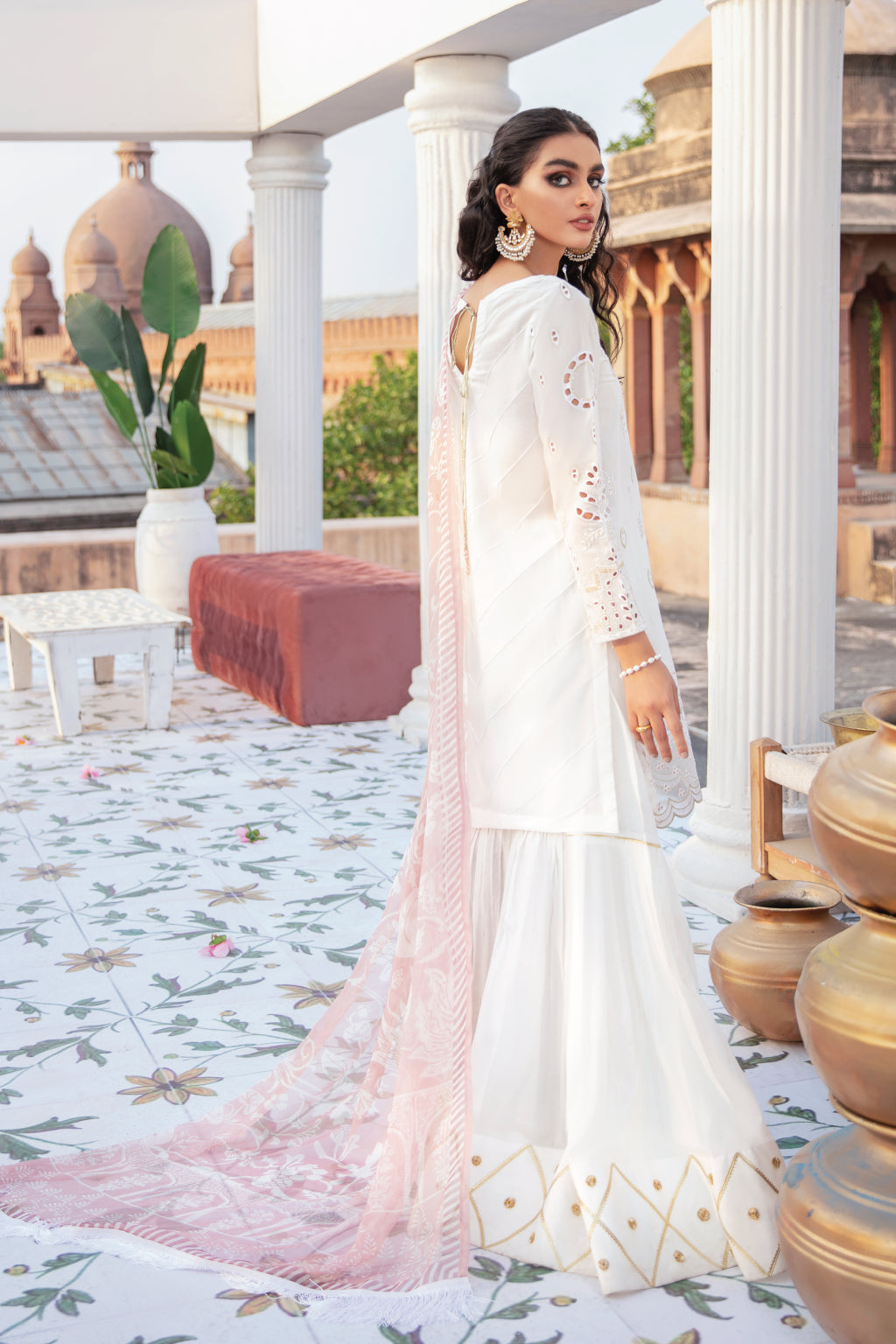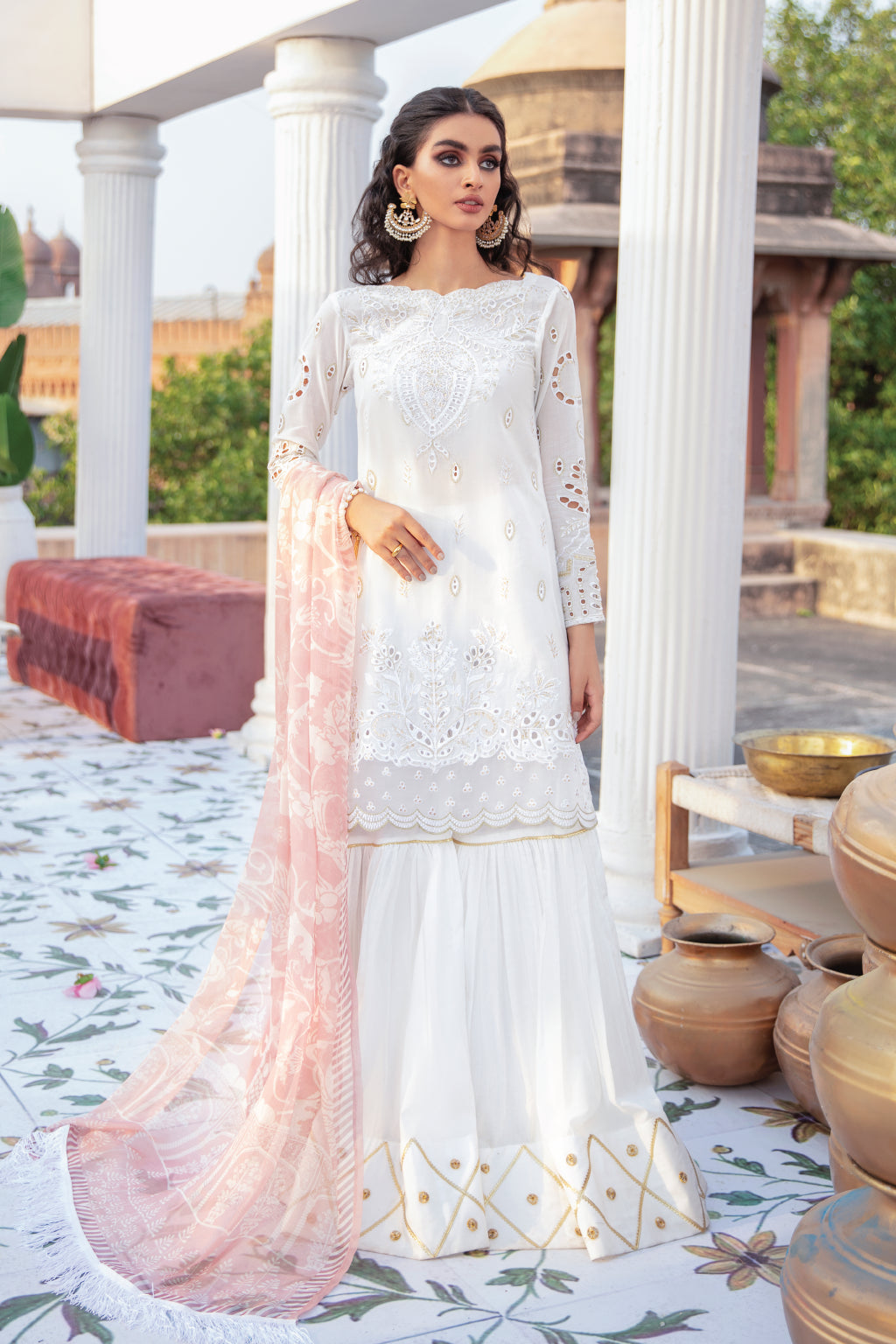 Fabric: Colour: White Shirt Front: Borer Embroidered lawn (1.10) Shirt Back: Plain Lawn (1.35 y) Sleeves: Borer Embroidered Lawn (.70 y) Neckline: Embroidered Organza (1 Piece) Front Lace: Embroidered Organza (.85 y) Dupatta: Printed Chiffon (2.75 y) Trouser: Dyed Cambric (2.5 y) |