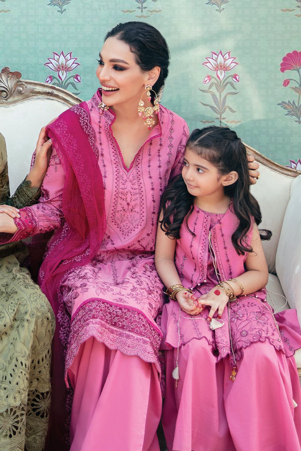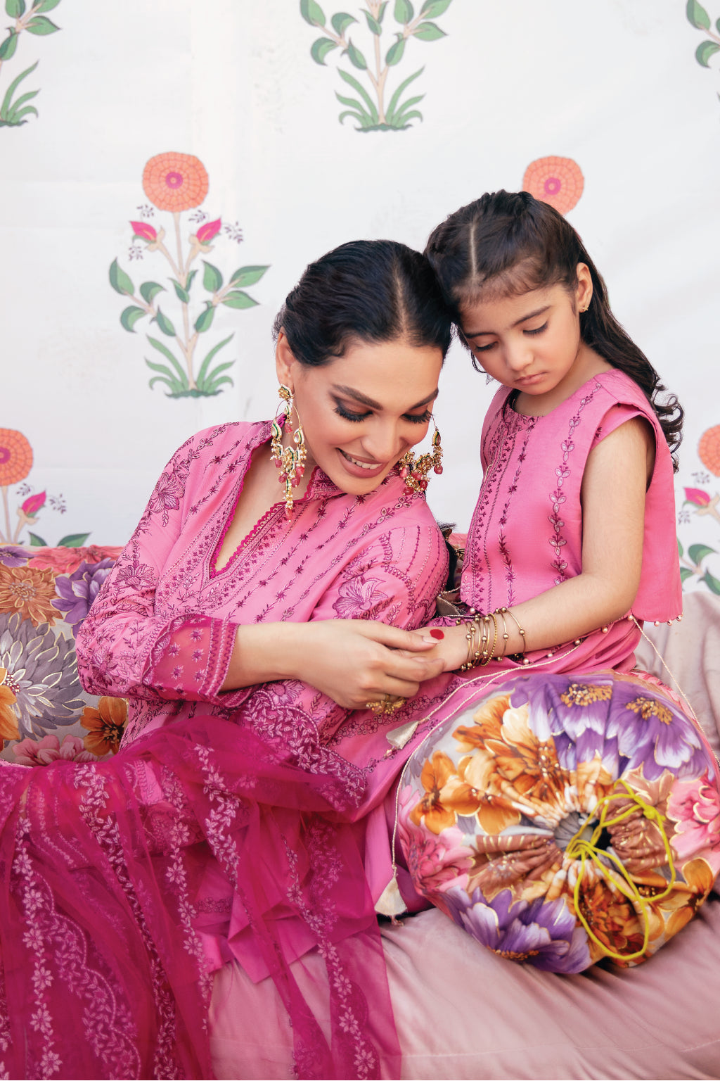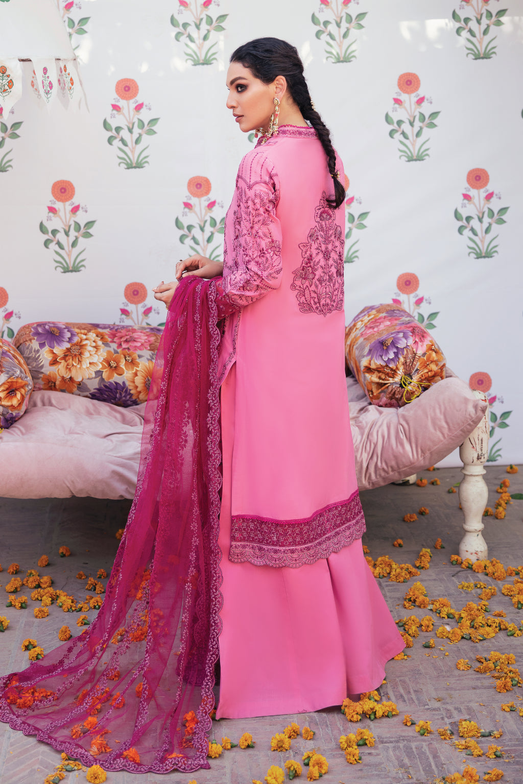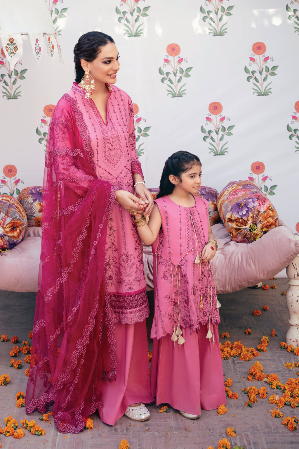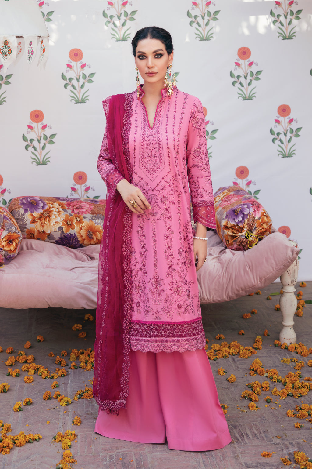 Fabric: Colour: Pink Shirt Front: Borer Embroidered Lawn (1.10 y) Shirt Back: Plain Lawn (1.35 y) Sleeves: Embroidered Lawn (.70 y) Shirt Back Patch: Embroidered Organza (1 Piece) Necklace: Embroidered Organza (.70 y) Front & Back Lace 1: Embroidered Net (1.80 y) Front & Back Lace 2: Embroidered Cambric (1.80 y) Sleeves Patch: Embroidered Organza Dupatta: Embroidered Net (2.75 y) Trouser: Dyed Cambric (2.5 y) |