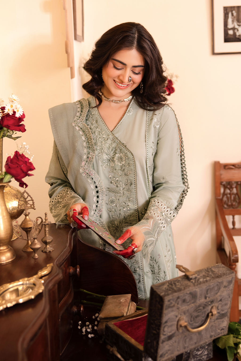 Summary: The Iznik Nani Ka Ghar Eid Lawn Collection presents the stunning NKG-02, a sea green Pakistani suit perfect for making a statement this Eid. This unstitched three-piece ensemble features a beautifully crafted shirt in a soothing sea green shade, adorned with intricate borer embroidery on the front and sleeves. The delicate floral patterns add a touch of feminine charm to the overall design. Complementing the shirt is a gracefully flowing organza dupatta with its own embroidered organza patches and border, adding a layer of elegance to the outfit. The dyed cambric trouser provides a comfortable and stylish base for the entire ensemble. This Pakistani lawn suit offers the perfect blend of traditional aesthetics and contemporary design, making it an ideal choice for Eid celebrations, parties, or other special events. The high-quality lawn fabric ensures breathability and comfort, while the organza dupatta adds a touch of shimmer and grace. This design comes unstitched, allowing you to tailor it to your individual preferences and style, ensuring a perfect fit and personalized look for your festive celebrations. Experience the allure of Iznik with this exquisite sea green Pakistani suit.