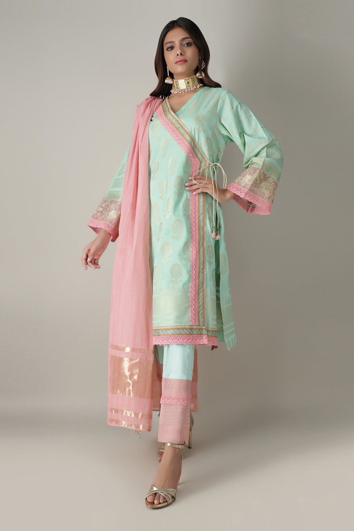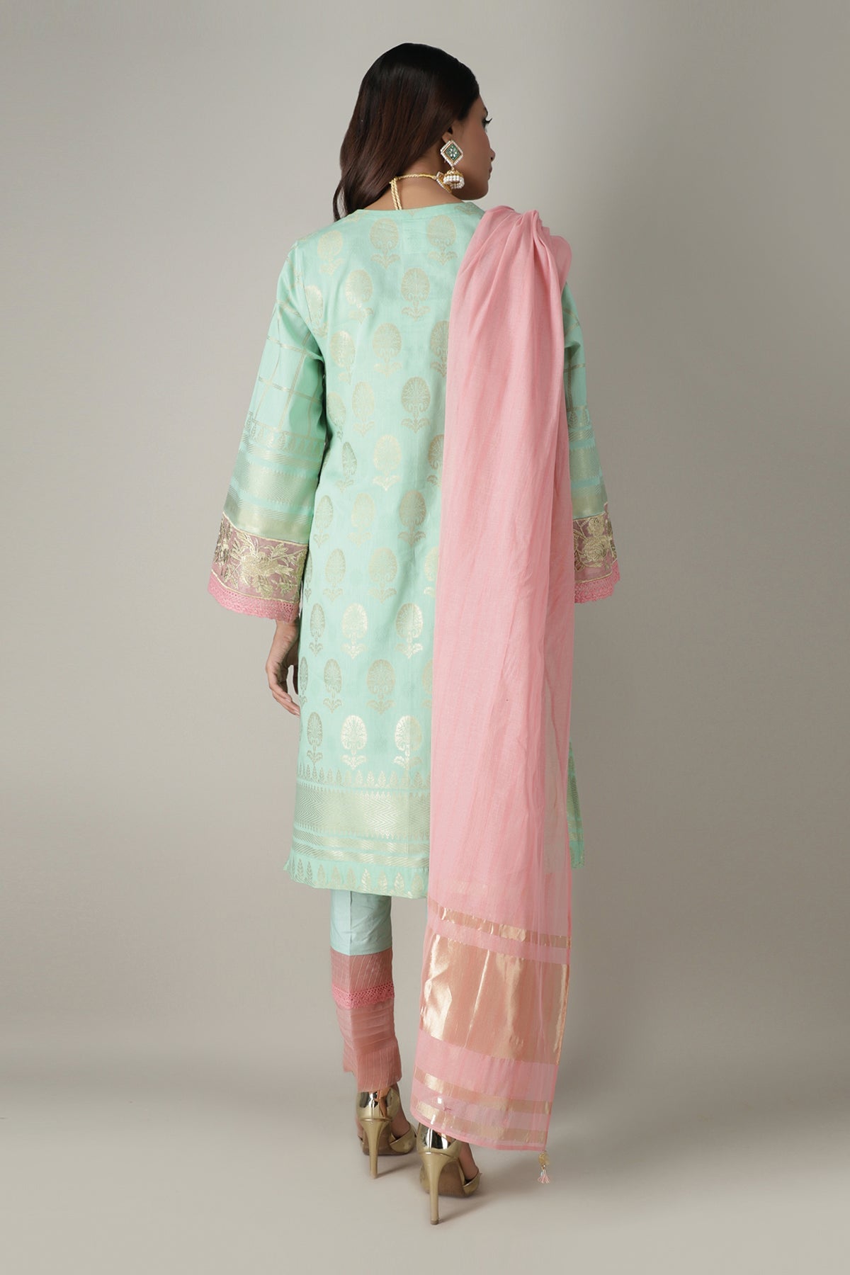 Fabric: Product Type: Kameez Pants Dupatta Technique: Solid Embroidered Fabric: Jacquard Design: Traditional Print: Stylized Shirt Length: 3.25 Meters Dupatta Length: 2.5 Meters Bottom Length: 2.5 Meters Color Family: Pastel |