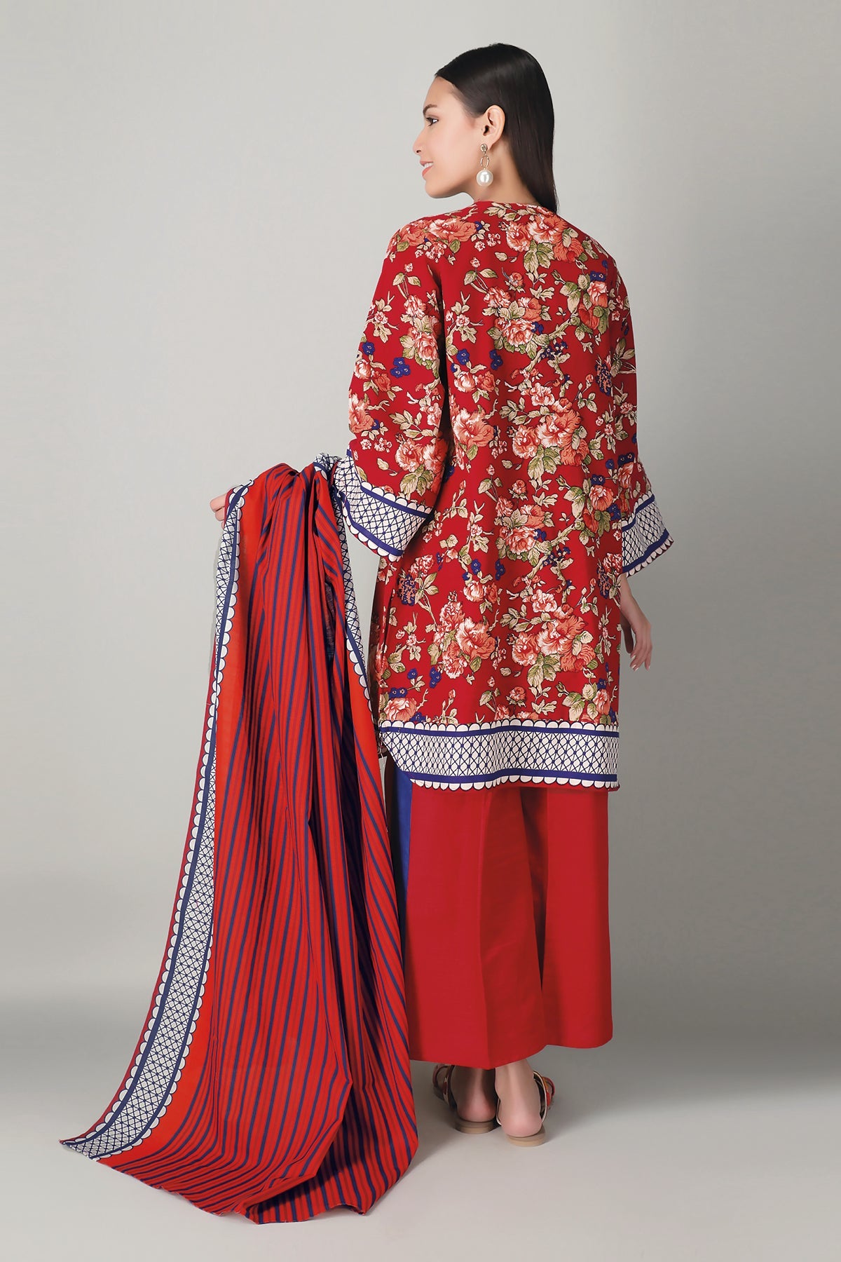 Description:A bold red 3 piece unstitched khaddar outfit with floral prints.