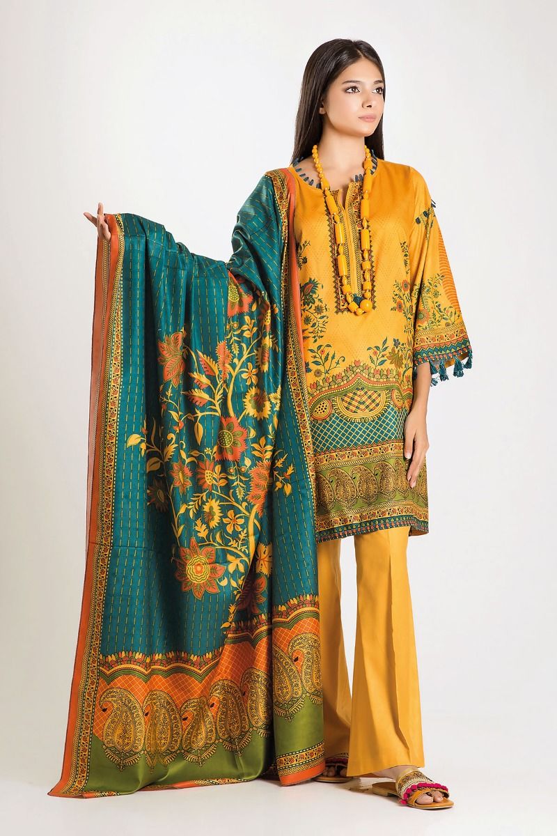 Fabric: Marina Printed Shirt 3.0m Marina Printed Dupatta 2.5m Shalwar 2.5m Material: Marina Color: Yellow |