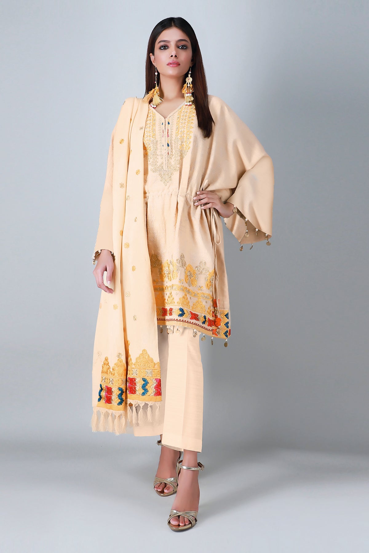 Description:A calming beige 3 piece unstitched khaddar outfit with stylized prints.