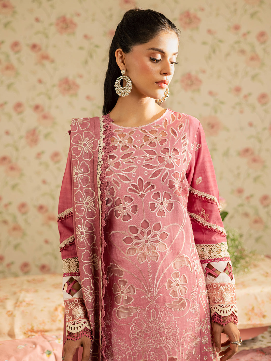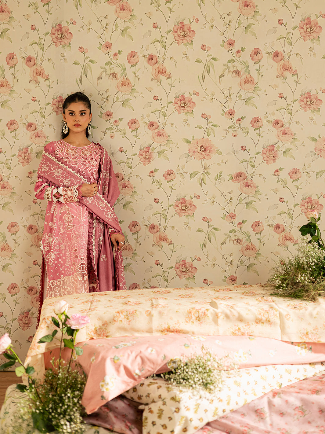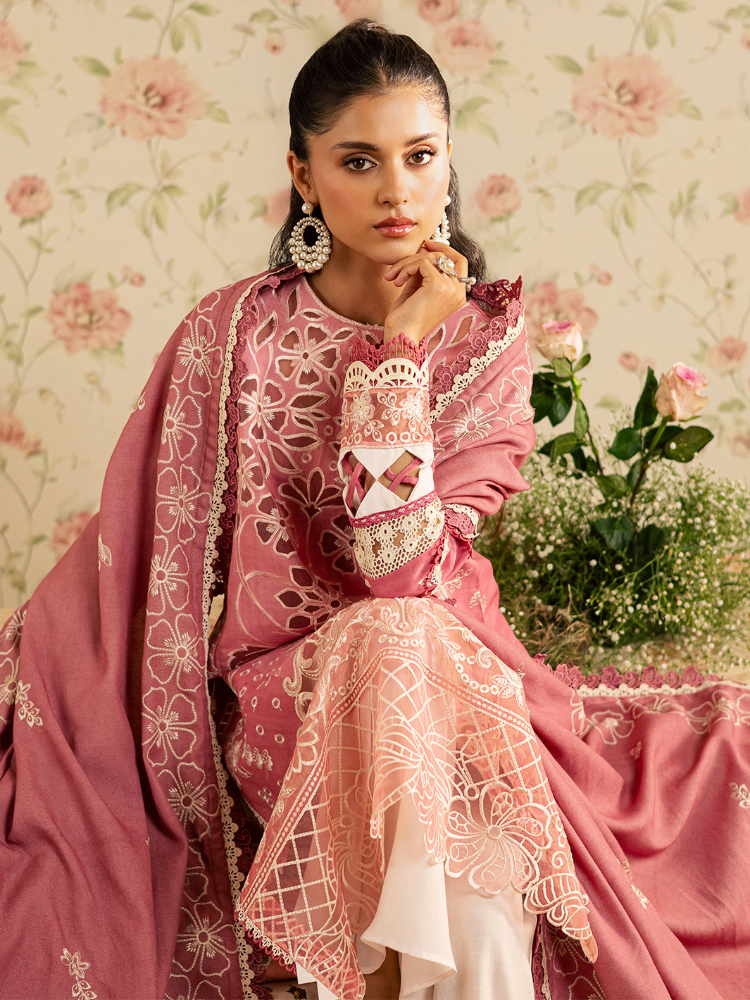 Summary: Embrace sophisticated elegance with the Mahnur Kaia Pakistani suit in a stunning pink hue. This unstitched ensemble is crafted from premium slub linen, making it a perfect choice for the Fall/Winter season. The kameez is a work of art, featuring exquisite laser-cut embroidery on the front, complemented by delicate embroidery on the back and sleeves. Paired with a warm embroidered wool dupatta, this outfit exudes grace. Ideal as formal wear for winter festivities or elegant evening events, this Pakistani dress offers a timeless look. This ethnic outfit is a must-have for your refined wardrobe.