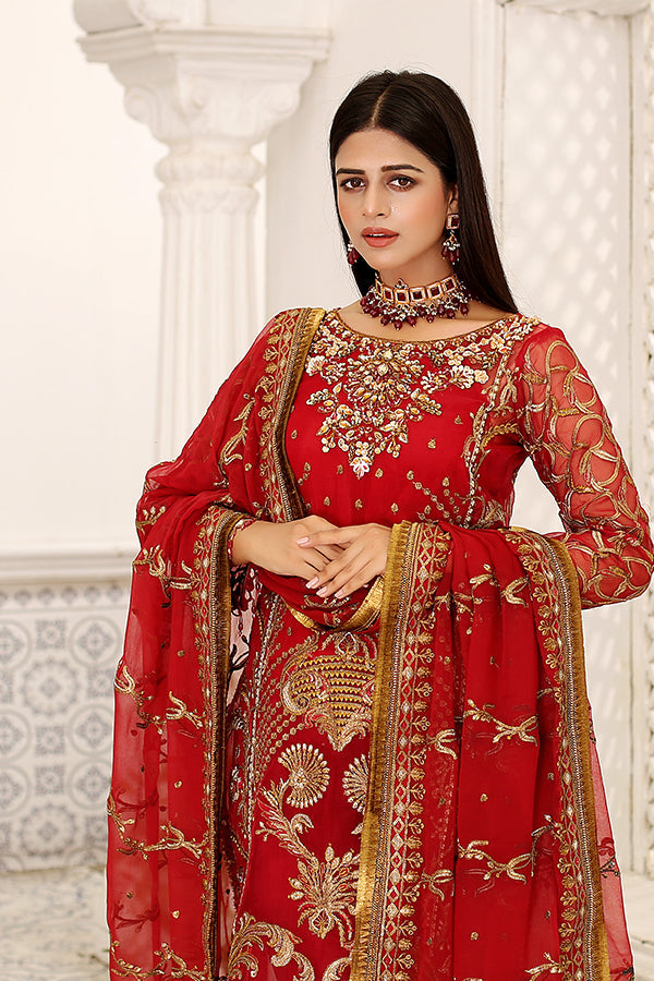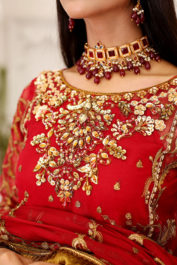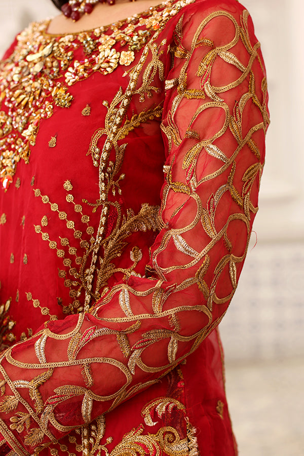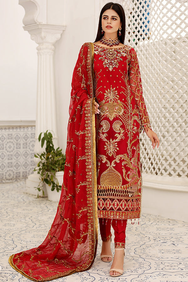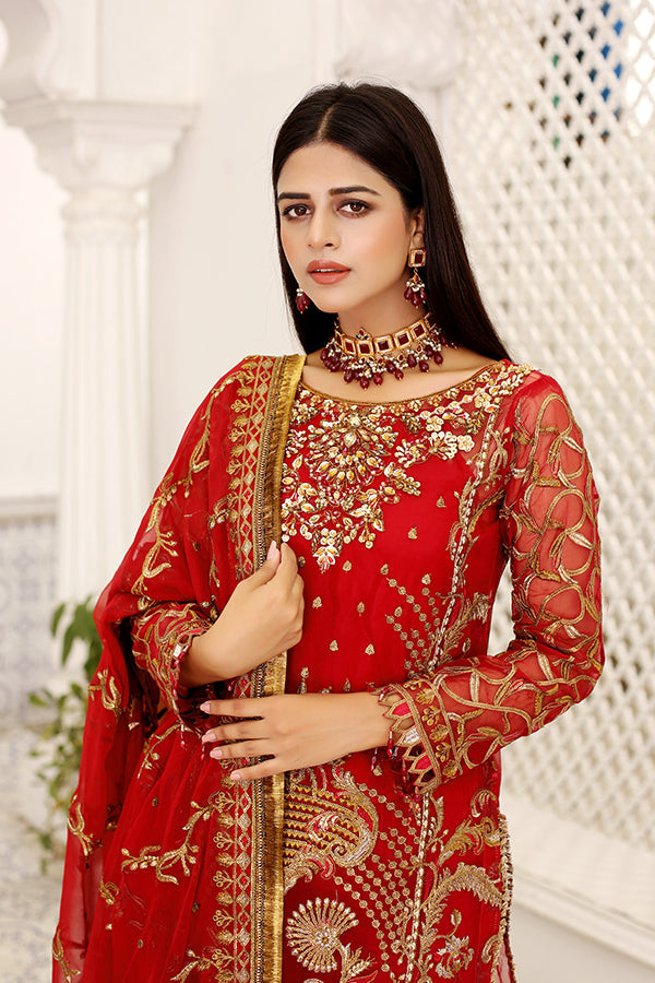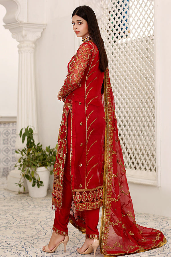 Fabric: Embroidered Front Organza. Embroidered neck line (hand made) Embroidered Front border. Embroidered Back Organza. Embroidered Back border. Embroidered Sleeves Organza. Embroidered Sleeves border. Embroidered dupatta chiffon . Embroidered dupatta chiffon . Trouser Dyed grip. |