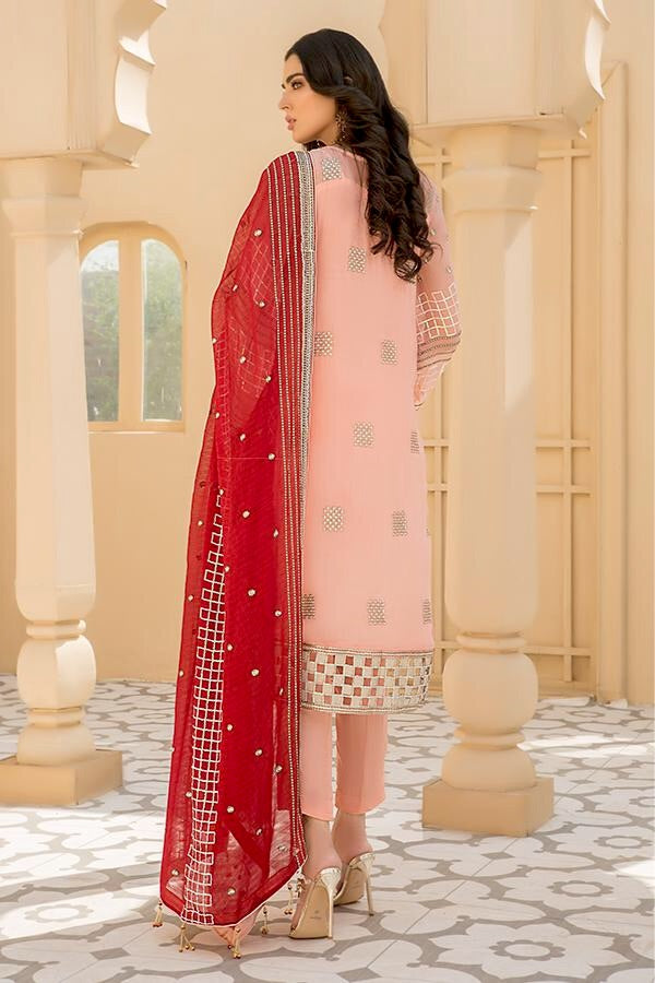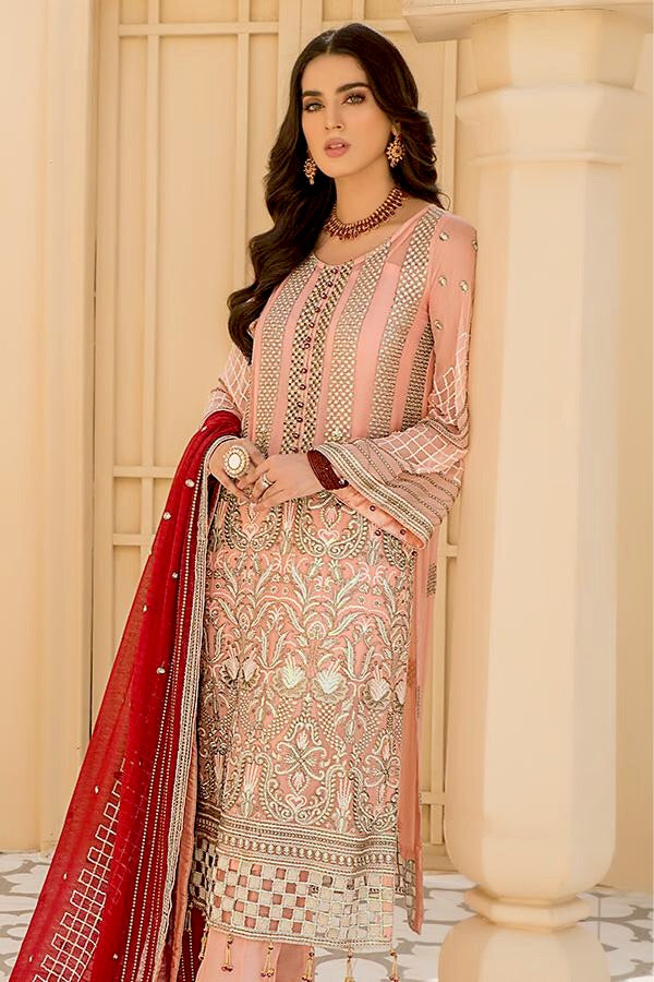 Fabric: Embroidered Front Chiffon Embroidered Front Border Embroidered neckline hand work Embroidered Back Chiffon Embroidered Back border Embroidered Sleeves Chiffon Embroidered Sleeves border Embroidered Dupatta Chiffon Trouser Dyed grip |