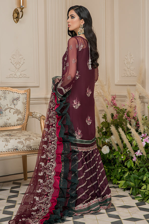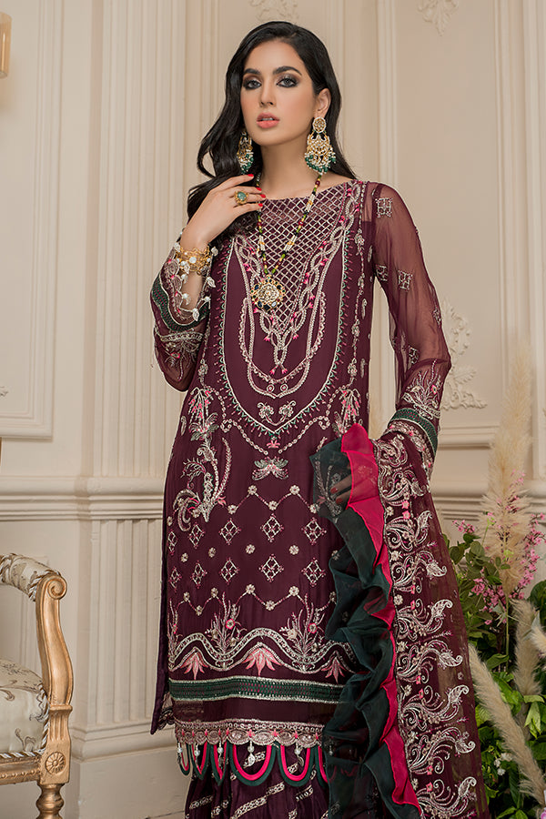 Fabric: Front chiffon embroidered Neck line embroidered Back chiffon embroidered Front border embroidered Back border embroidered Dupatta net embroidered Sleeves chiffon embroidered Sleeves border + trouser border embroidered Trouser dyed grip embroidered |