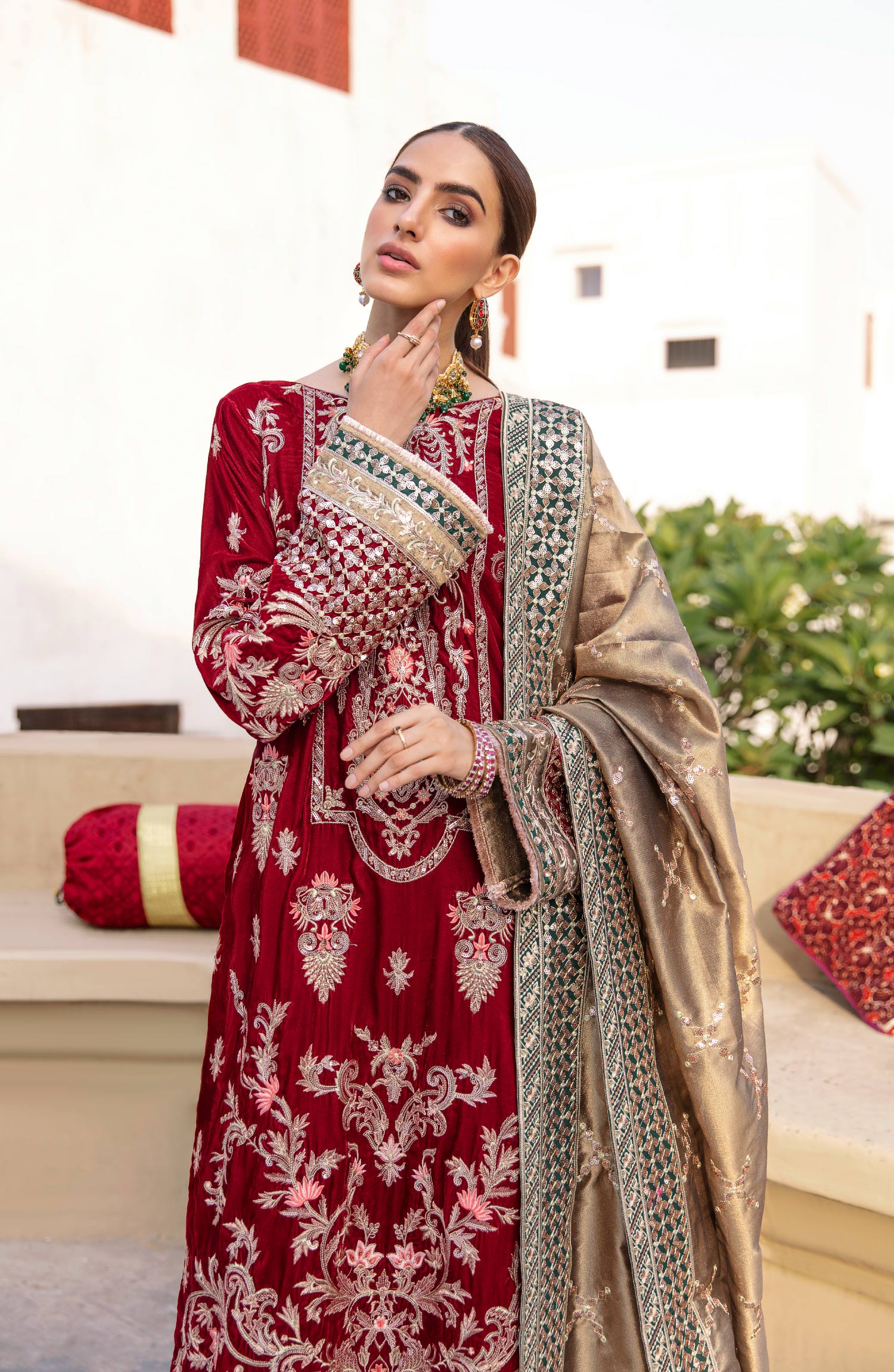 Fabric: Embroidered velvet front & sleeves Velvet back Embroidered velvet front back & sleeves border patch Embroidered organza dupatta Velvet trouser with embroidered border patch |