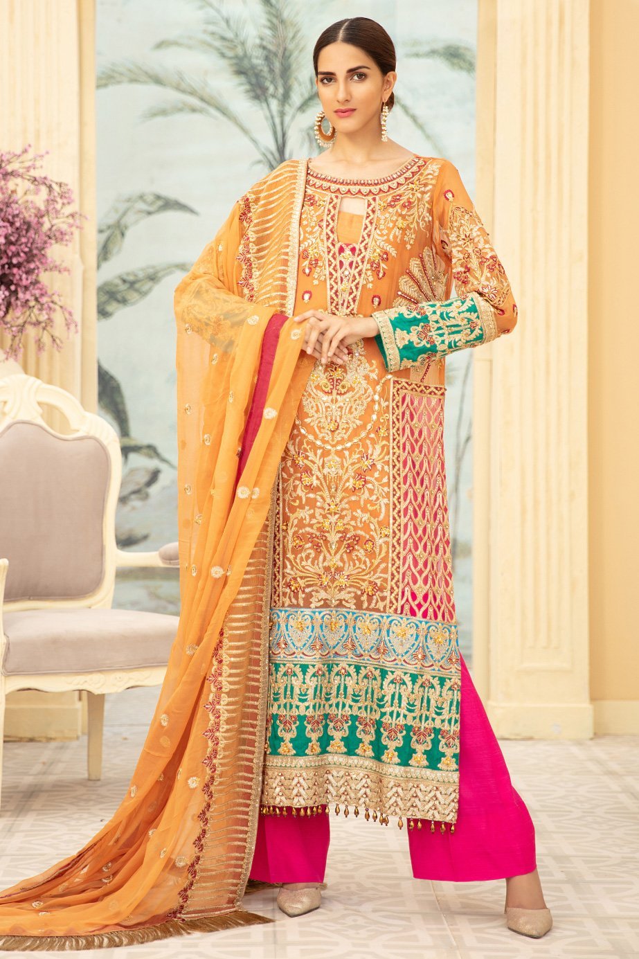 Fabric: EMBROIDERED HANDMADE CHIFFON FRONT & SLEEVES EMBROIDERED CHIFFON SIDE PANEL CHIFFON BACK EMBROIDERED CHIFFON DUPATTA EMBROIDERED HANDMADE GRIP DAMAN & SLEEVE PATCHES EMBROIDERED HANDMADE TISSUE PATCH GRIP TROUSER |