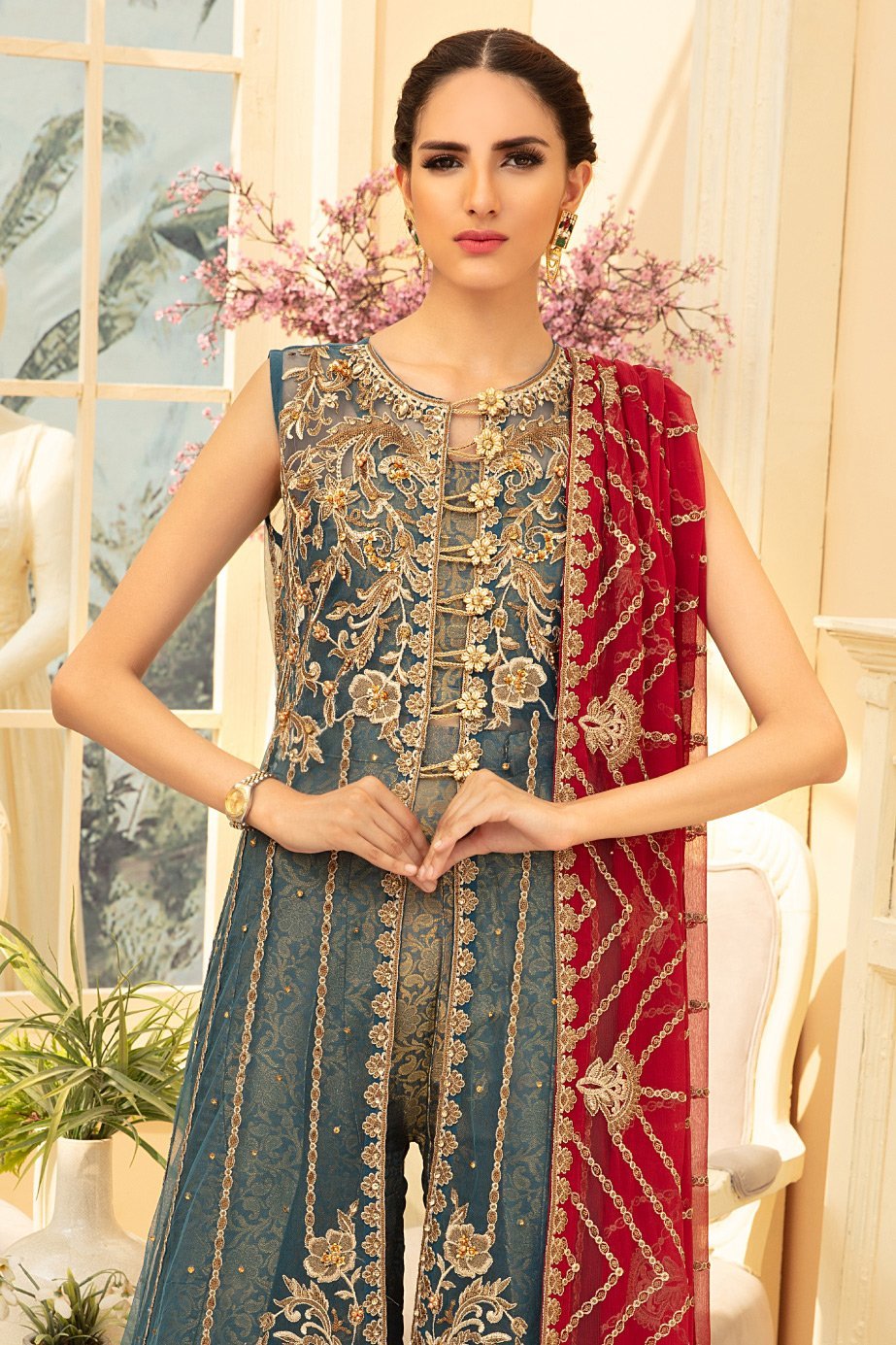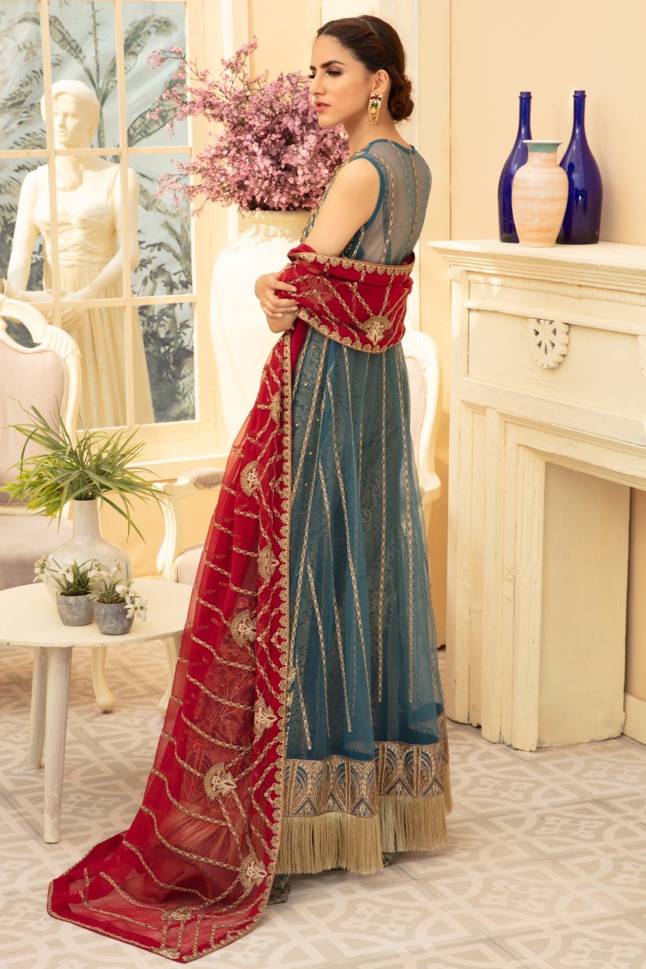 Fabric: EMBROIDERED NET HANDMADE FRONT PANELS & BODICE EMBROIDERED NET SLEEVES & BACK EMBROIDERED HANDMADE DAMAN PATCH EMBROIDERED CHIFFON DUPATTA JAMAWAR TROUSER |
