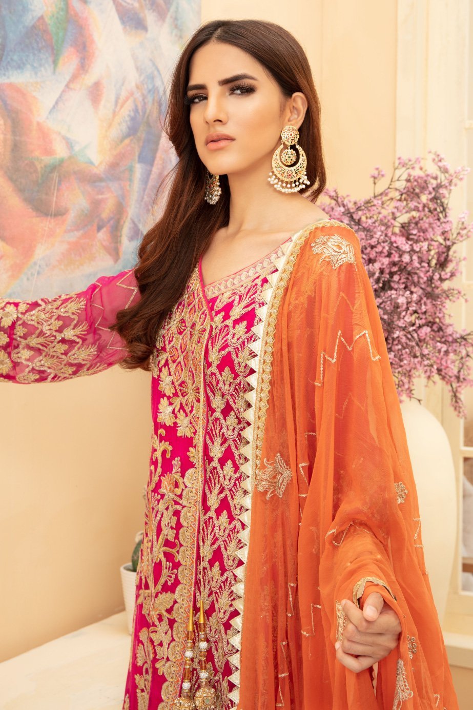 Fabric: EMBROIDERED CHIFFON FRONT PANEL SIDE PANEL & SLEEVES CHIFFON BACK EMBROIDERED CHIFFON DUPATTA EMBROIDERED DAMAN PATCH TROUSER + NECK PATCH GRIP TROUSER |