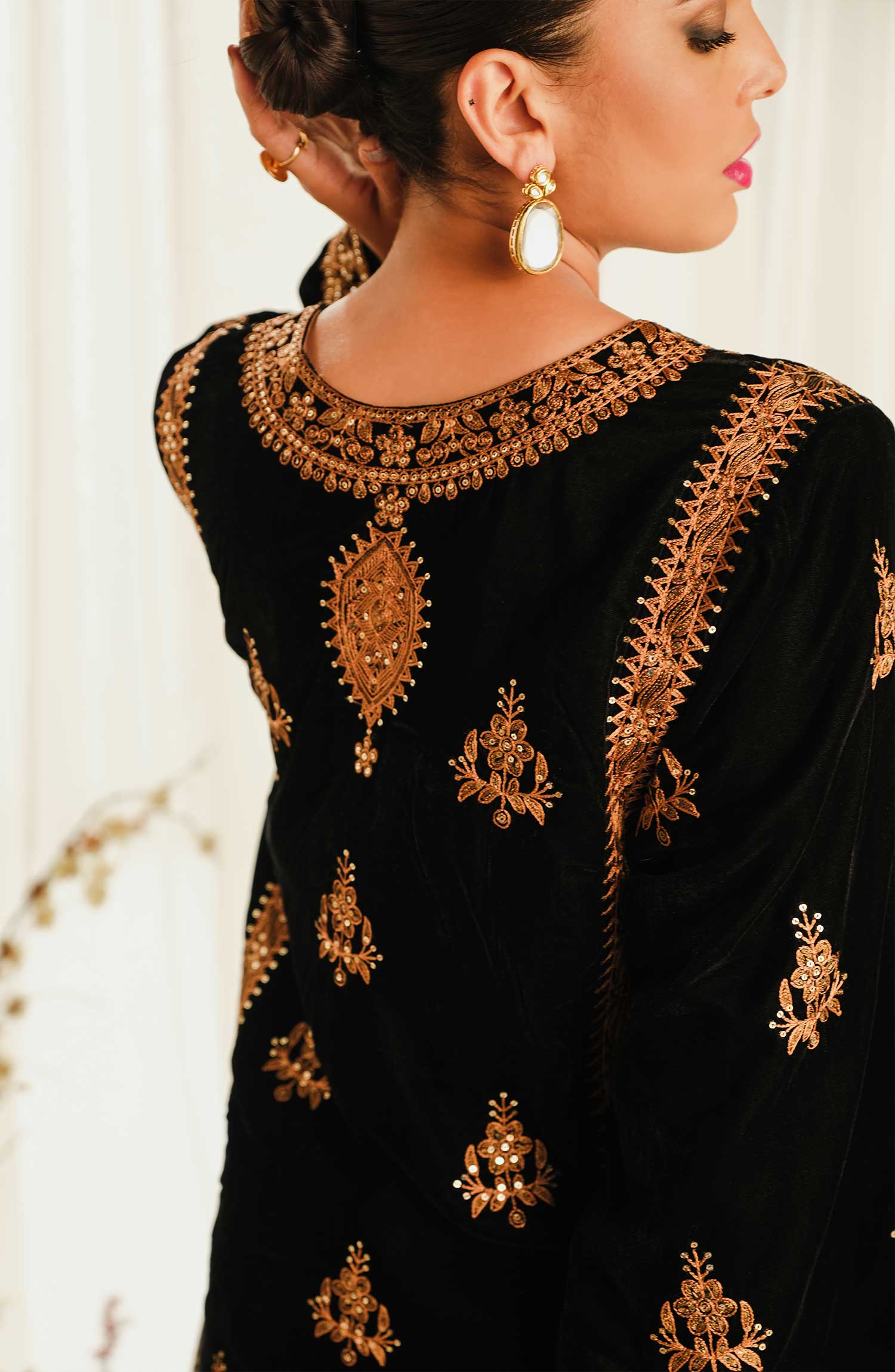 Fabric: Embroidered velvet front back sleeves Embroidered velvet front back & sleeves PaGi patches Embroidered velvet Palu dupatta with Embroidered grip tissue border patches Block print grip trouser with Embroidered velvet PaGi patch |