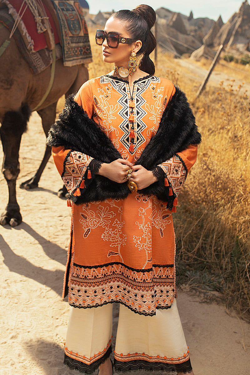 Fabric: -Embroidered khaddar front -Embroidered khaddar back -Embroidered khaddar sleeves -Embroidered border on khaddar for front and back -Embroidered finishing lace on silk -Embroidered finishing lace for sleeves -Finishing croshette lace -Silk handmade buttons (orange and black) -Khaddar dyed trouser -Khaddar digital printed shawl  |