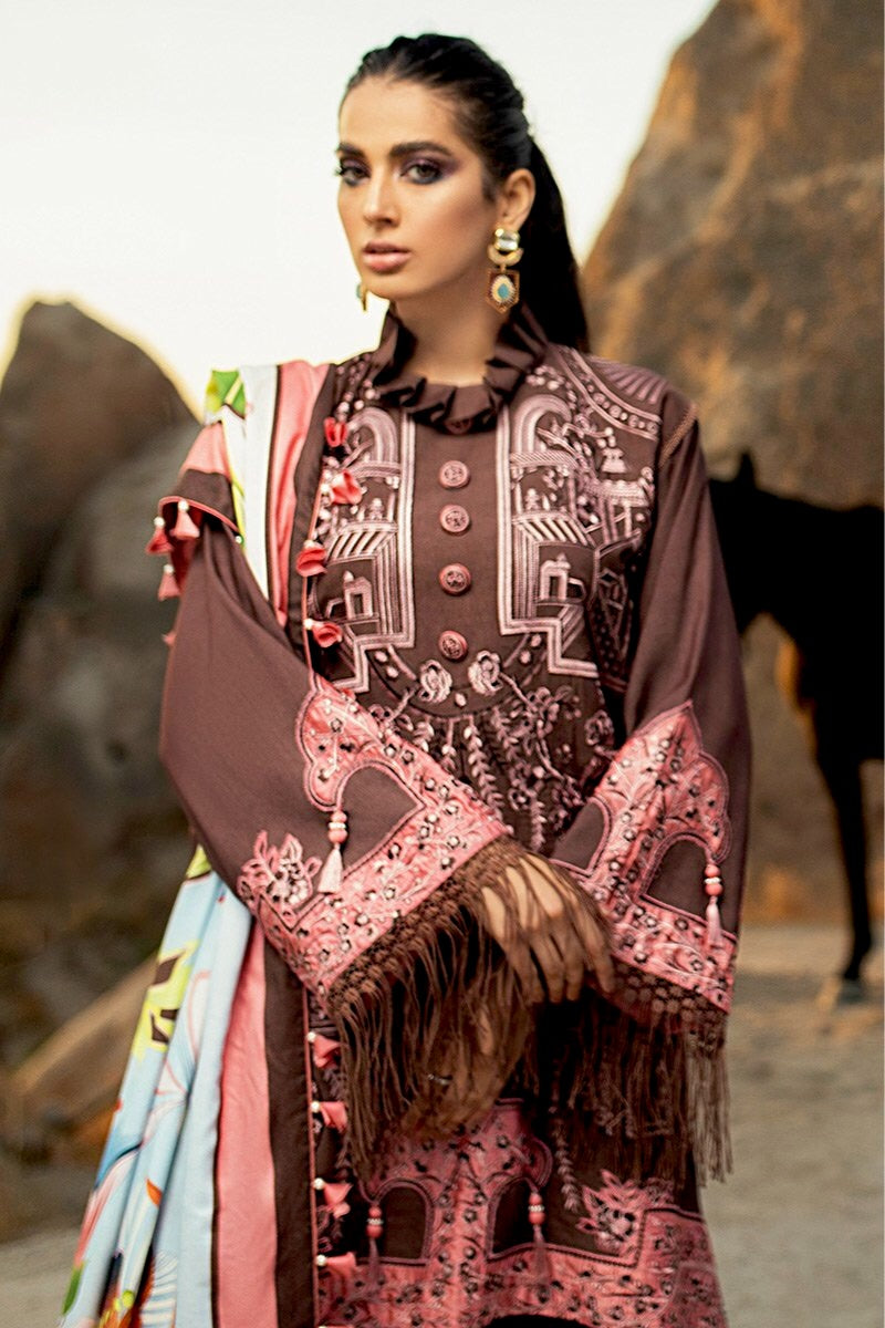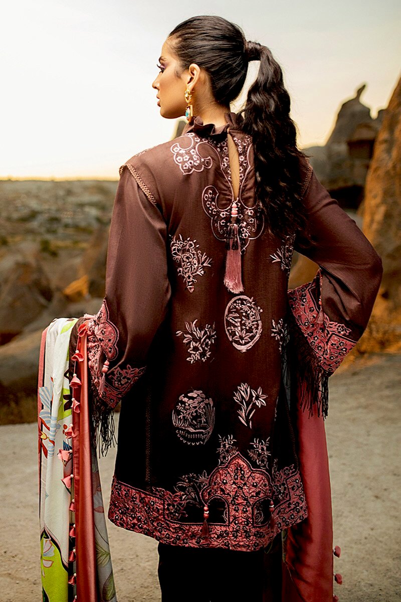 Fabric: Embroidered linen front Embroidered linen back Dyed linen sleeves Embroidered border on silk for front and back (2) Embroidered border on silk for sleeves (2) Embroidered handmade buttons Linen dyed trouser Linen digital printed shawl  |