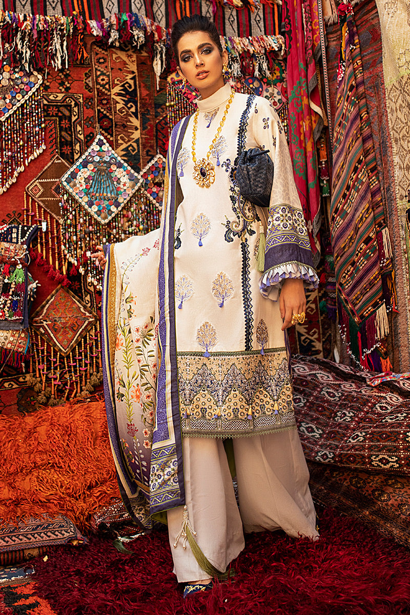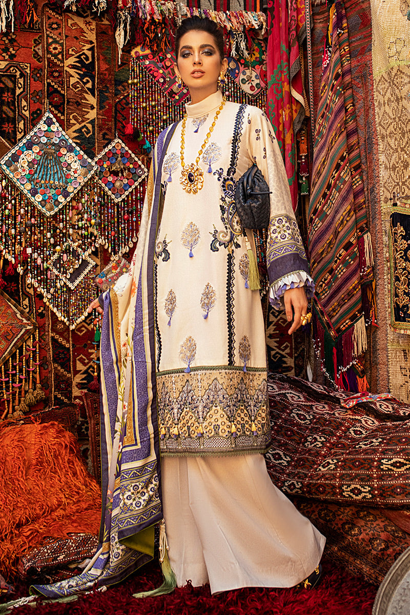 Fabric: Embroidered karandi front Digital printed karandi back Digital printed karandi sleeves Embroidered border on silk for front Hand made fancy tassels Thread tassels for front motifs Karandi dyed trouser Karandi digital printed shawl  |