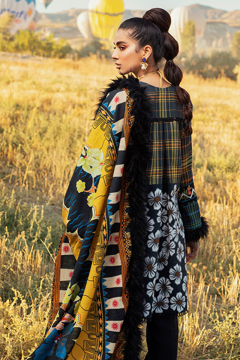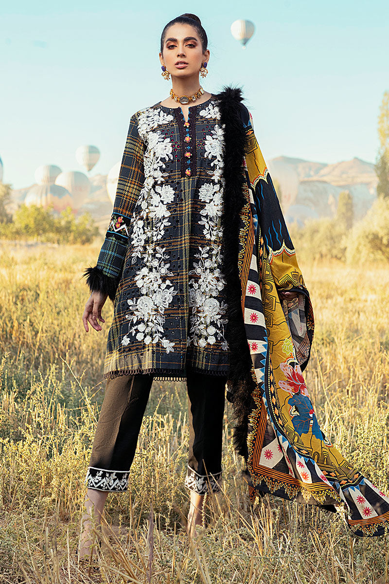 Fabric: Digital printed and chikan embroidered khaddar front Digital printed khaddar back Digital printed khaddar sleeves Embroidered lace for trousers Embroidered lace for sleeves Finishing croshette lace Khaddar dyed trouser Khaddar digital printed shawl  |