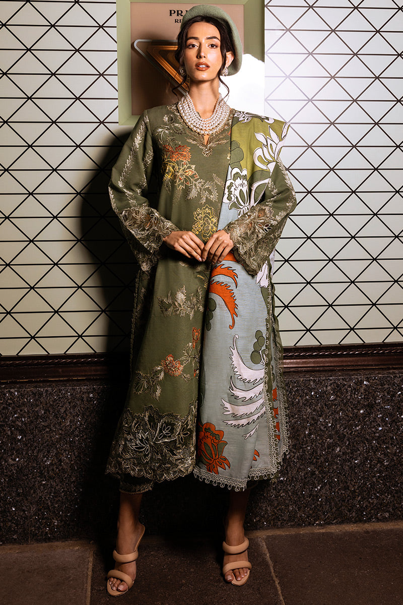 Fabric: ""Chelsea Charm"" ensemble offers a harmonious blend of elegance. The sequin embroidered khaddar shirt, adorned with intricate embroidery on the sleeves, exudes sophistication and grace. The embroidered sleeves add a touch of timeless charm, while the printed khaddar shawl, featuring delicate crochet lace finishing’s, completes the ensemble with a touch of ethereal beauty. Package Details: Sequin embroidered khaddar for front Sequin embroidered khaddar for back Embroidered Khaddar sleeves Sequin embroidered front neckline Sequin embroidered back neckline Chikan embroidered sleeves border Embroidered lace for side slits Embroidered lace for trouser Embroidered 3-D motif Printed khaddar shawl Dyed khaddar trouser Crochet lace for finishing |