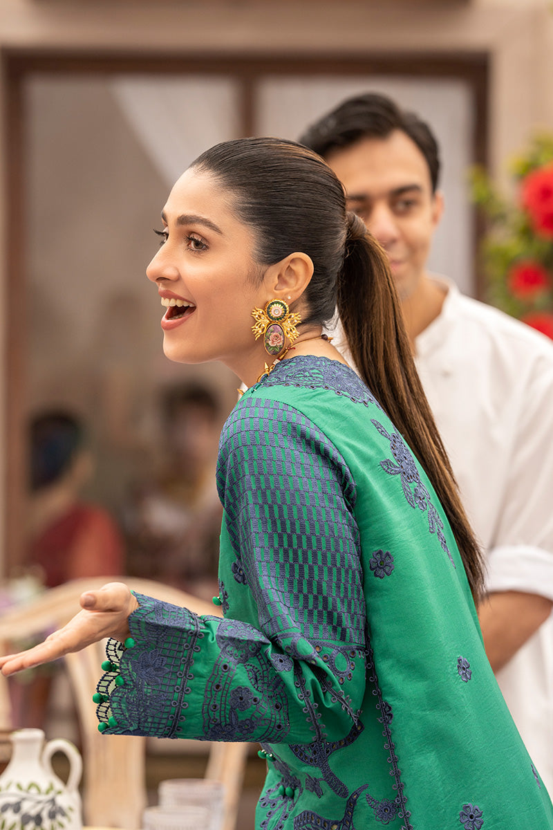 Fabric: Chikan embroidered lawn front Chikan embroidered lawn back Chikan embroidered lawn sleeves Embroidered front and back border Embroidered front neckline Embroidered sleeves border Embroidered trouser lace Crochet lace for finishing Silk balls for finishing Digital print pure chiffon dupatta Dyed cotton trouser |