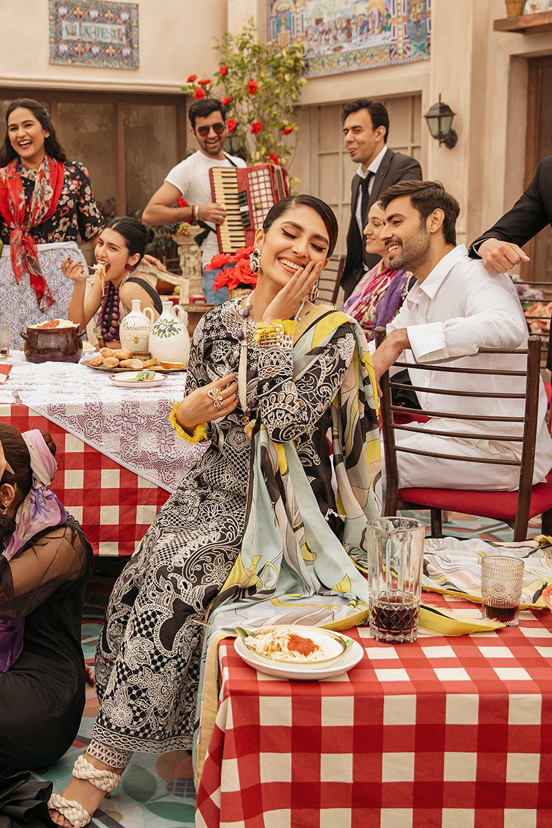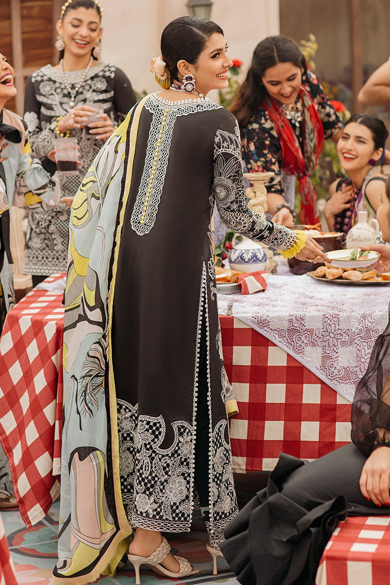 Fabric: Chikan laser cut embroidered lawn front Dyed lawn for back Chikan laser cut embroidered sleeves Embroidered sequinned border from front and back hem Embroidered sleeves border Embroidered embellished front neckline Embroidered back neckline Embroidered trouser lace Crochet lace for finishing Hand made thread tassles for sleeves Silk buttons for finishing Digital print pure silk dupatta Dyed cotton trouser |