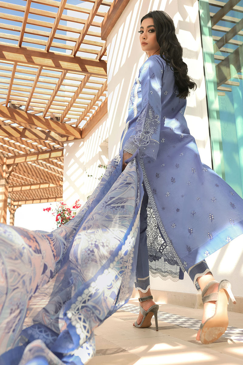 Fabric: • Chikan Embroidered Lawn Front • Embroidered Lawn Back • Chikan Embroidered Lawn Sleeve • Chikan Embroidered Front Hem Border (Organza) • Chikan Embroidered Sleeve Motif 2 Pcs • Embroidered Lace For Side Slits (Organza) • Crochet Lace For Finishing • Silk Buttons • Digital Print Chiffon Dupatta • Dyed Cotton Trouser |