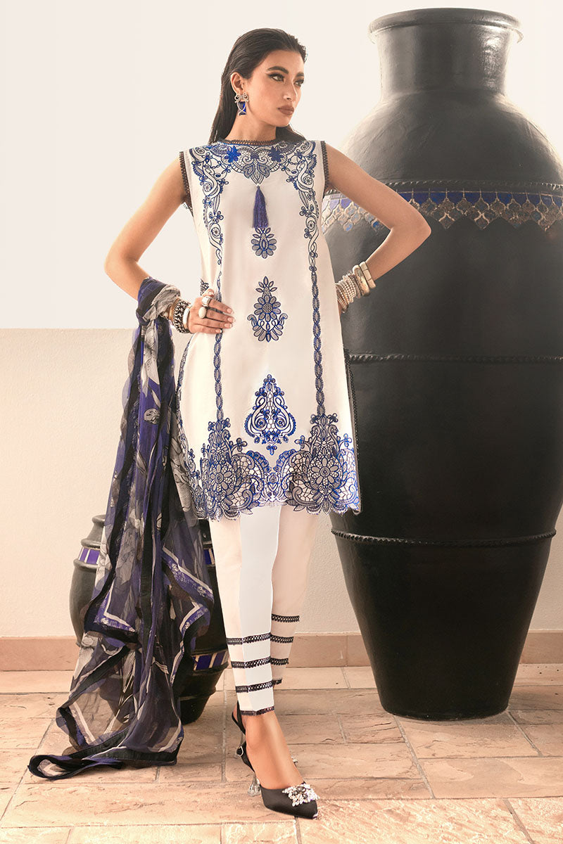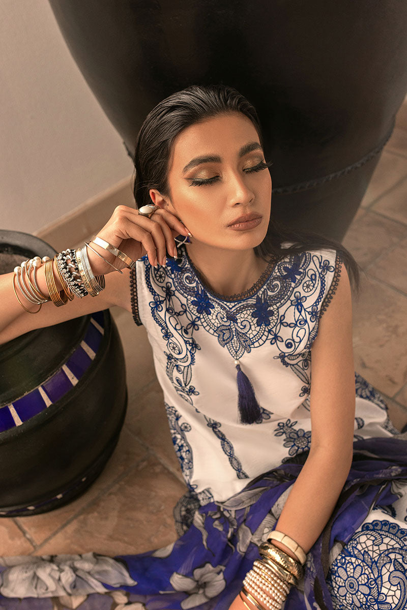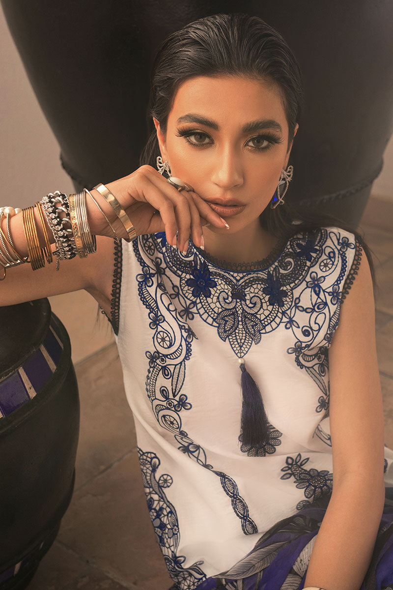 Fabric: • Chikan Embroidered Lawn Front • Embroidered Lawn Back • Dyed Sleeves • Chikan Embroidered Front/Back Hem Border (Organza) • Chikan Embroidered Side/Sleeve Motif 2 Pcs (Organza) • Crochet Lace For Finishing • 01 Pcs Front Tassel • Digital Print Chiffon Dupatta • Dyed Cotton Trouser |