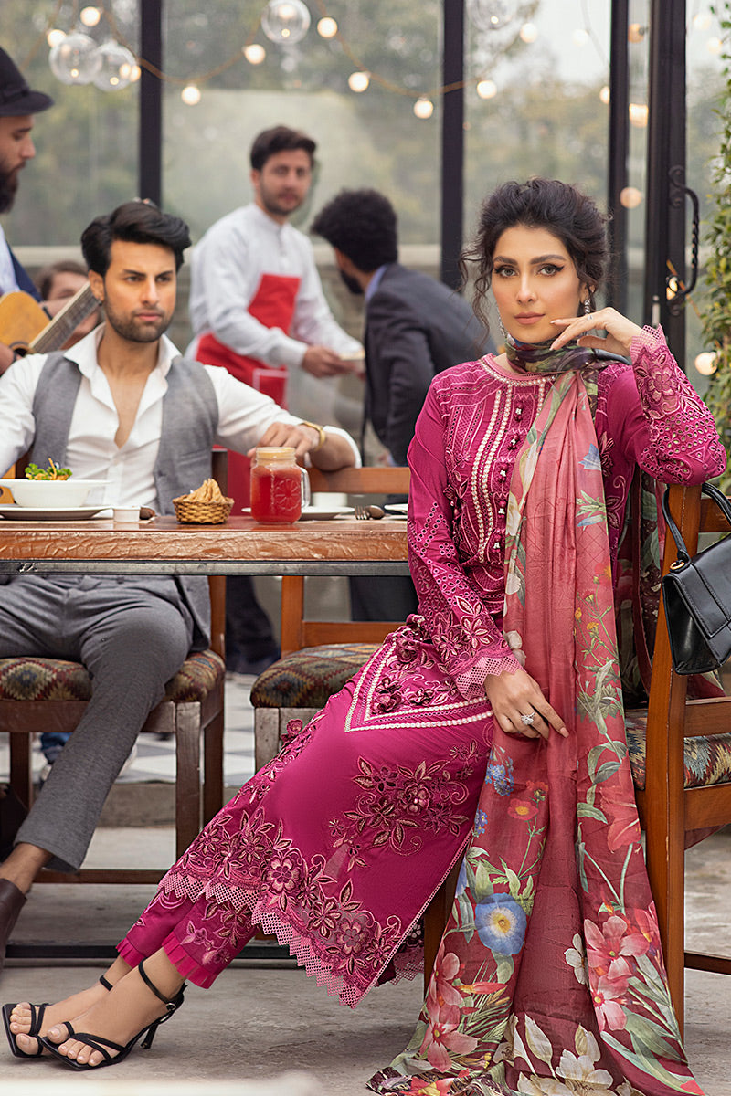 Chikan and pani embroidered front Chikan and pani embroidered back Chikan embroidered sleeves Embroidered border for front, back and sleeves 3D flowers Pearls for finishing Hanging buttons for neckline Finishing lace for front, back and sleeves Embroidered motifs for shirt Embroidered motifs for trouser Dyed cotton trouser Digital print pure silk dupatta |
