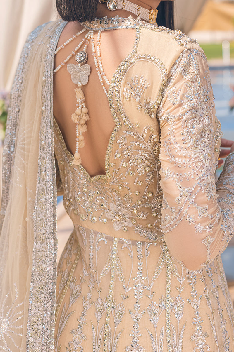 Fabric: Hand embellished front yoke on chiffon Hand embellished back yoke on chiffon Embroidered and sequinned chiffon for front and back Embroidered and sequinned chiffon for sleeves Embroidered and sequinned border for front and back on silk Embroidered and sequinned border for sleeves on silk Pani finishing lace Sequinned and pearl embellished net dupatta Cotton silk under shirt Raw silk trouser Pearls for finishing Hand embellished back tassle 1 pcs Sequinned finishing patti |