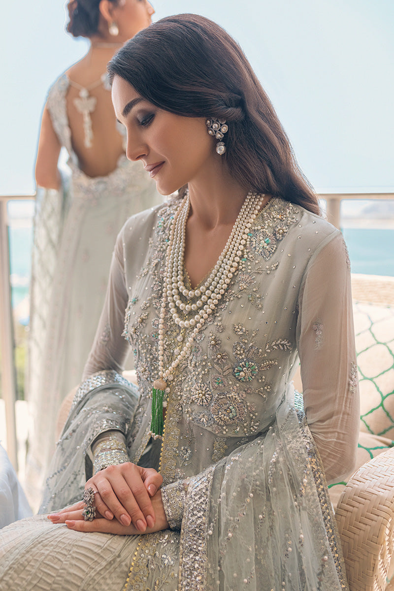 Fabric: Hand embellished front yoke on chiffon Hand embellished back yoke on chiffon Embroidered and sequinned panels on chiffon (2 for front, 1 for back) Embroidered and sequinned boti on chiffon for front, back and sleeves Embroidered and sequinned jaal for front and back on chiffon Embroidered and sequinned border 1 for front and back Embroidered and sequinned border 2 for front and back Embroidered and sequinned sleeves border Embroidered and sequinned finishing patti Embroidered and sequinned 3D flower for back yoke Sequinned and pearl embellished net dupatta Cotton silk under shirt Raw silk trouser Swarovski studded balls for front yoke Golden samosa lace for finishing |