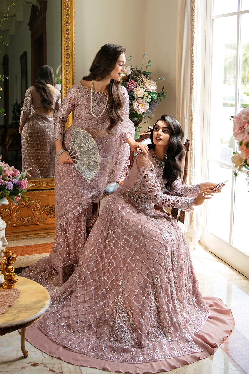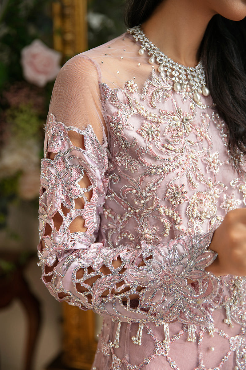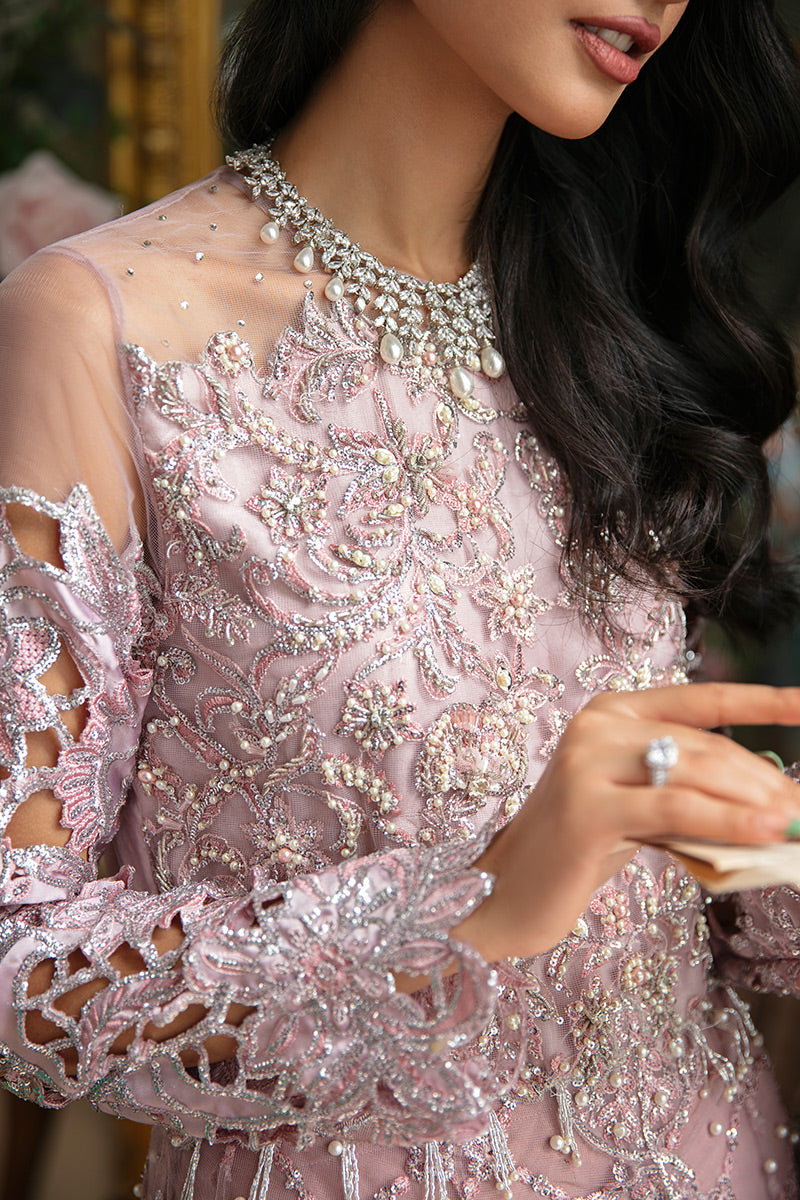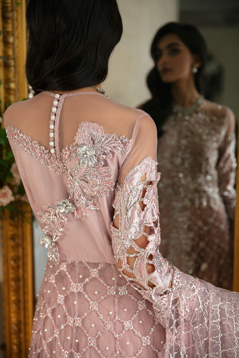 Fabric: Embroidered and pearl embellished front yoke (net) Embroidered and pearl embellished front and back for panels(net) Embroidered and pearl embellished front and back daman motifs (net) Embroidered and sequinned daman border (organza) Embroidered and pearl embellished finishing lace (organza) Embroidered and sequinned sleeves (silk) Dyed back yoke (net) Sequinned net dupatta Dyed raw silk trousers Dyed undershirt |