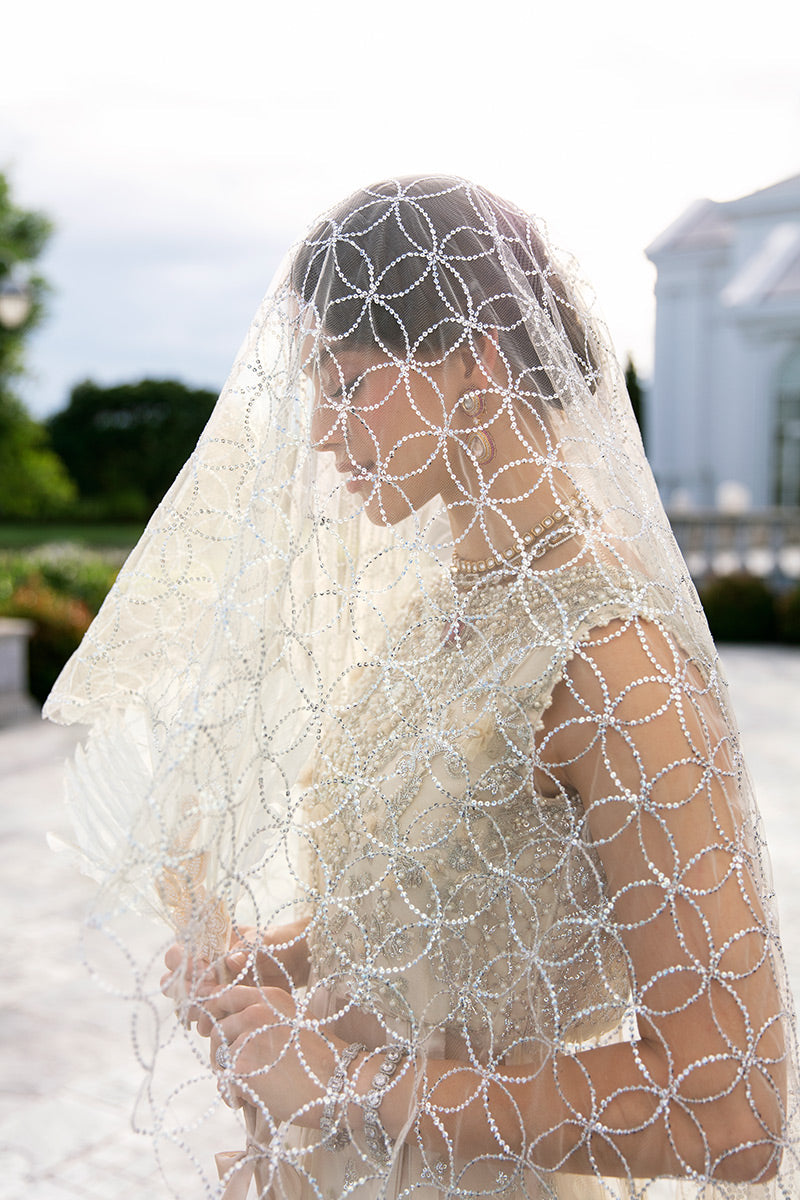 Fabric: Embroidered hand-embellished front yoke (net) Embroidered and sequinned back (net) Embroidered and sequinned back neckline (organza) Embroidered and pearl embellished front panels (net) Embroidered and sequinned back panels (net) Embroidered and sequinned net for sleeves Embroidered and sequinned daman border (organza) Sequinned net dupatta Dyed raw silk trousers Dyed Undershirt |