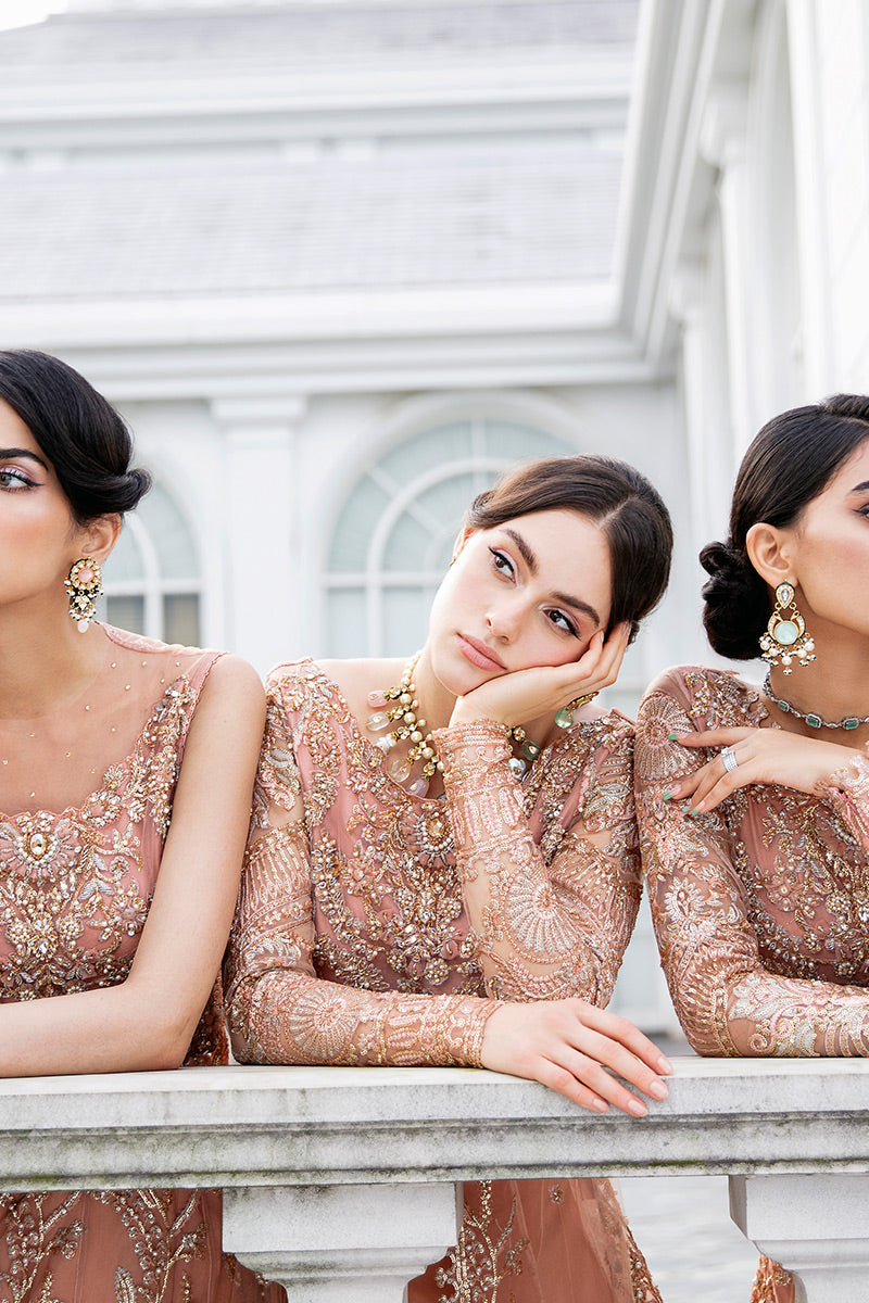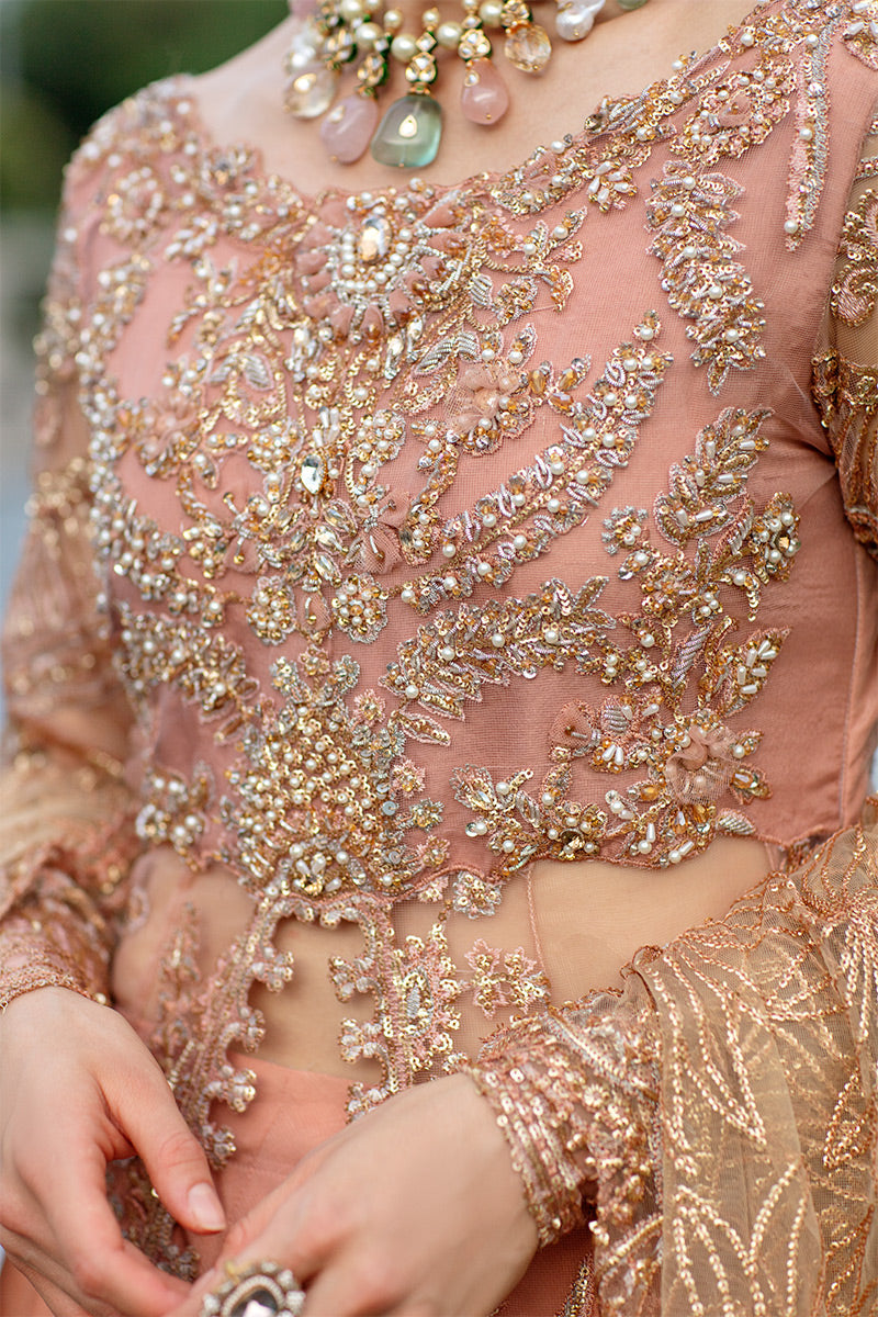Fabric: Embroidered hand-embellished front yoke (net) Embroidered hand embellished front panels (net) Embroidered and sequinned net for back panels Embroidered and sequinned sleeves (net) Embroidered and sequinned sleeves lace (organza) Embroidered and sequinned daman border (organza) Sequinned net dupatta Dyed raw silk trousers Dyed undershirt |