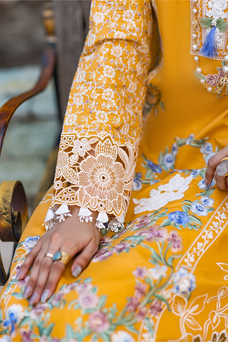 Elevate your wardrobe with the luxurious charm of Milano Moda, now available in a captivating mustard yellow hue. Crafted with meticulous attention to detail, this ensemble features intricate embroidery adorning both the front and back panels, exuding timeless elegance from every angle. The embroidered lawn sleeves add a touch of sophistication, seamlessly blending tradition with contemporary flair.