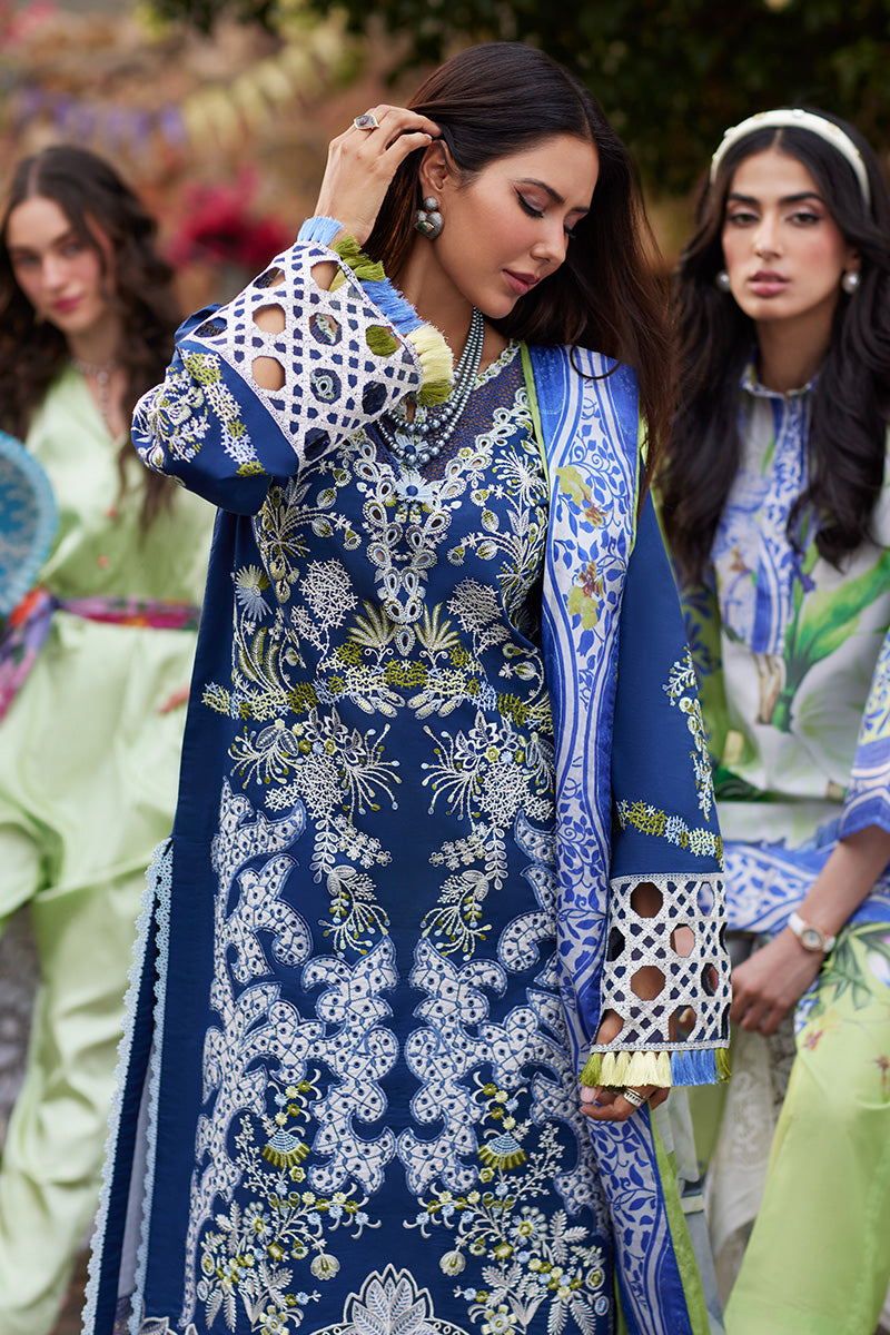 Fabric: ""Modena Magic"" in mesmerizing blue, where elegance meets allure in every stitch. The chikan embroidered front and back exude an air of refinement, while the appliqued lawn back adds depth and texture to the ensemble. Adding to its allure is the digital print pure silk dupatta, featuring a captivating design that complements the intricate embroidery perfectly. Package Content: -Chikan embroidered & appliqued lawn front -Chikan embroidered & appliqued lawn back -Embroidered lawn sleeves -Chikan embroidered front and back border (organza) -Embroidered sleeves border (organza) -Embroidered trouser lace (organza) -Digital print pure silk dupatta -Print cotton trouser -Crochet lace for neckline Crochet lace for side slit -Embellished tassels for neckline -Embellished tassels for sleeves |