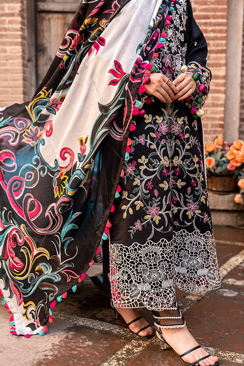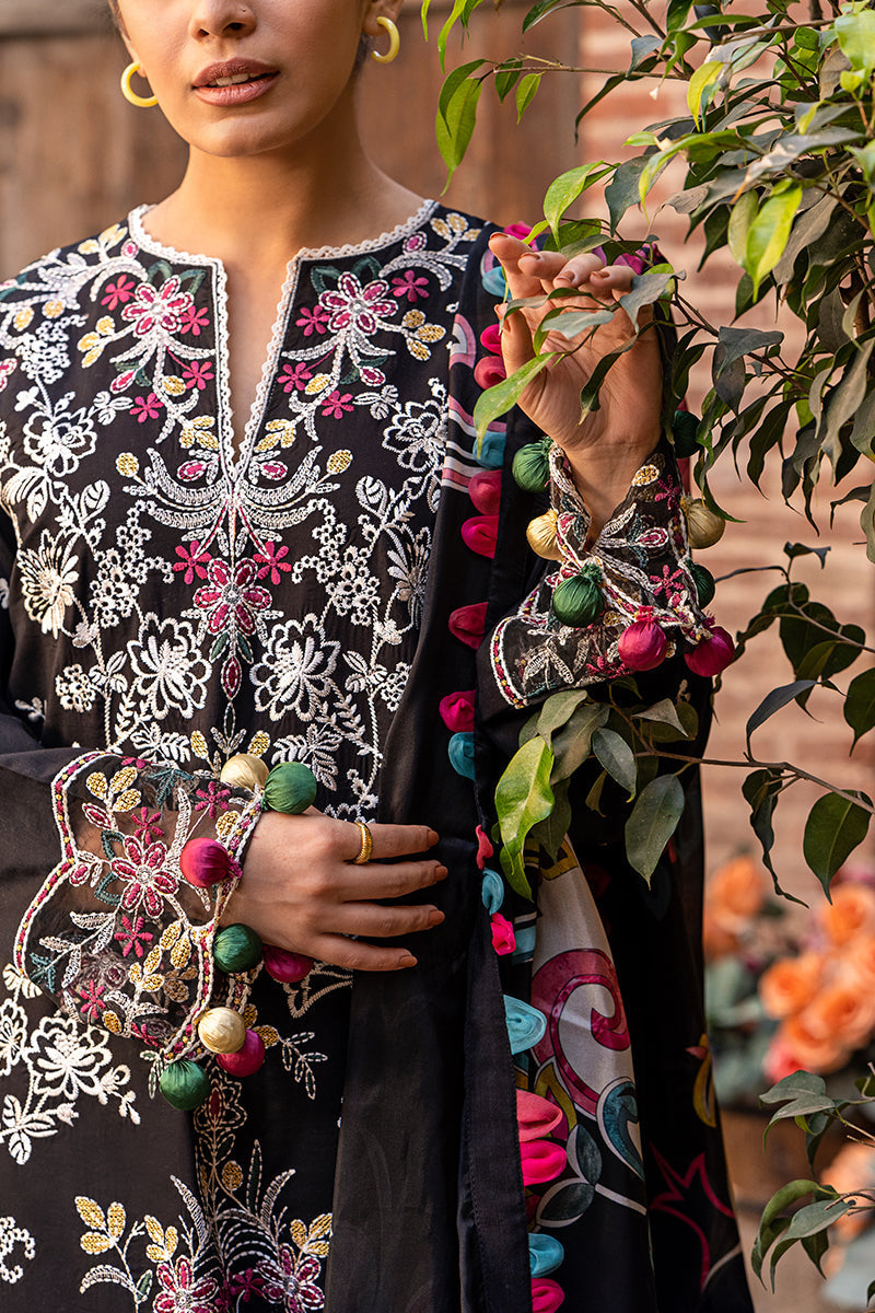 Fabric: Donatella: ""Black never goes out of style, especially during the warmer months. This intricately embroidered shirt paired with a digital print silk dupatta is the perfect blend of classic and modern."" Embroidered lawn front Embroidered lawn back Embroidered lawn sleeves Chikan embroidered daman border Embroidered sleeves border Crochet lace for side slits and neckline Silk ball for sleeve Digital print silk dupatta Dyed cotton trouser |